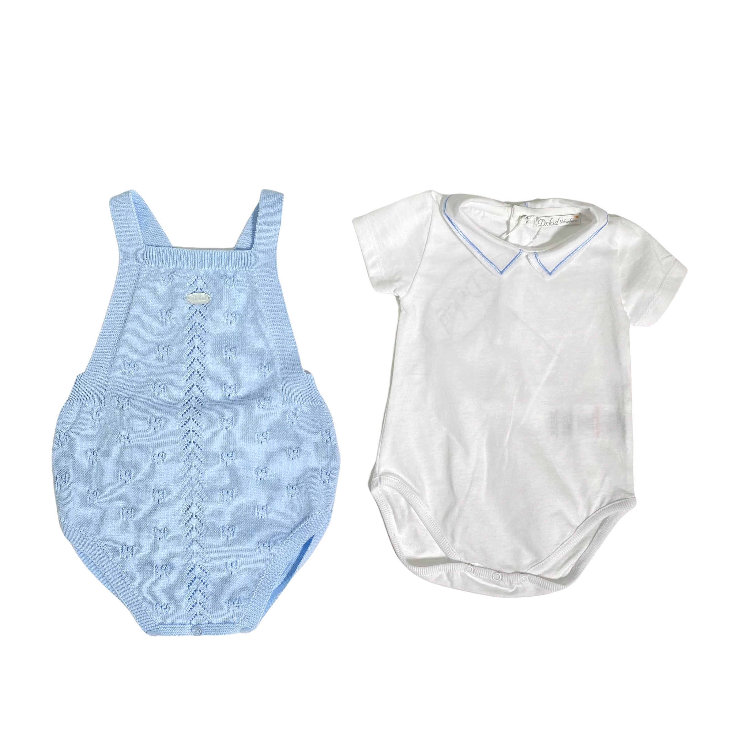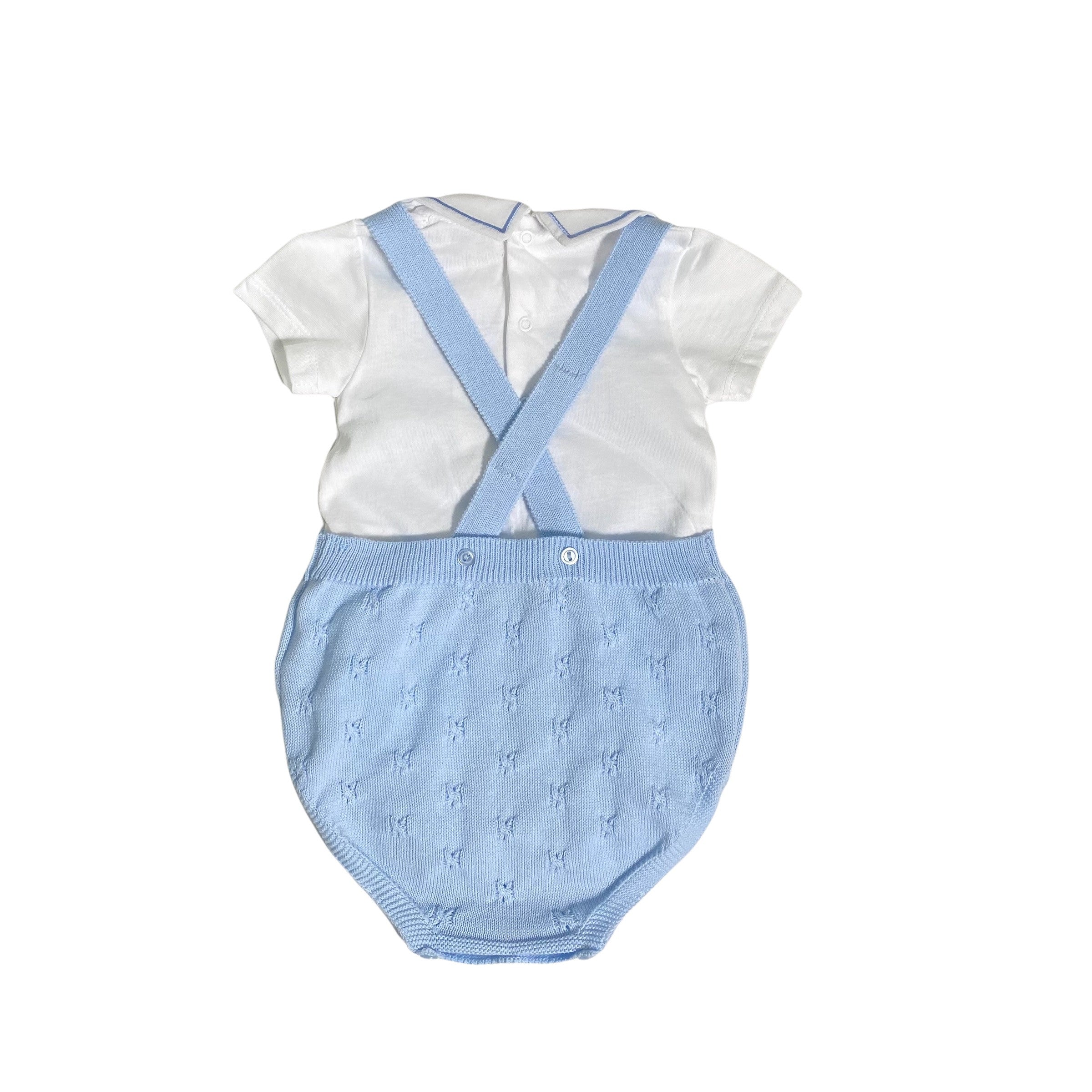 Pagliaccetto in filo di cotone, in tinta unita celeste, con body in cotone bianco.