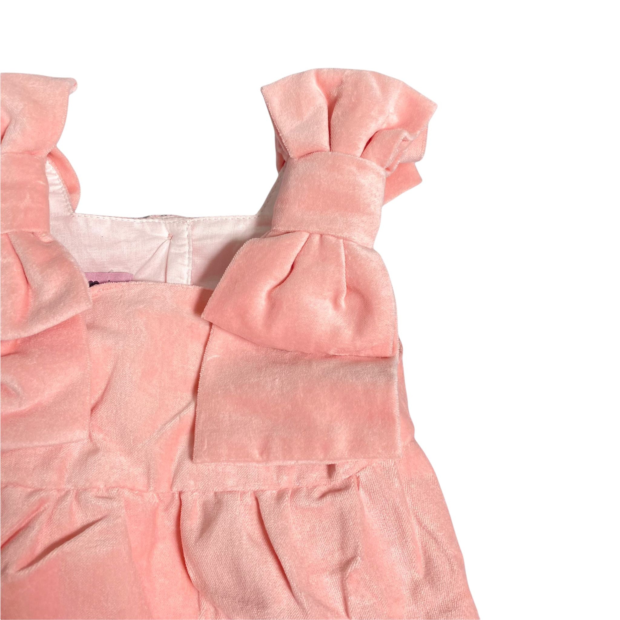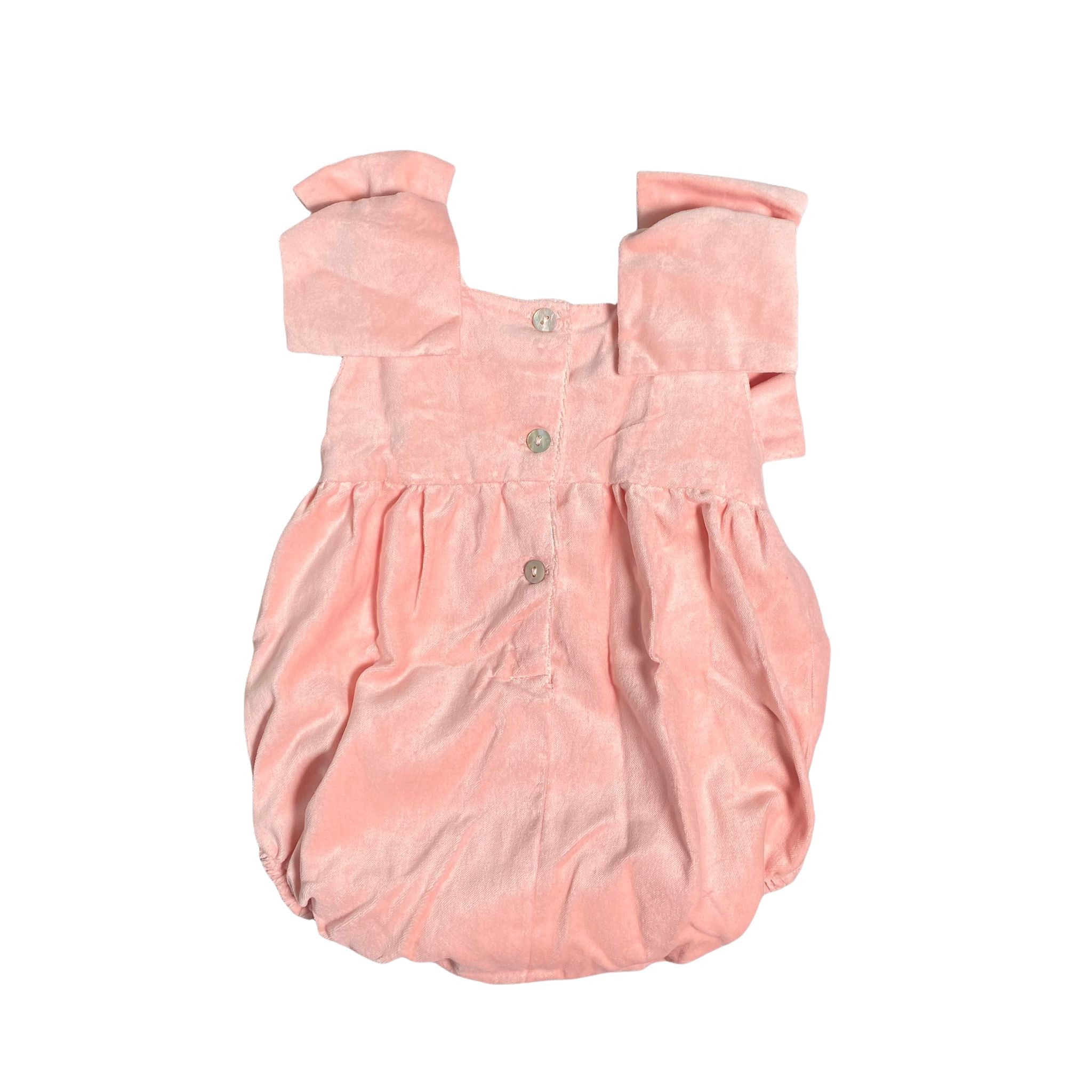 Pagliaccetto Intero Neonata In Velluto Rosa ,rifinito sulle spalle da fiocchettoni ,apertura sul retro e sotto con bottoni in madreperla
