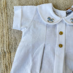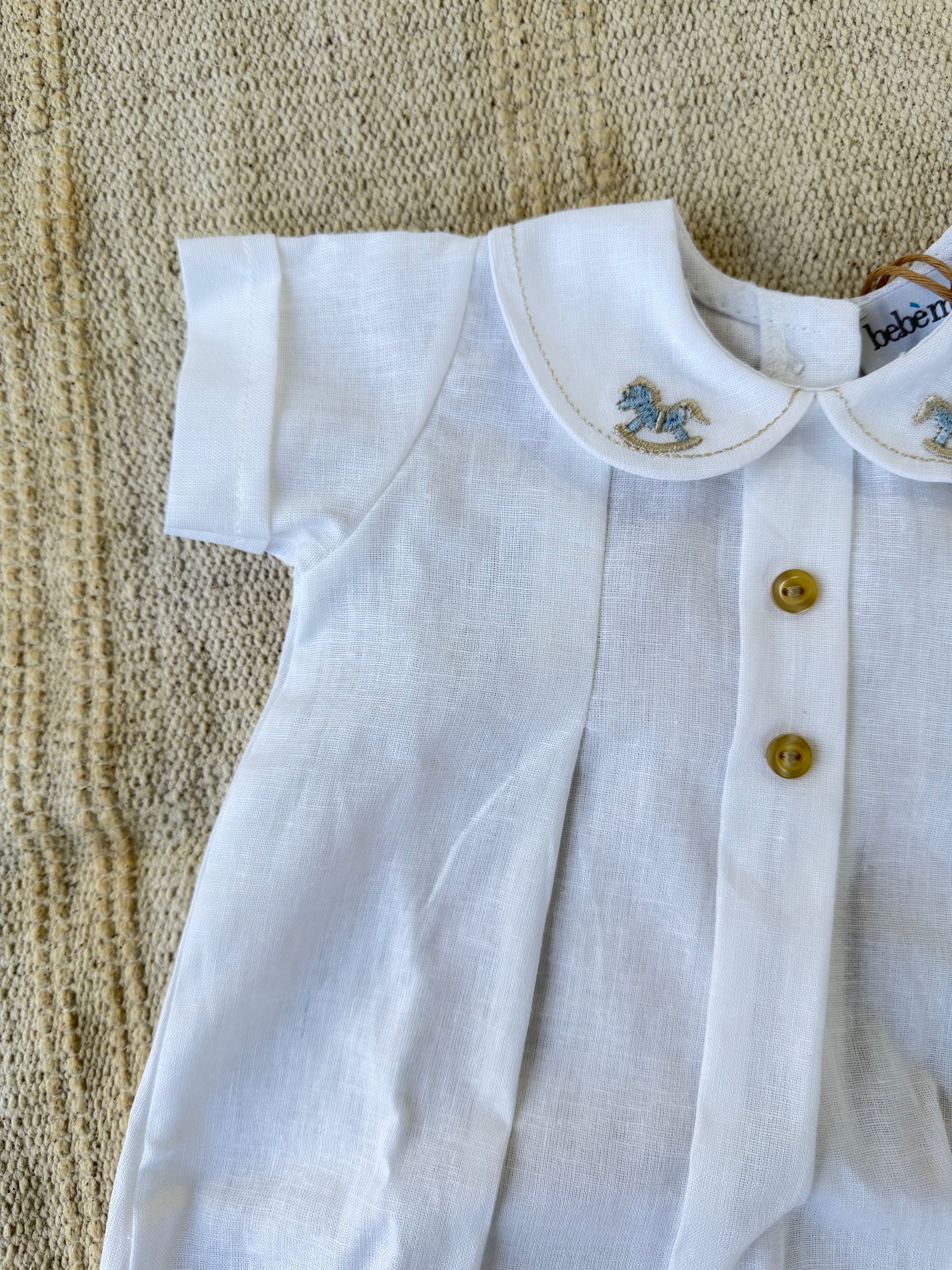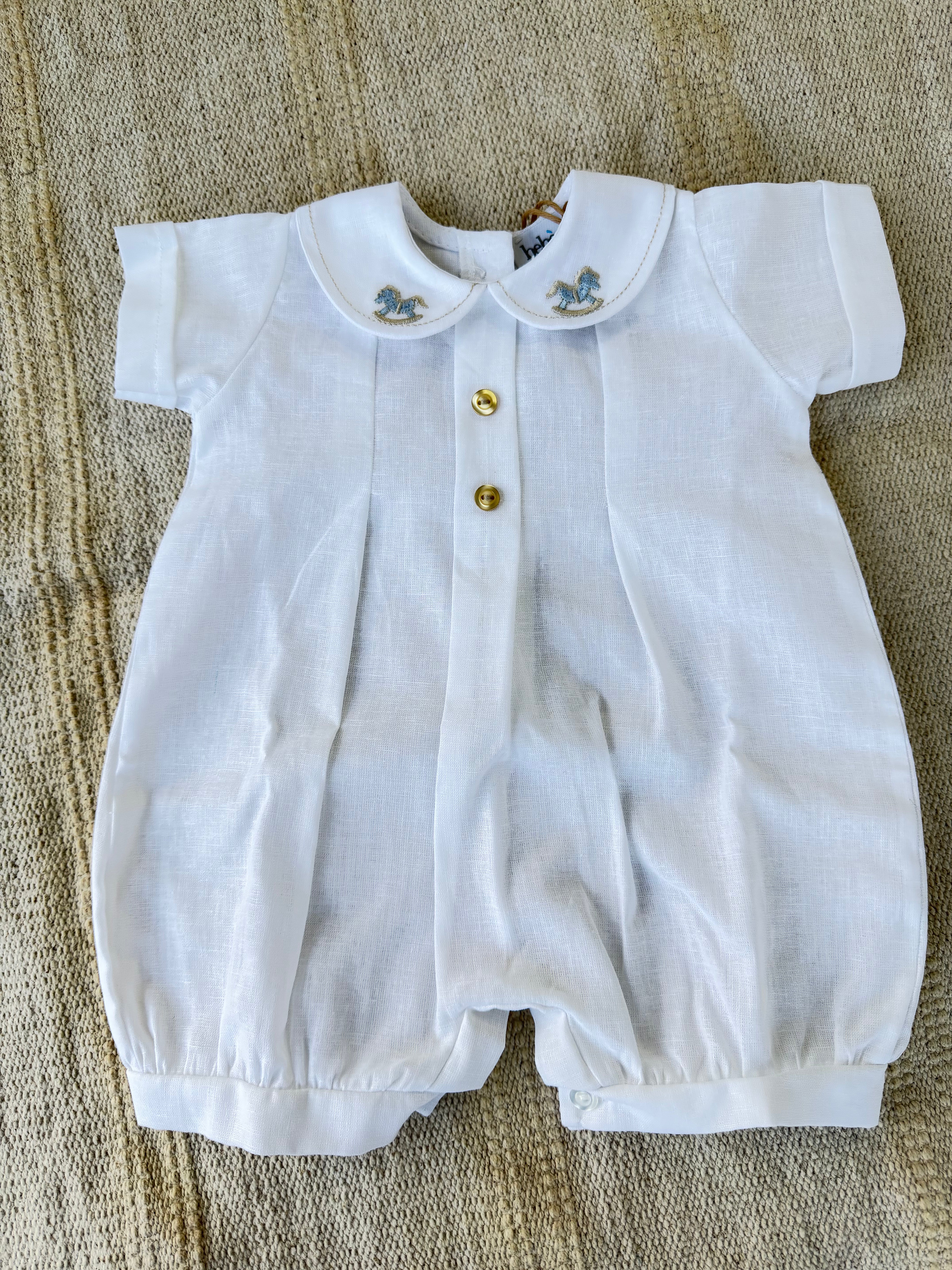 Delicato pagliaccetto in misto lino per neonati, perfetto per la stagione primaverile ed estiva. Il capo presenta maniche a mezza lunghezza che garantiscono comfort e libertà di movimento. Dettaglio esclusivo: ricamo di cavalluccio a dondolo sul colletto, che aggiunge un tocco di eleganza e dolcezza al design. Realizzato con materiali di qualità, ideale per la pelle sensibile del neonato. Un capo versatile da indossare in molteplici occasioni.