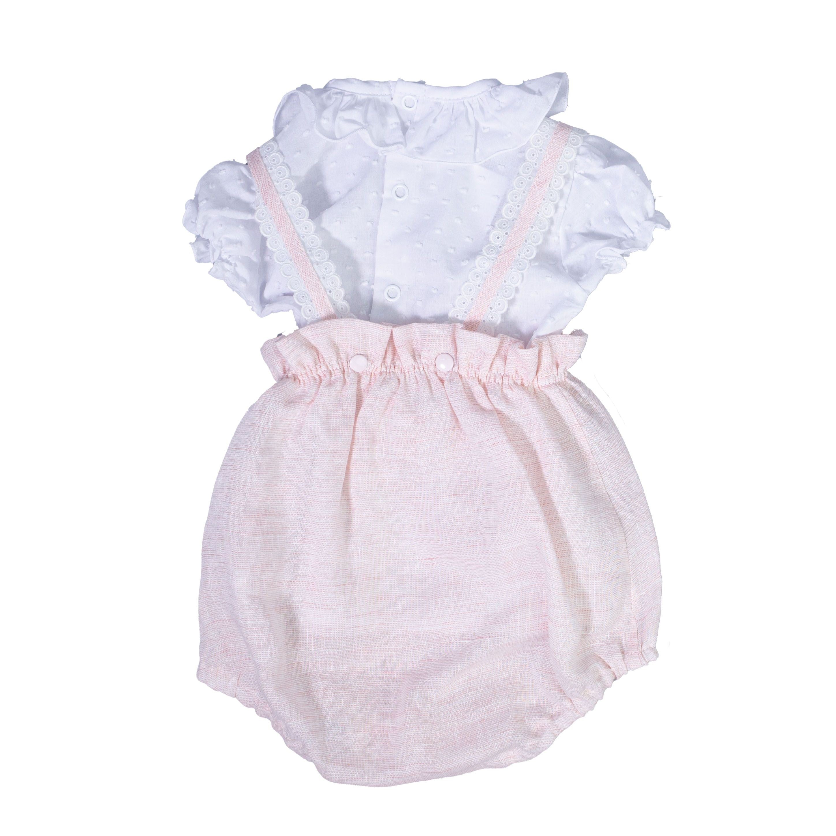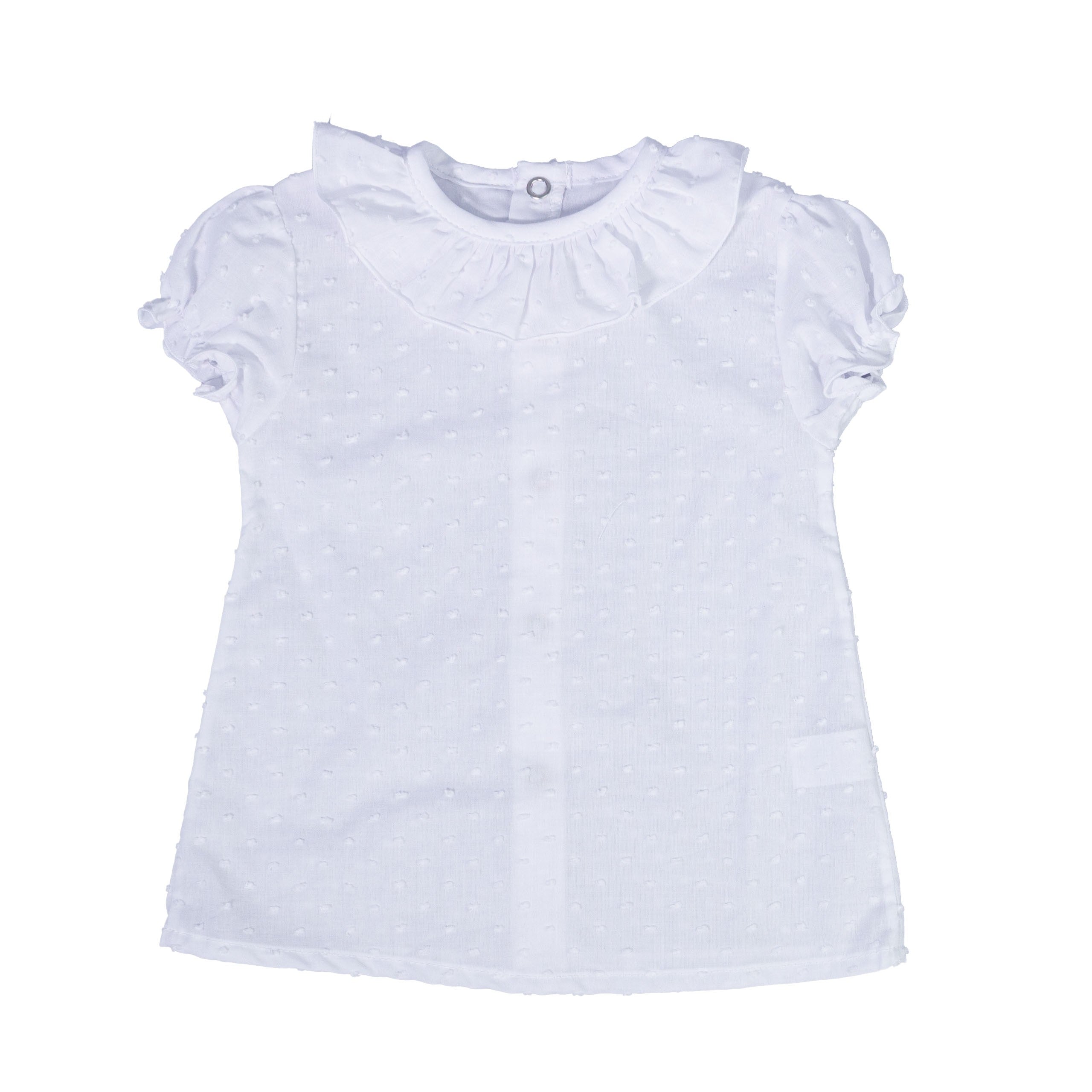 Pagliaccetto Modello Salopette Composto Da Camicia Bianca in Plumetis Con Rouche Sul Collo.