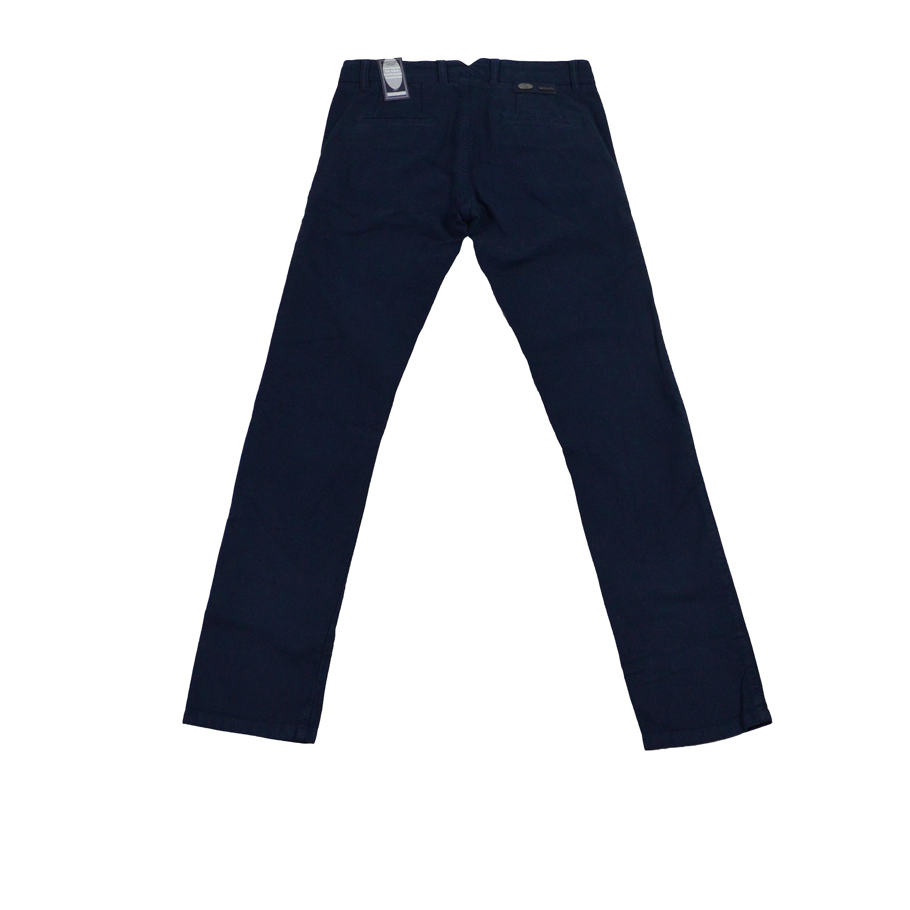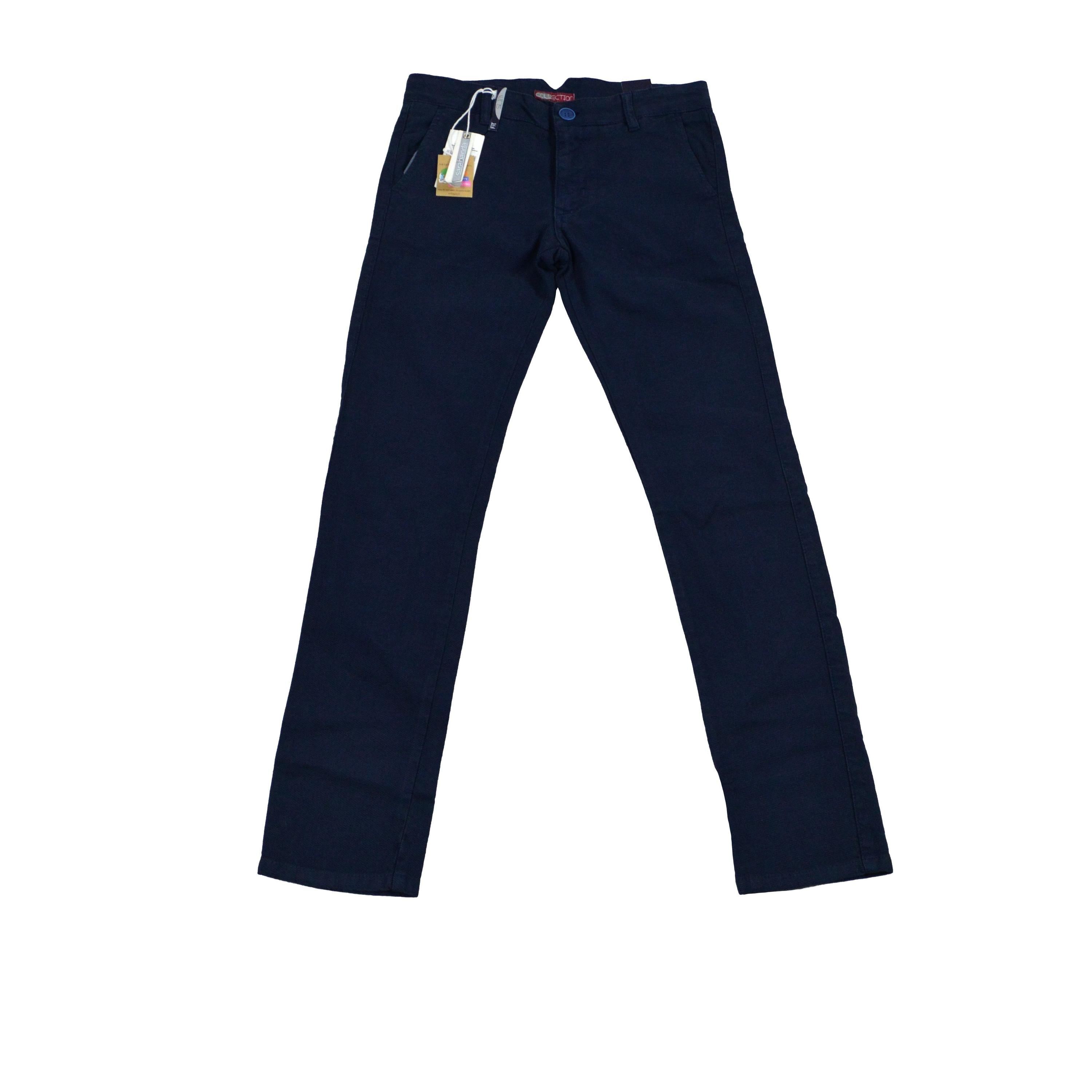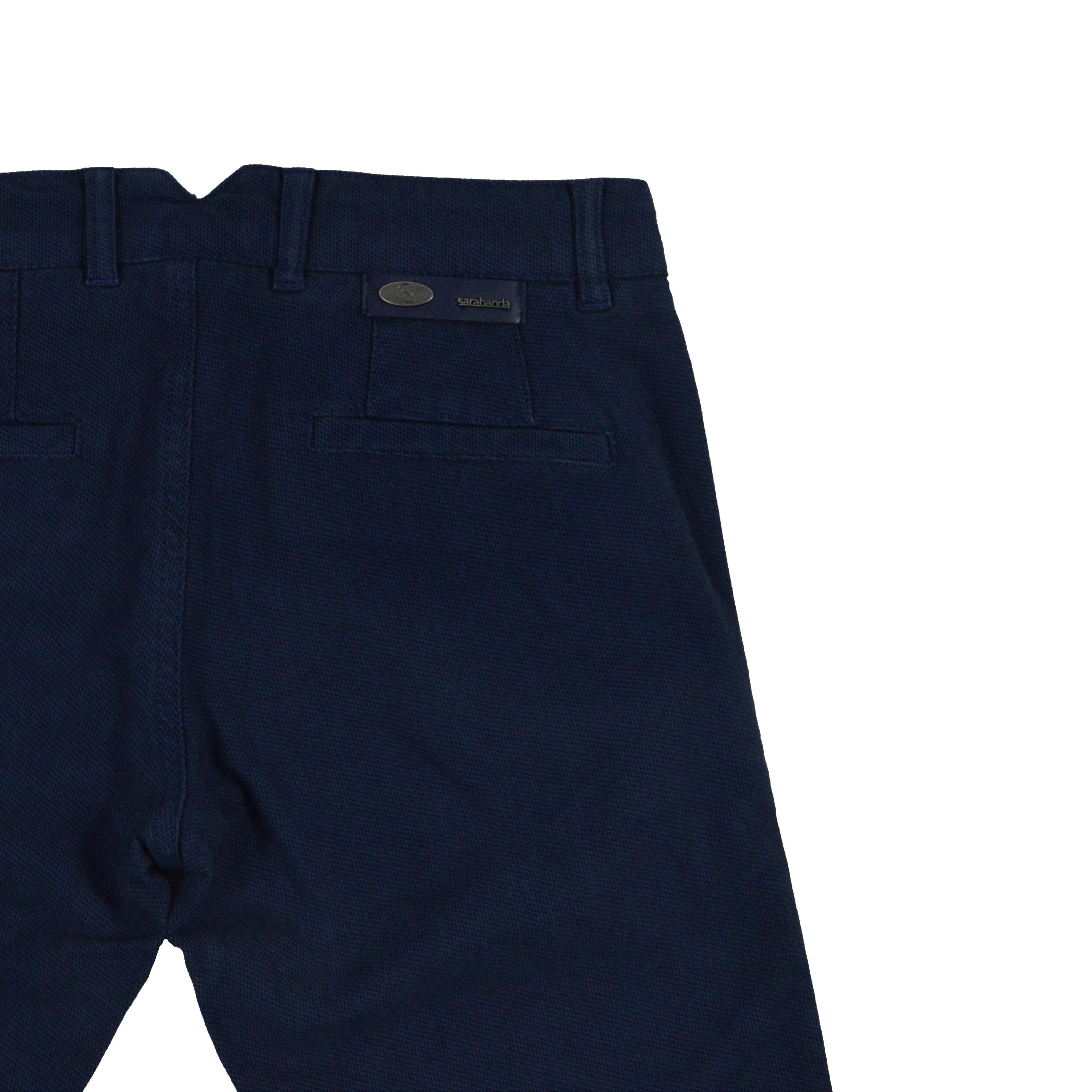 Pantalone in cotone blu in tinta unita efetto nido d'ape con tasche america ed elastico all'interno che permette di regolare la vestibilità