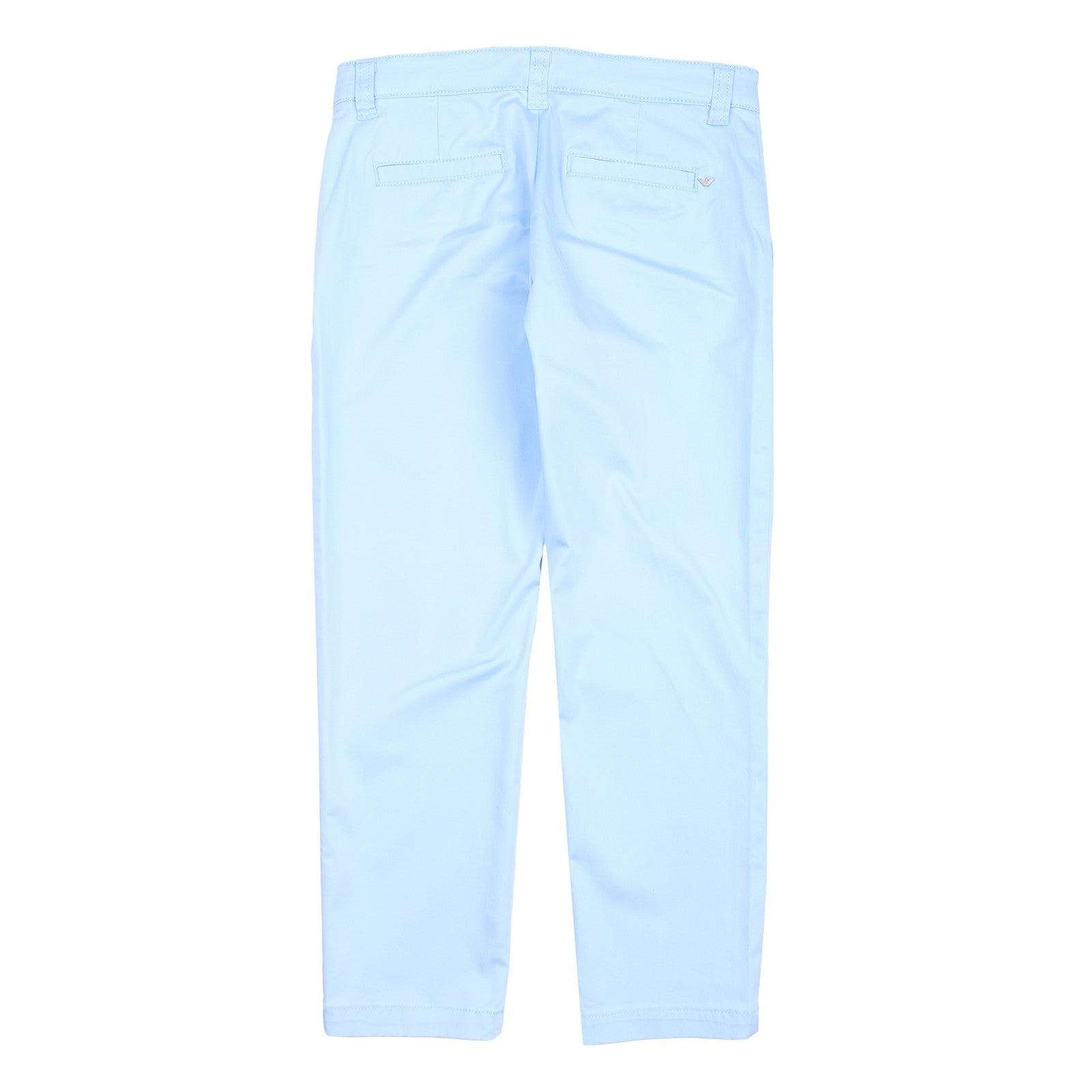 Adatto per le occasioni più formali ed eleganti, il pantalone Armani in questo bellissimo celeste è freschissimo, modello sigaretta con tasca posteriore finta e tasche anteriori con loghetto Armani e elastico interno regolabile