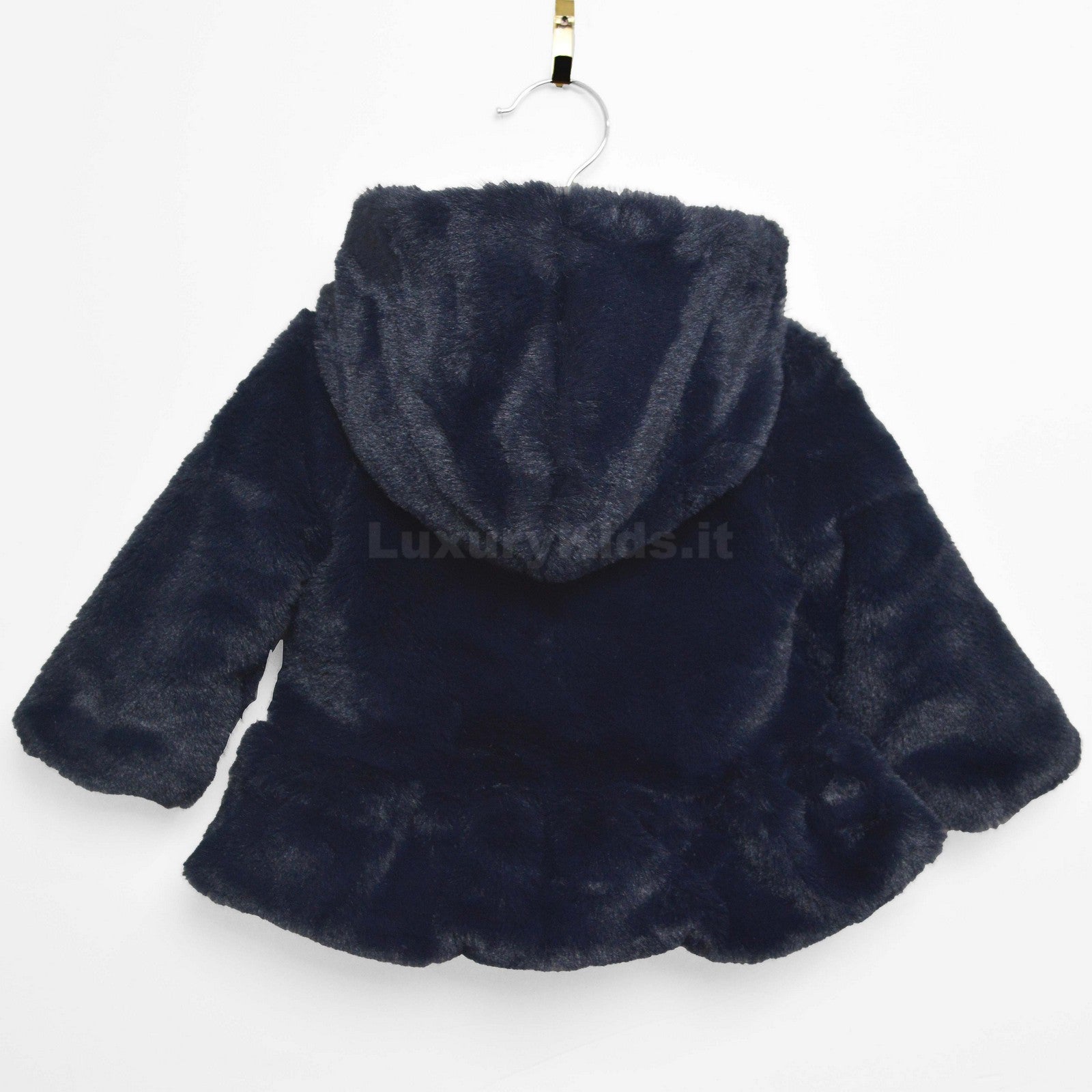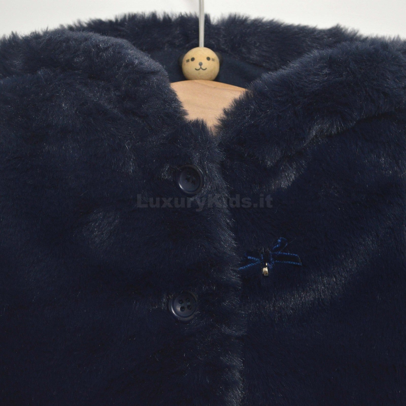 Pellicciotto con cappuccio ecologico blu in tinta unita con doppio petto e fiocchettino in velluto con punto luce applicati sul petto