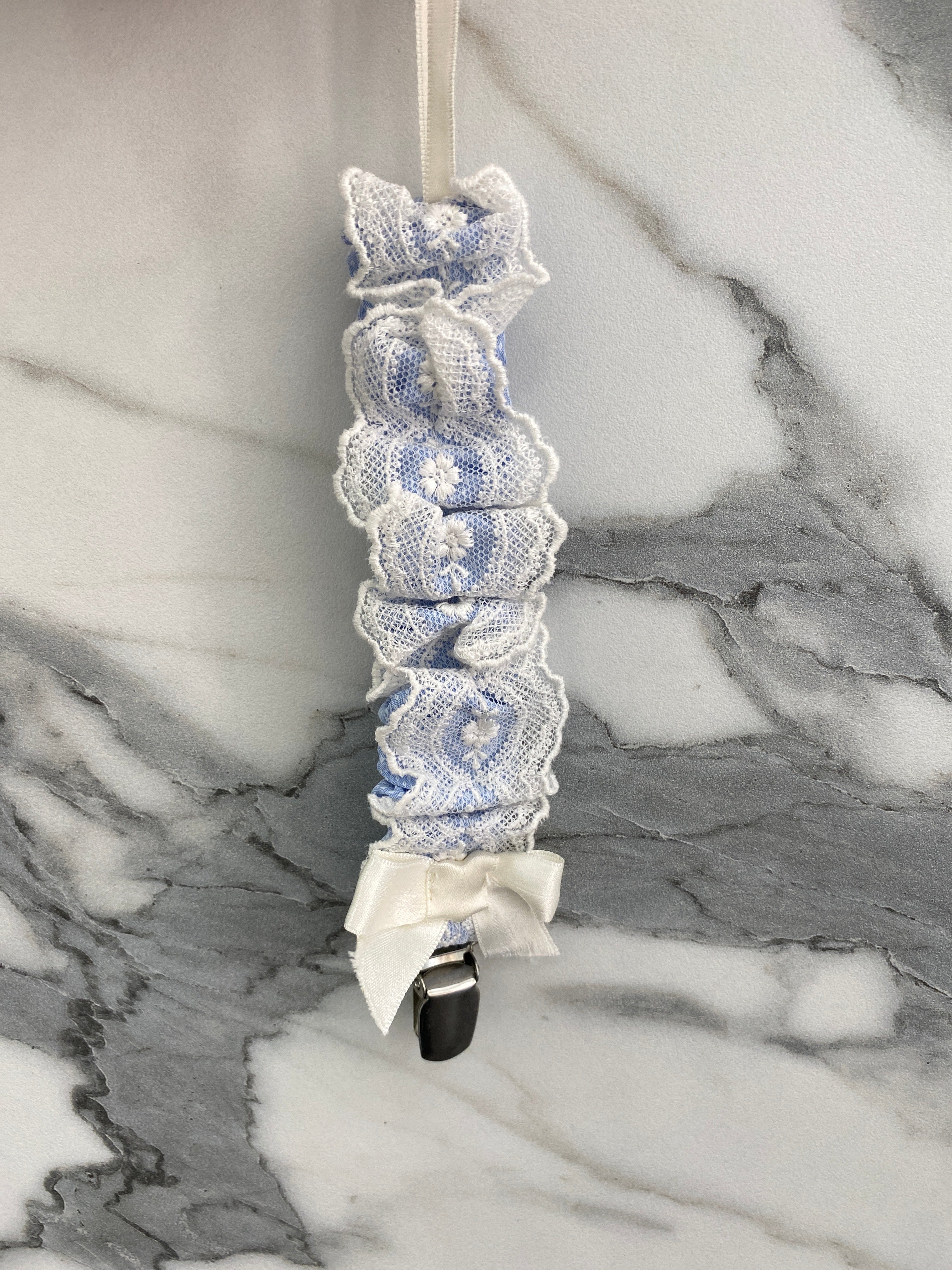 Celeste con una ruches in pizzo bianca, con un bellissimo fiocchettino panna in raso