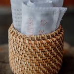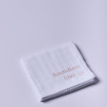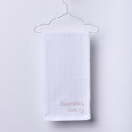 Quadrato di garza in fresco cotone con scritta "Boundless Love" ricamata per lui e lei e bordino rifinito con ricamo.