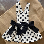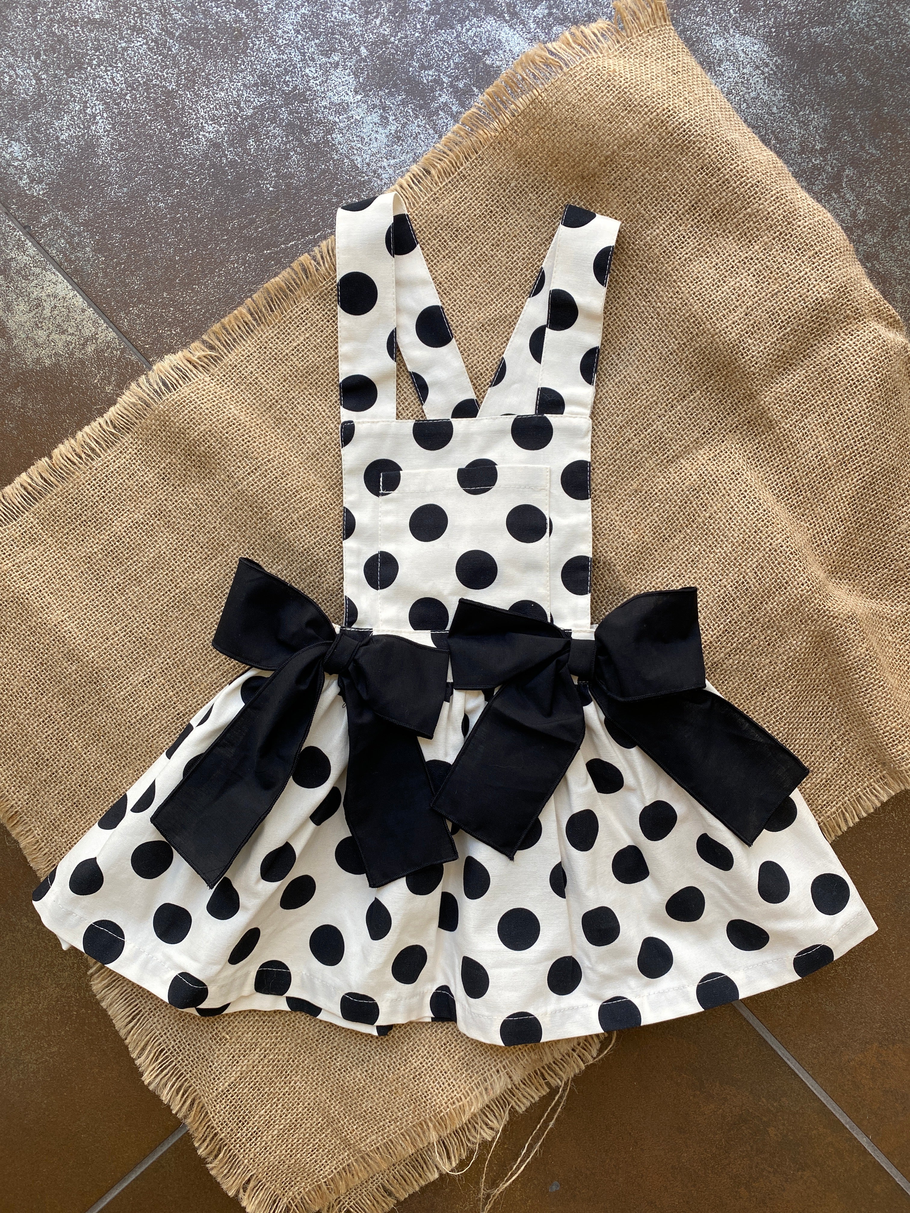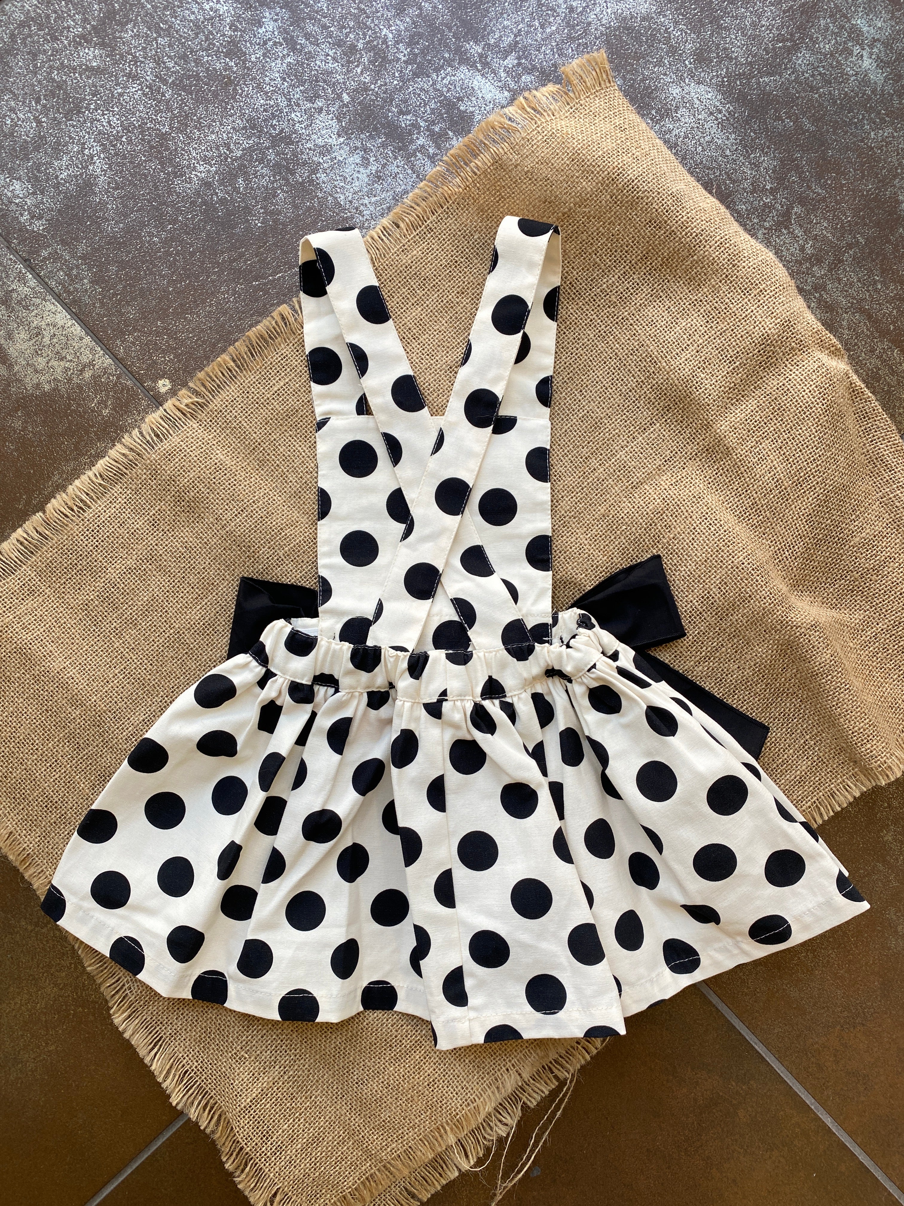 Salopette a gonna con fantasia poise (base bianca e poise nero) in cotone.