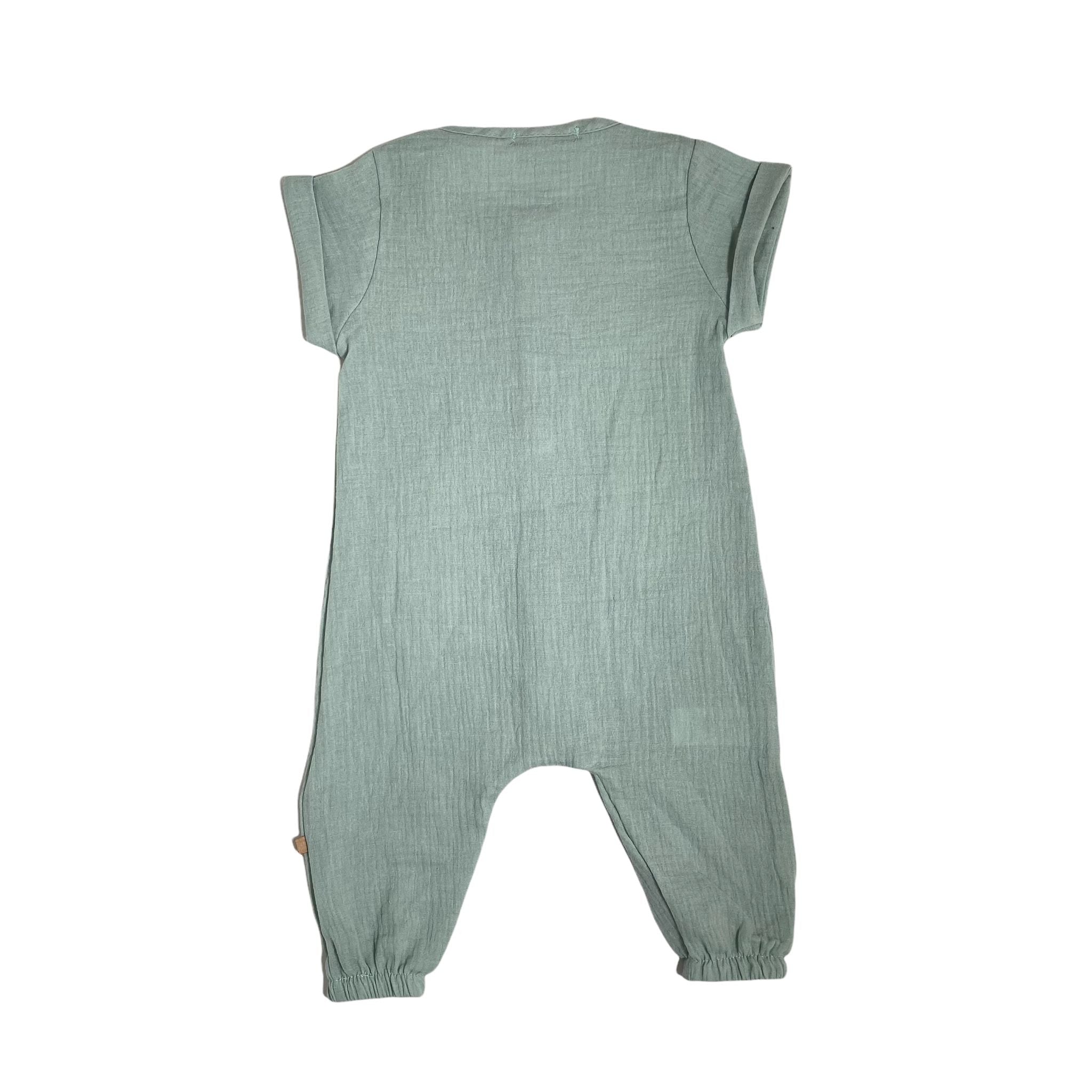 Salopette in garza di cotone con cavallo basso, in tinta unita verde, con apertura con bottoni in legno sul davanti.