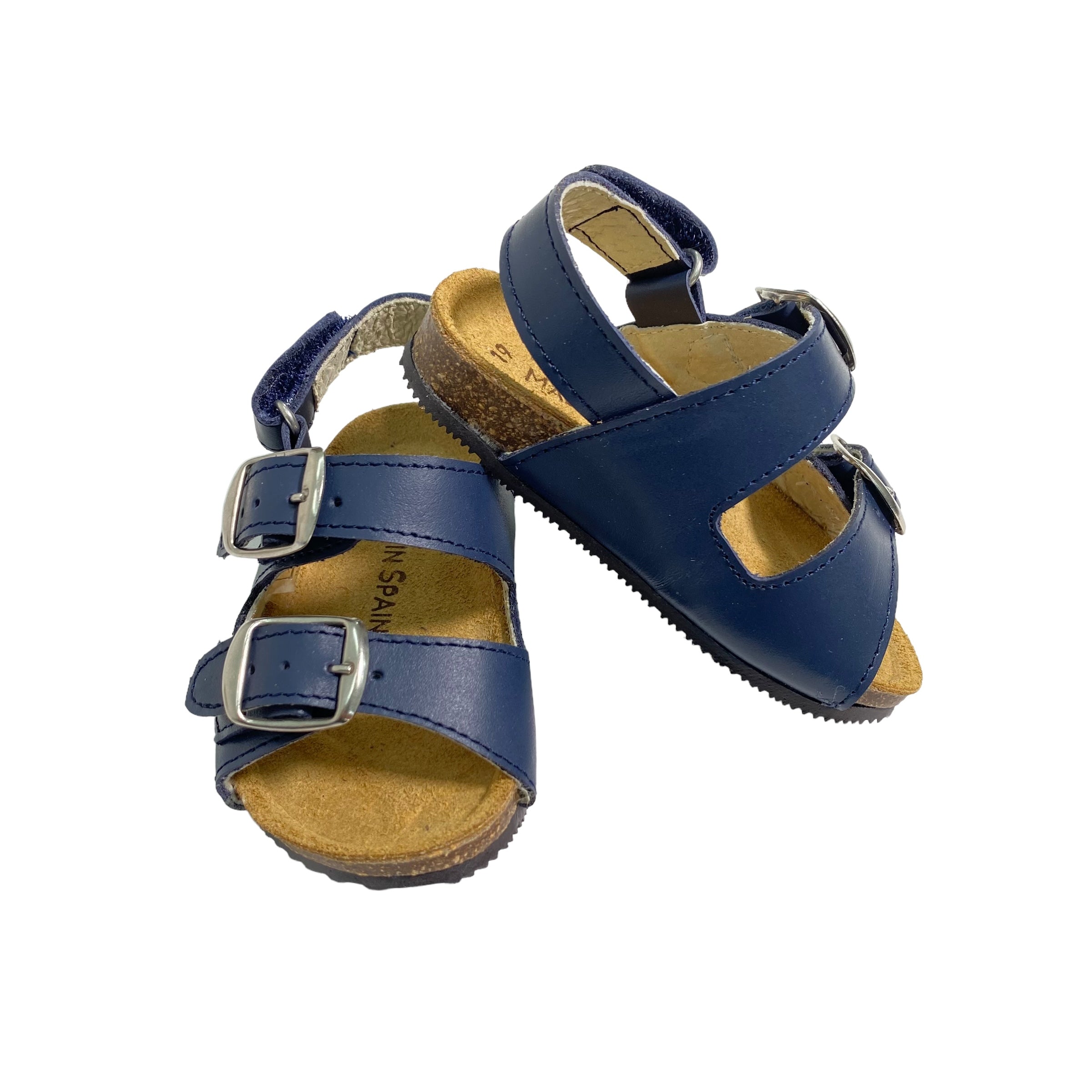 Sandali primi passi in pelle, con fibie regolabili e suola in gomma.