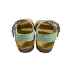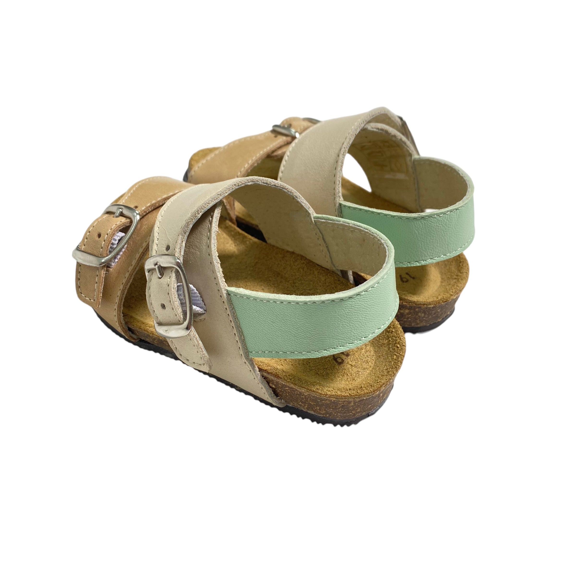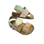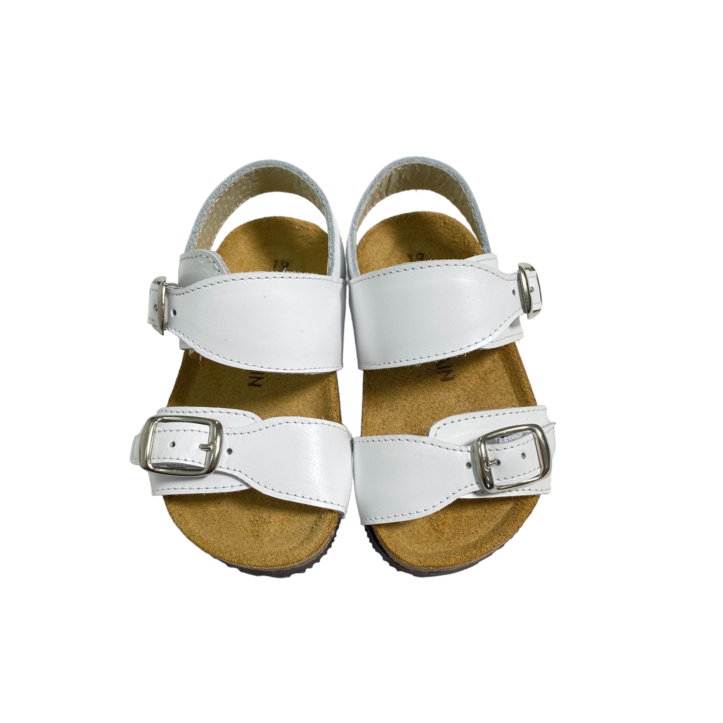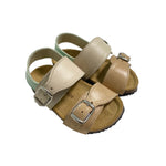 Sandali primi passi in pelle, con fibie regolabili e suola in gomma.