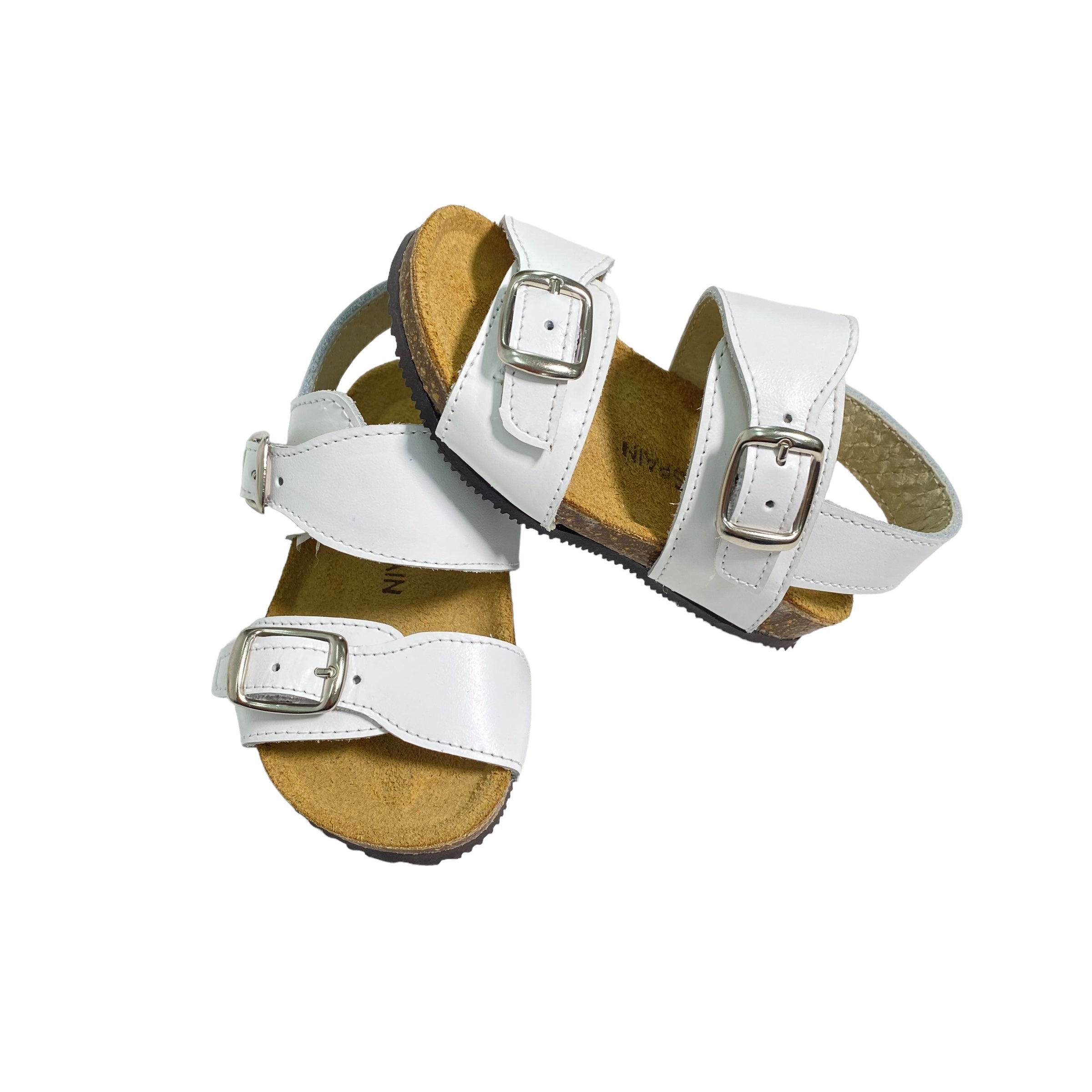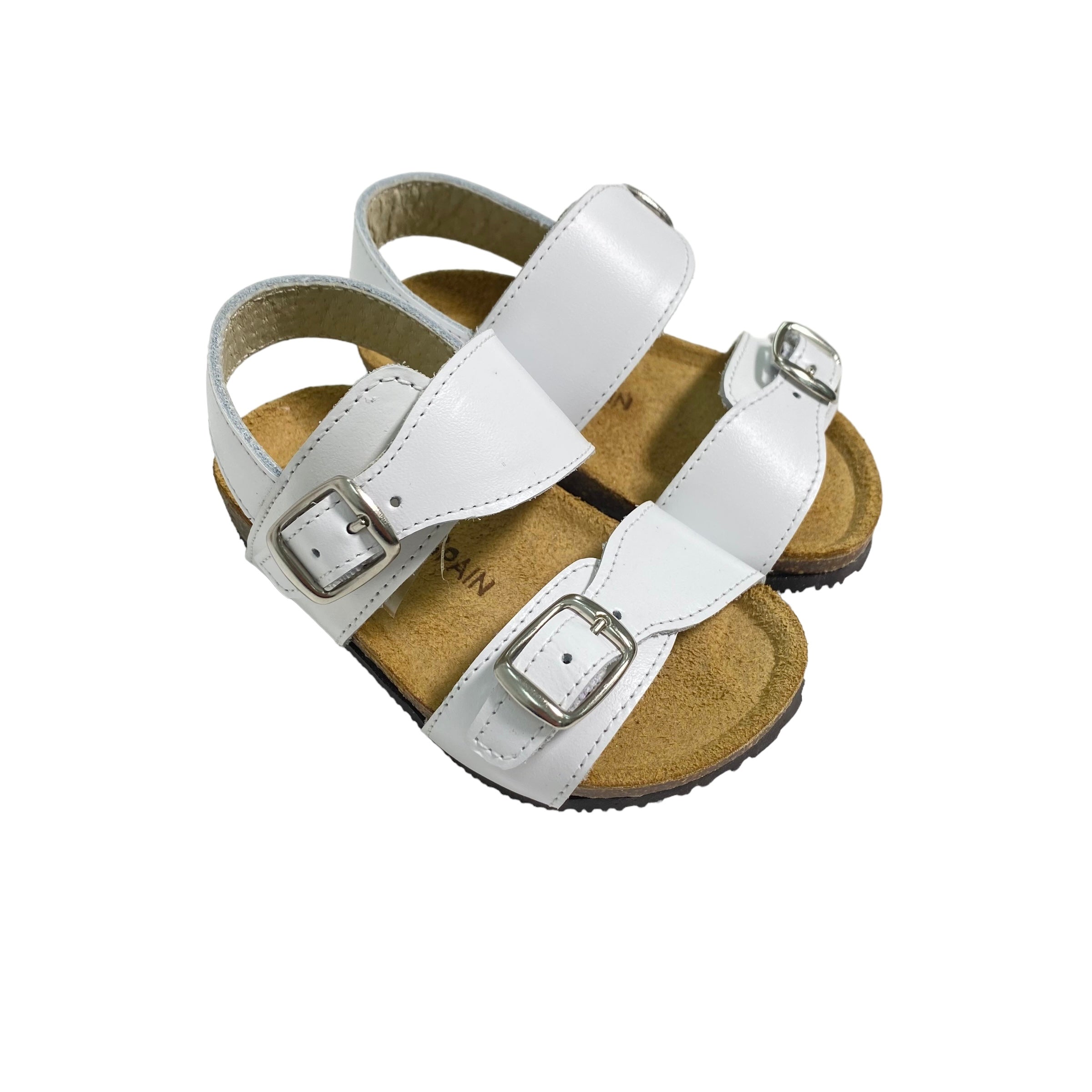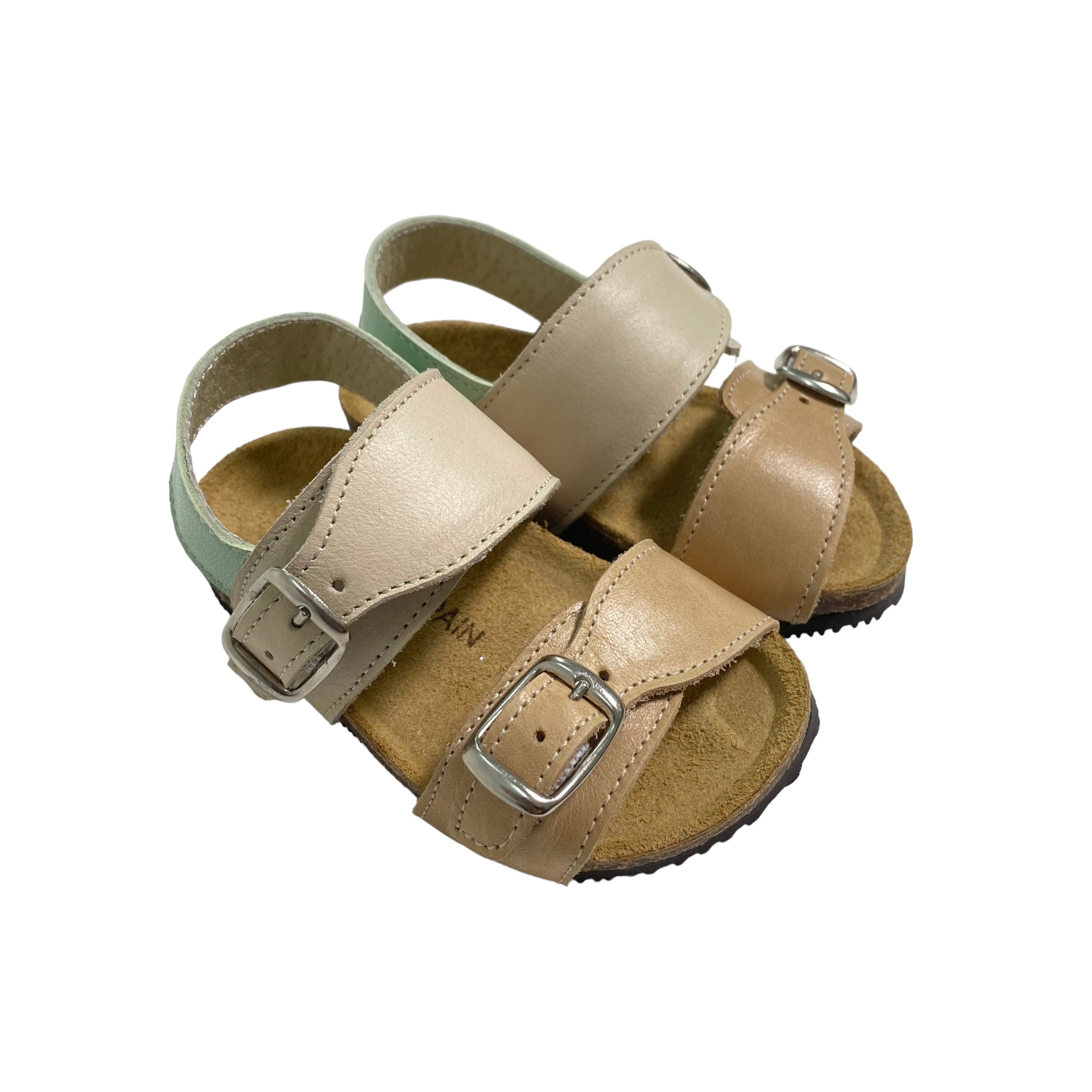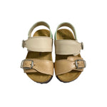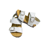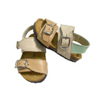 Sandali primi passi in pelle, con fibie regolabili e suola in gomma.
