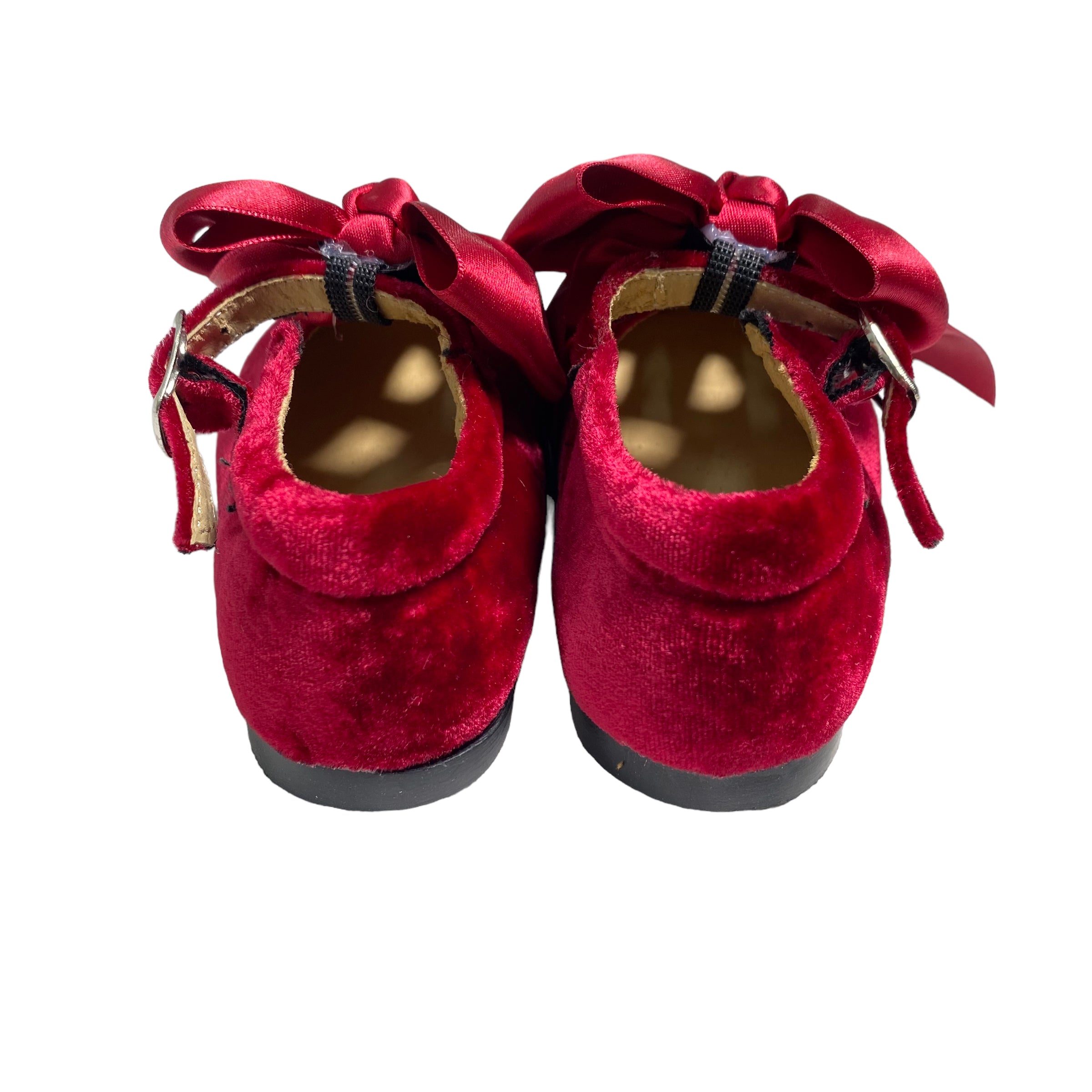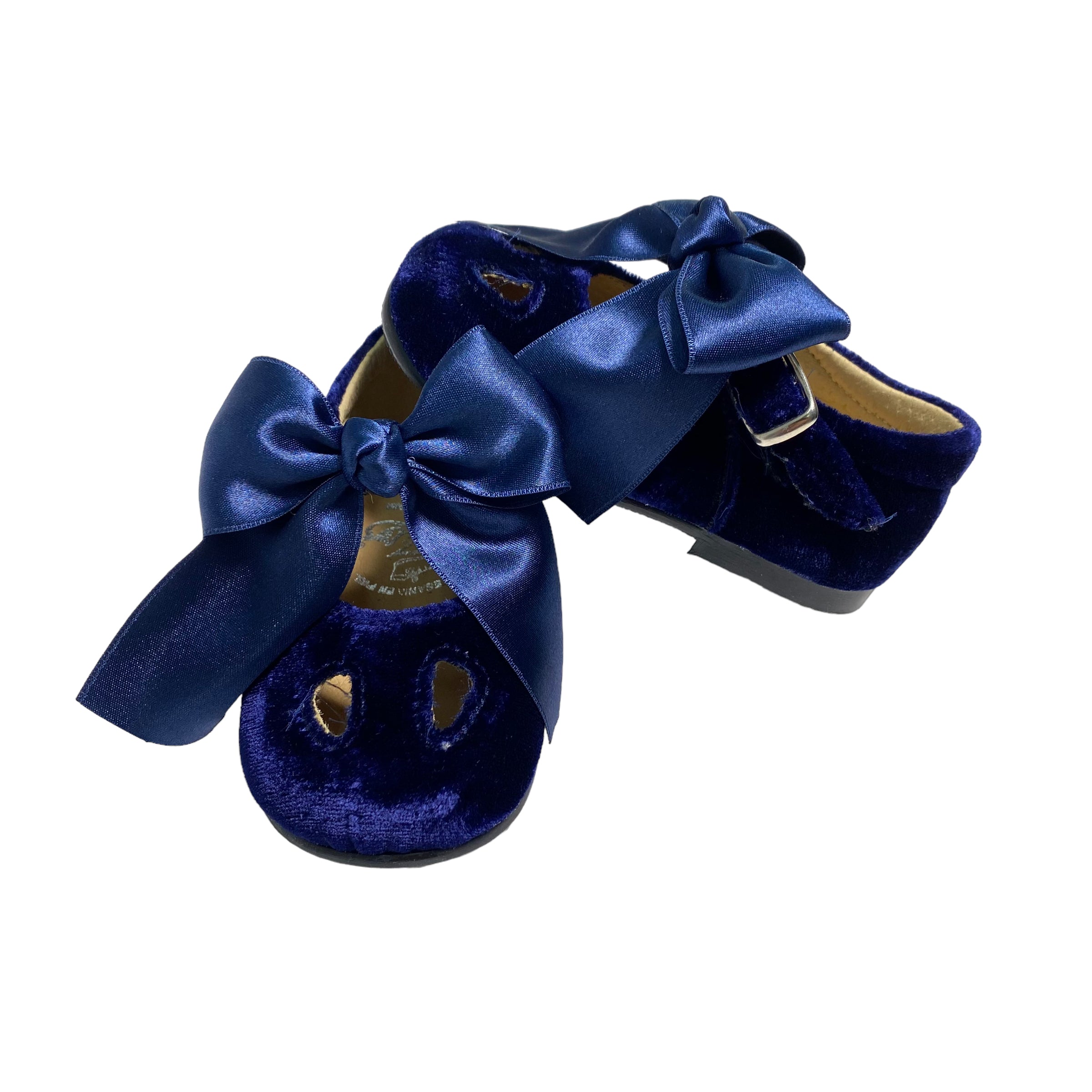 Scarpe in velluto, con occhielli e fiocco removibile, chiusura con cinturino.
