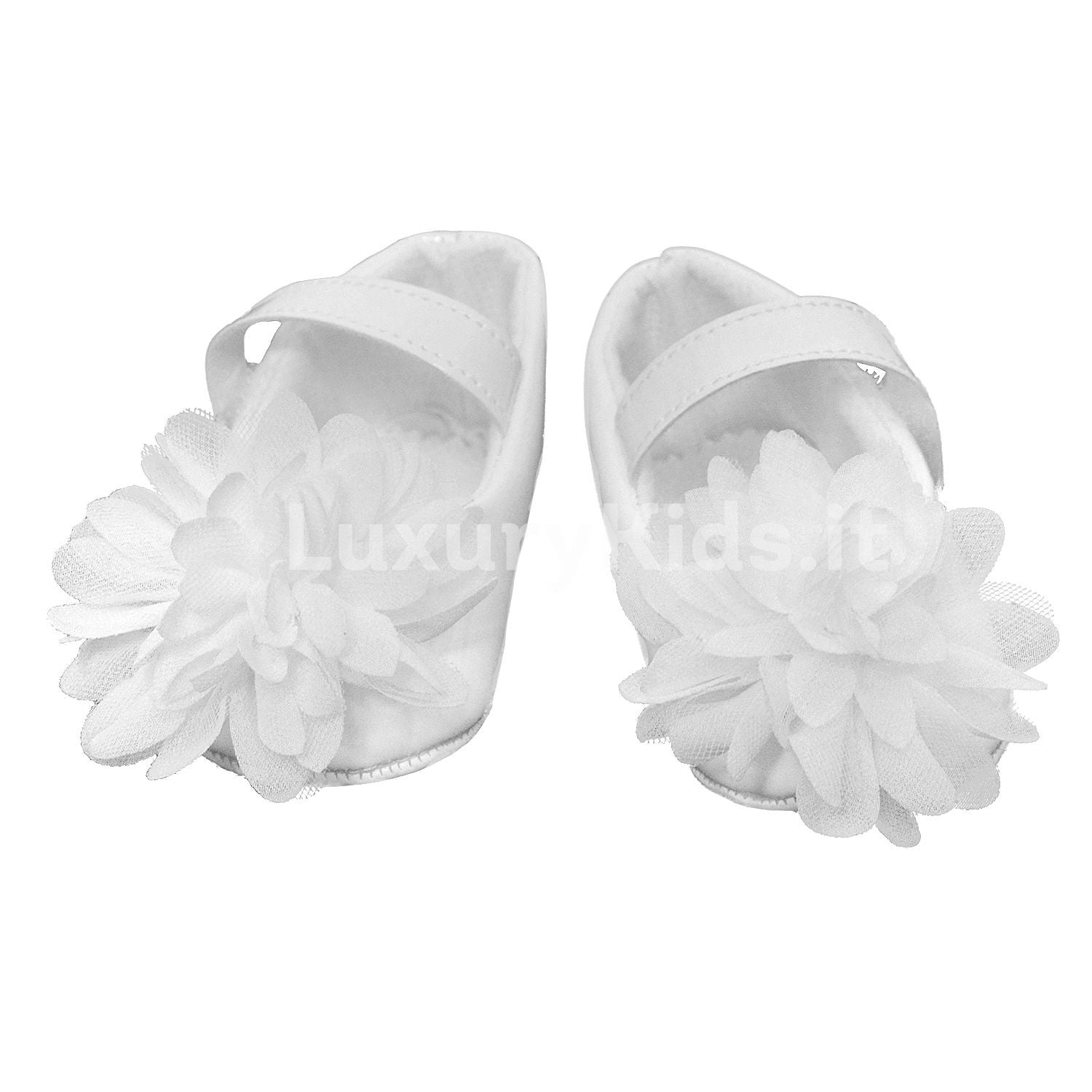 -Scarpine da culla ballerina in vernice bianche con applicazione di fiori di tulle bianchi rimovibili con strappo