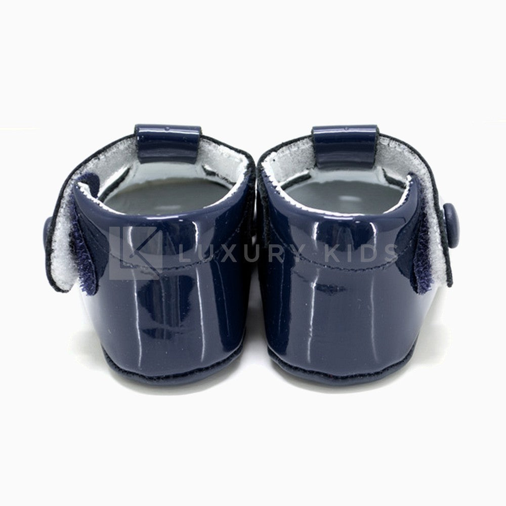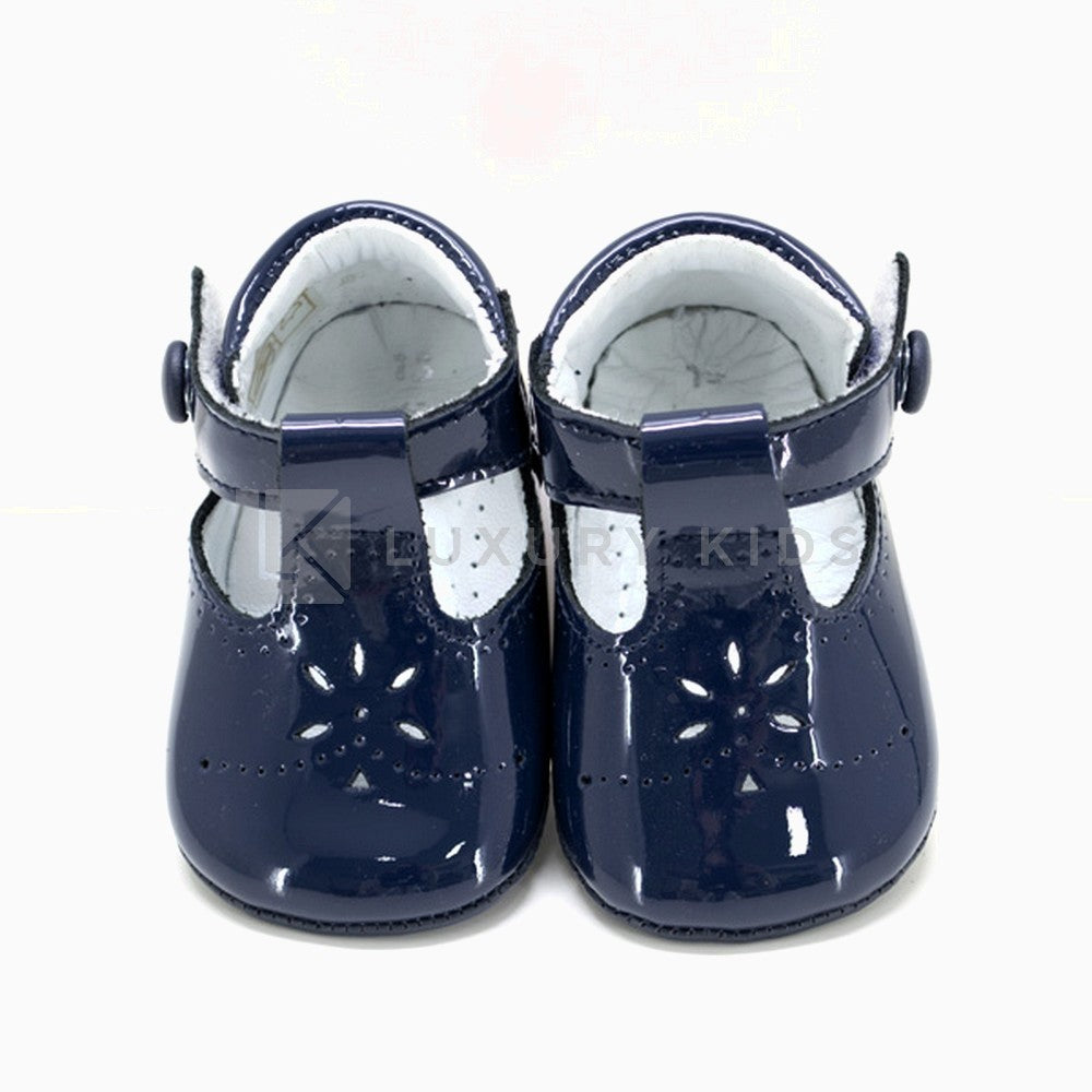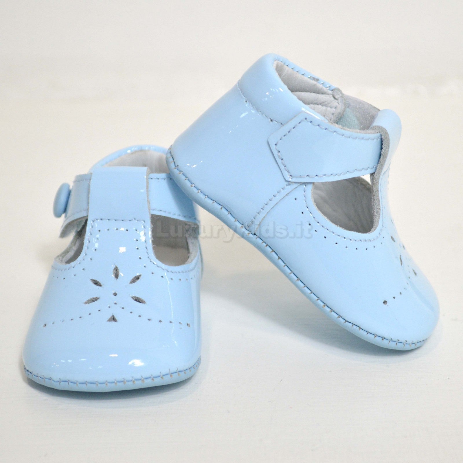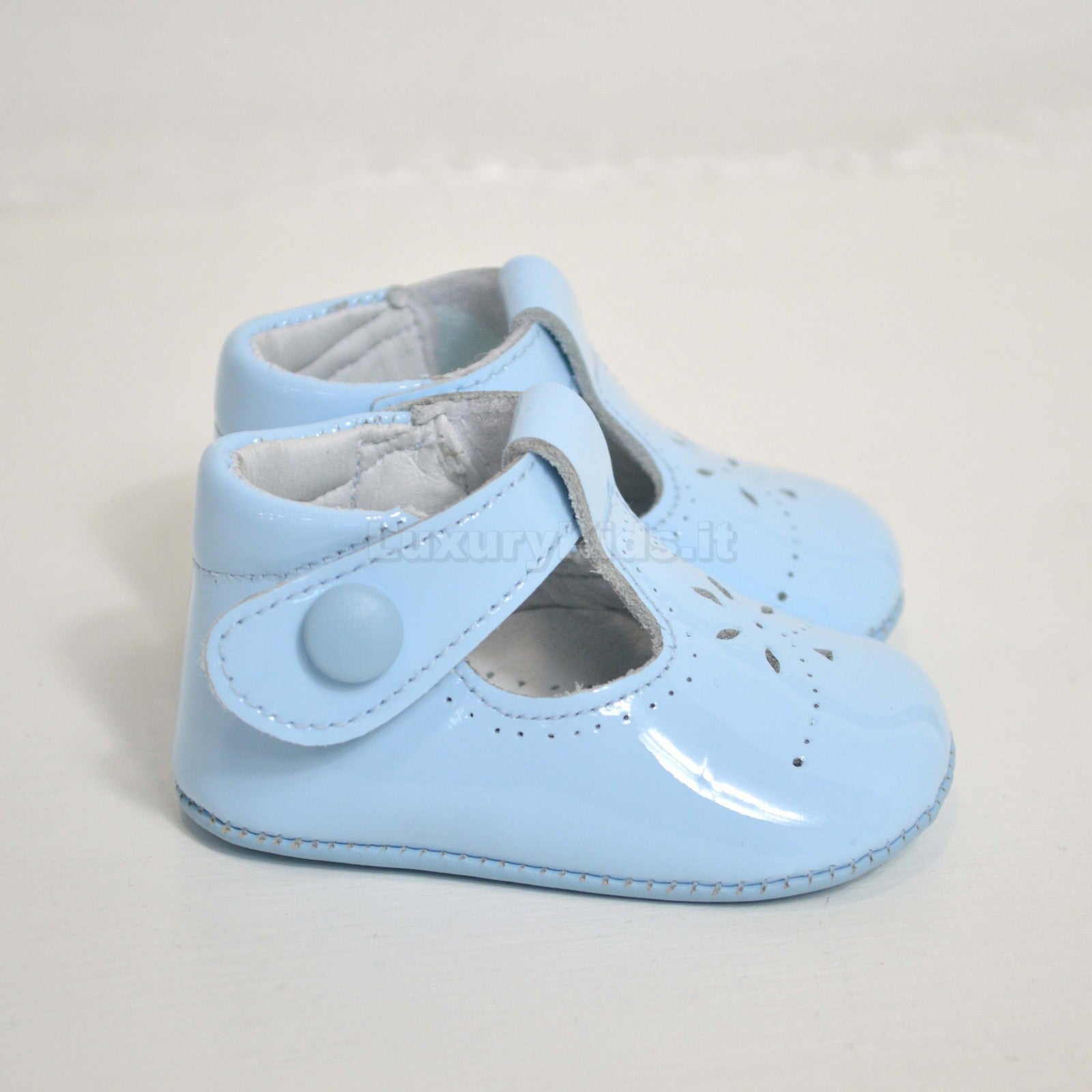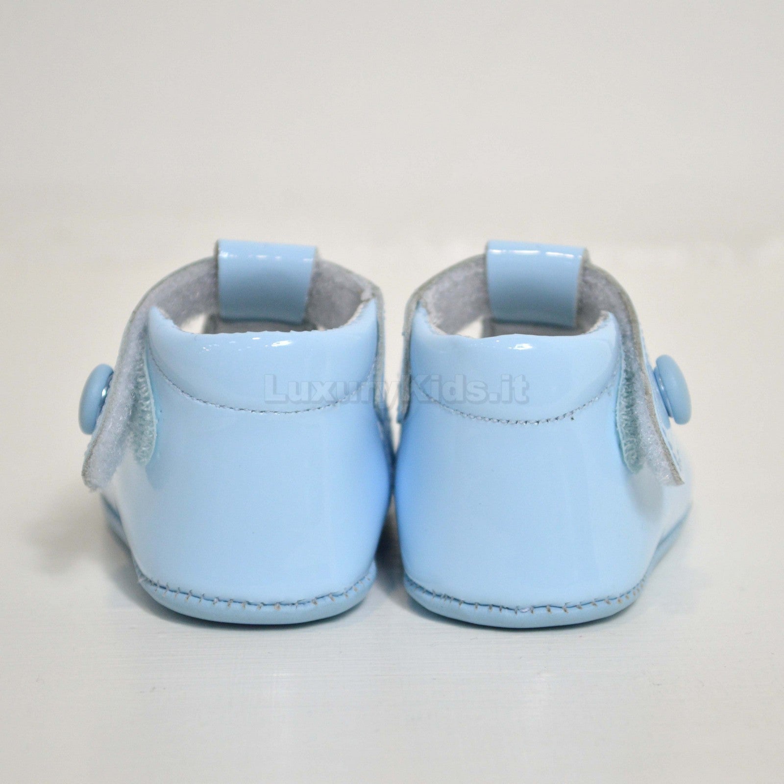 Scarpetta da culla con occhielli chiusura con cinturino con strappo ,disegno traforato sul davanti e impunture colore su colore