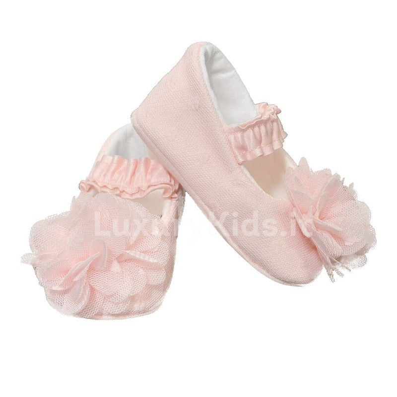 -Scarpine da culla ballerina in ricoperte da microrete rosa e fiiorellini di tulle applicati sul davanti