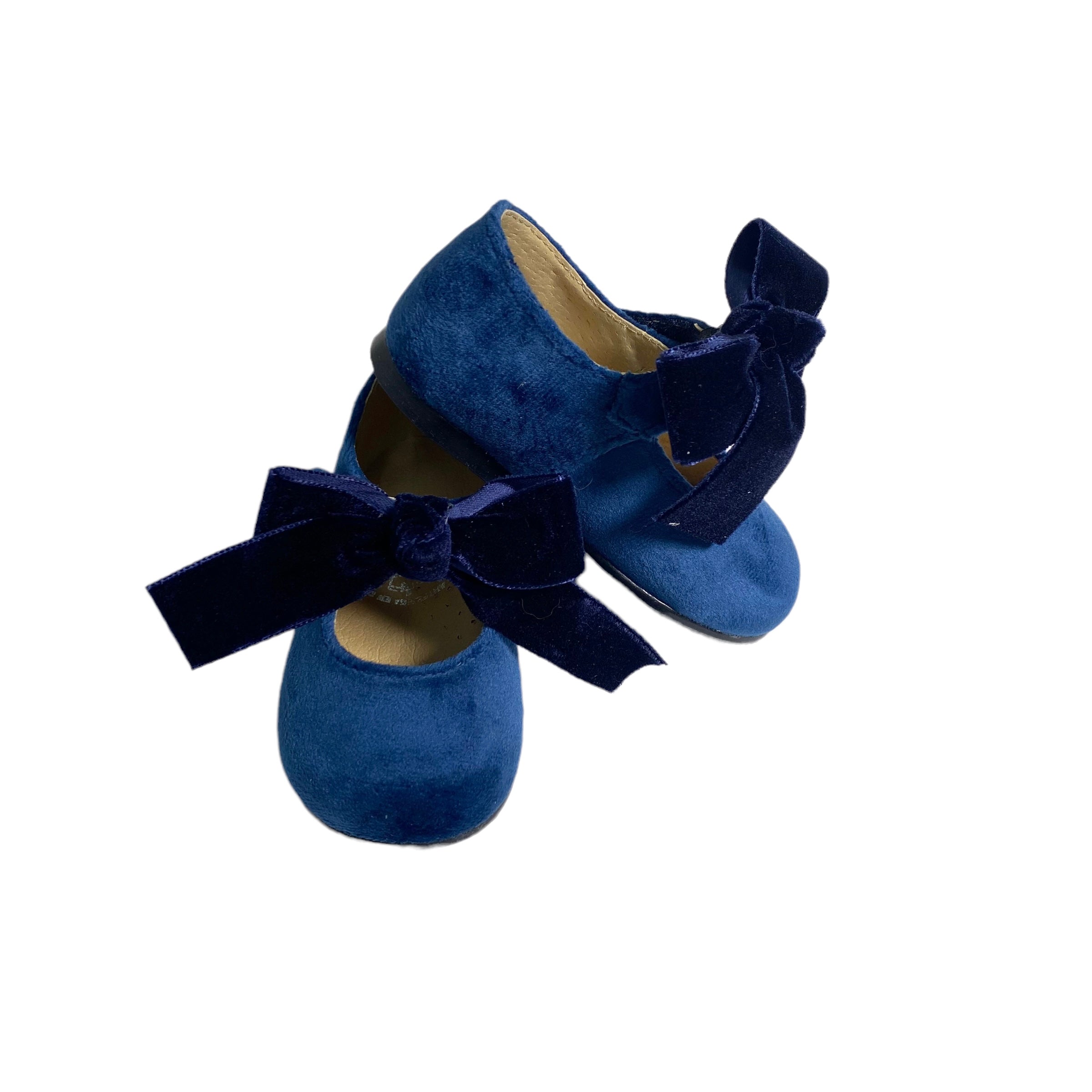 Scarpe primi passi modello ballerina in velluto con fiocco removibile e chiusura con cinturino.