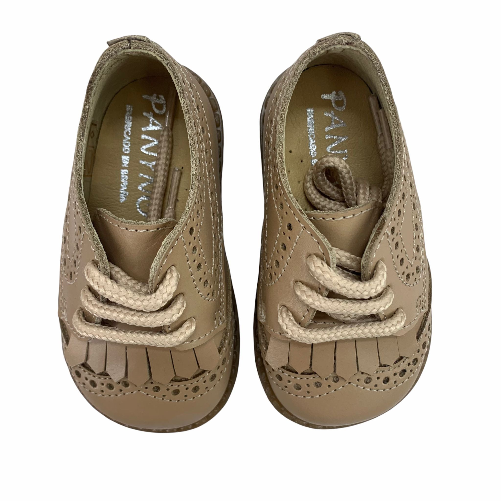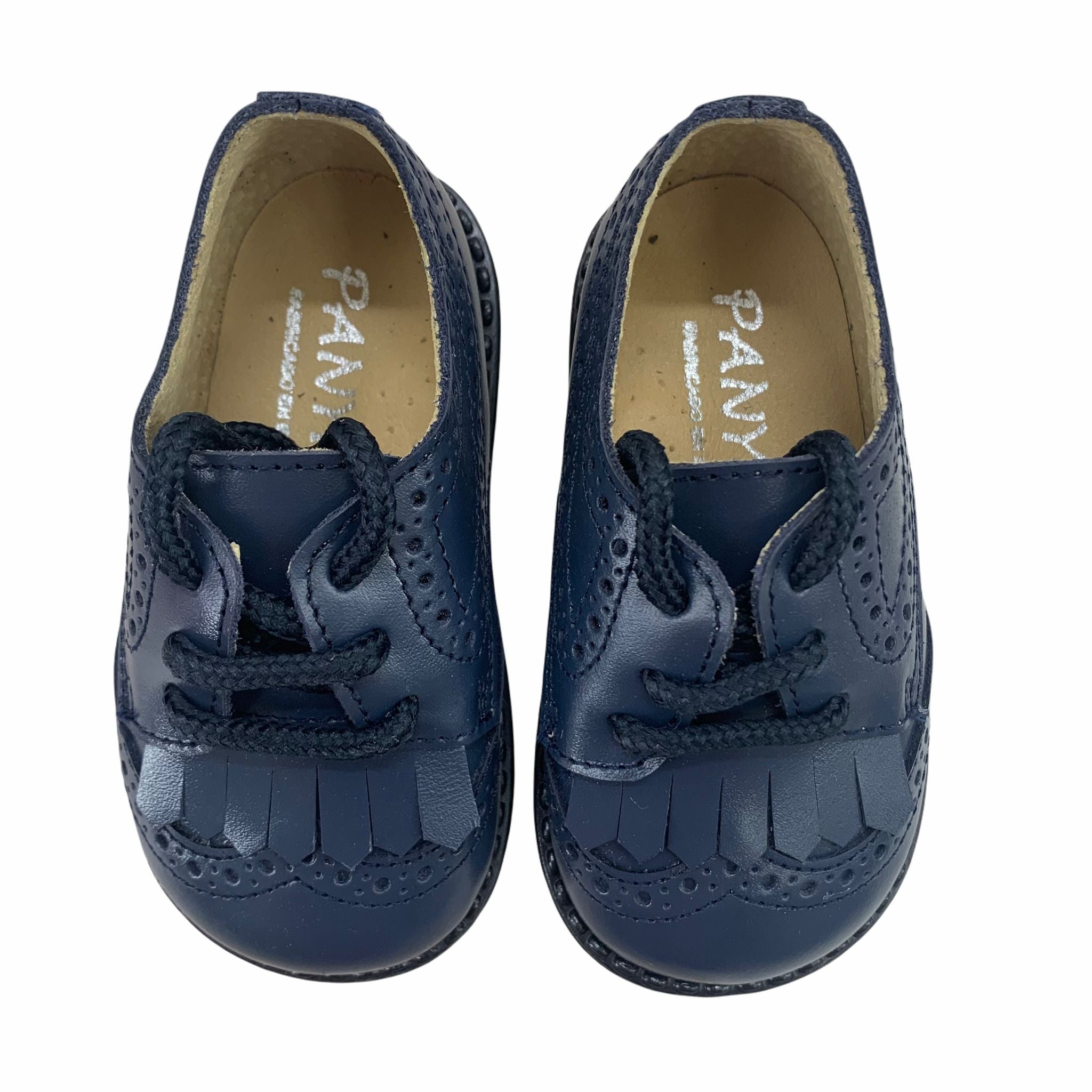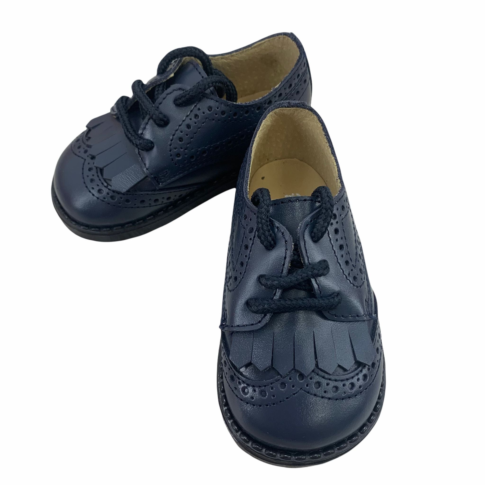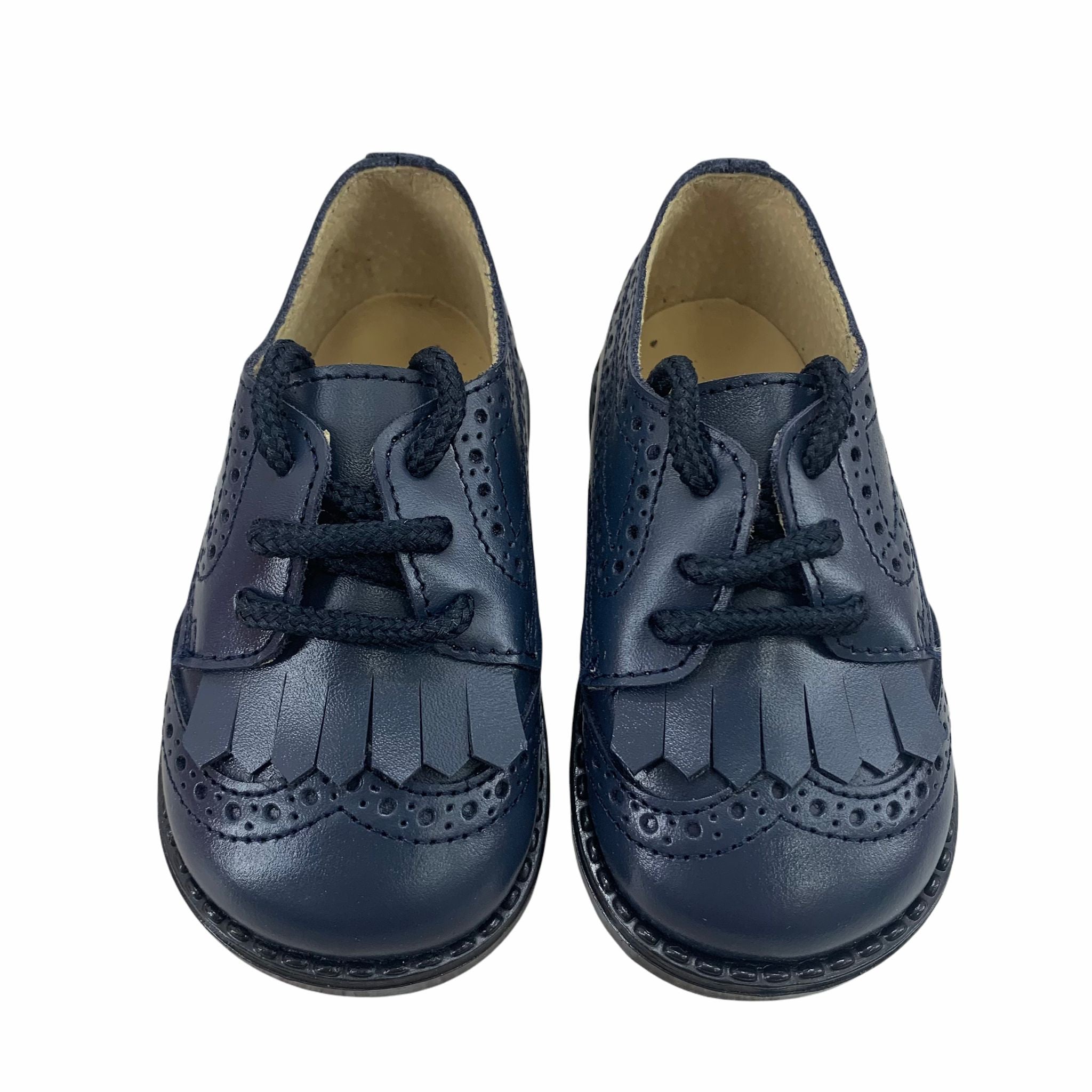 Scarpa primi passi in pelle modello francesina con nappa e lacci.