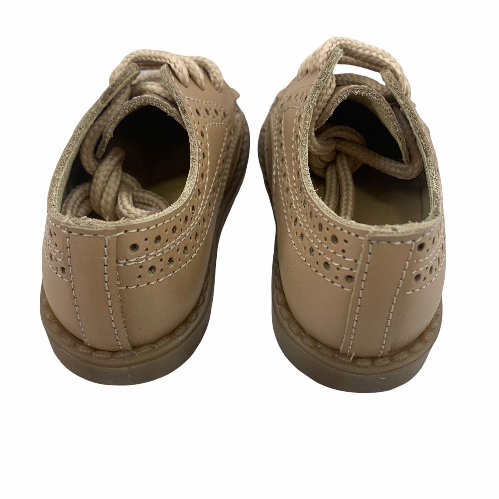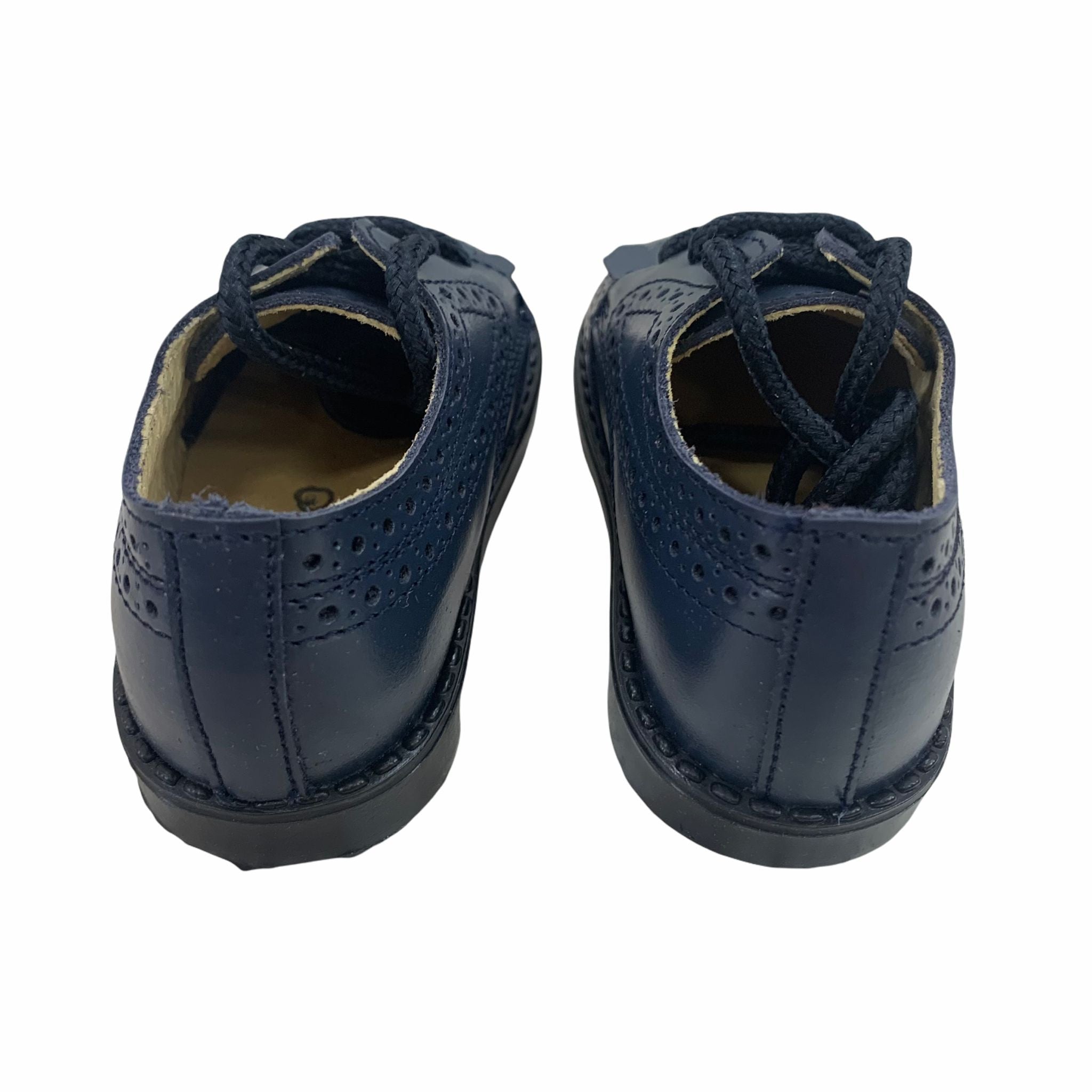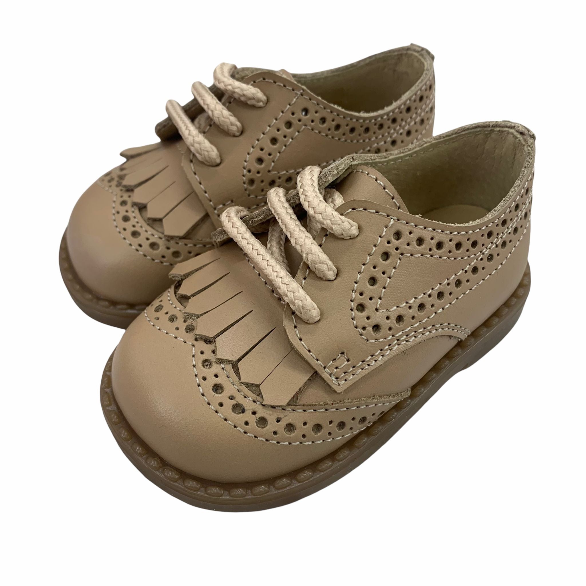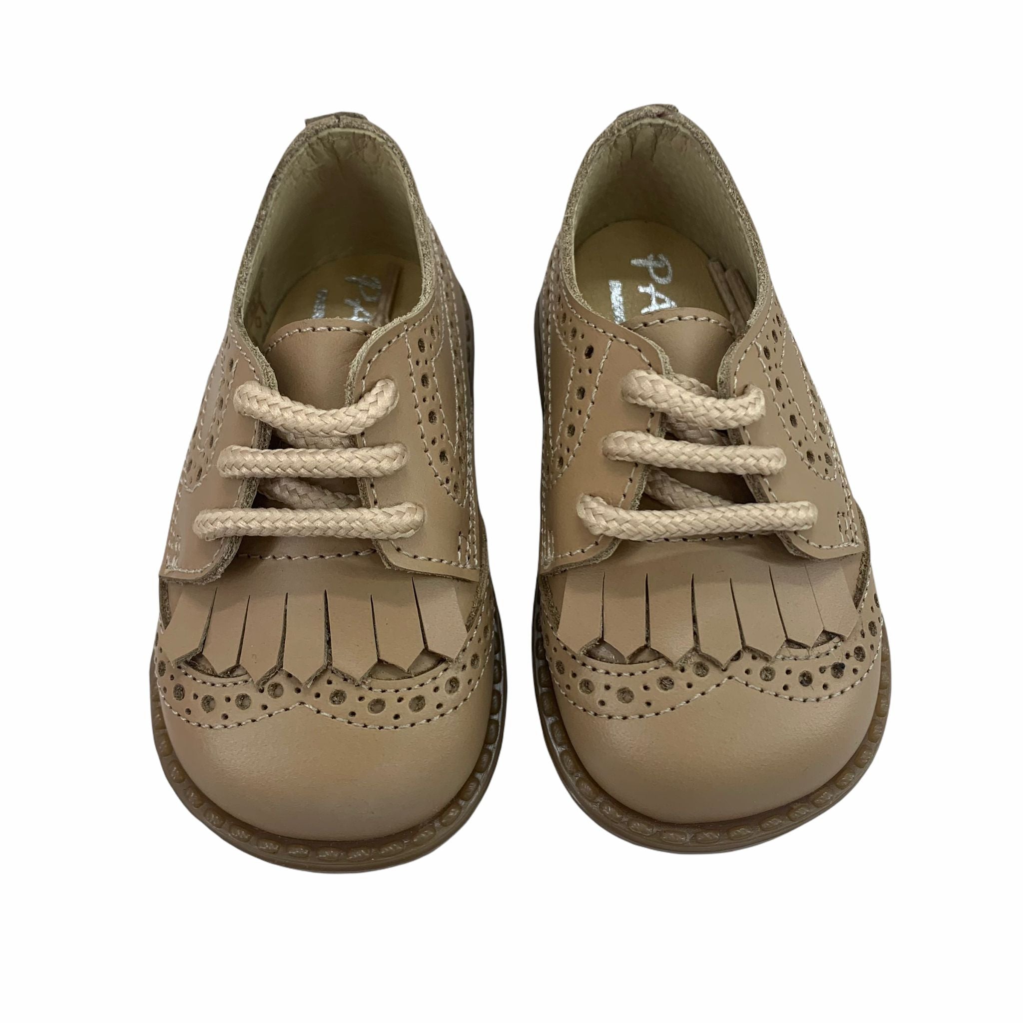 Scarpa primi passi in pelle modello francesina con nappa e lacci.