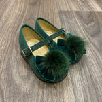 Scarpe primi passi modello ballerina in velluto, con fiocco in pannolencia e pompon in pelliccia sul davanti.