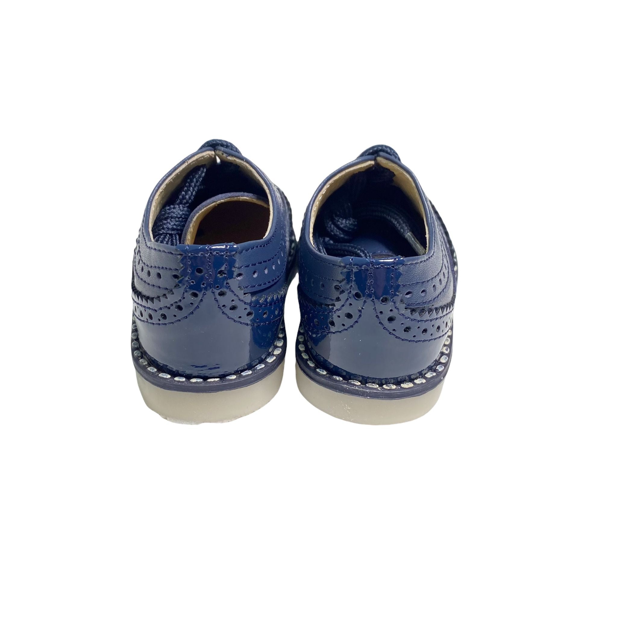 Scarpe primi passi in vera pelle, modello francesina con lacci, in tinta unita blu con punta in vernice.