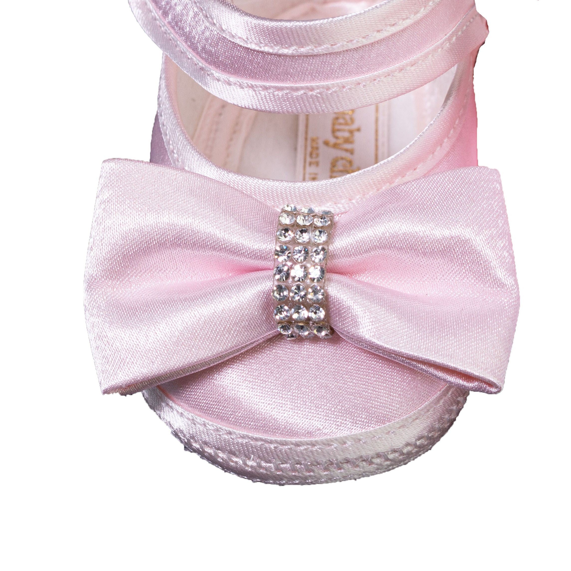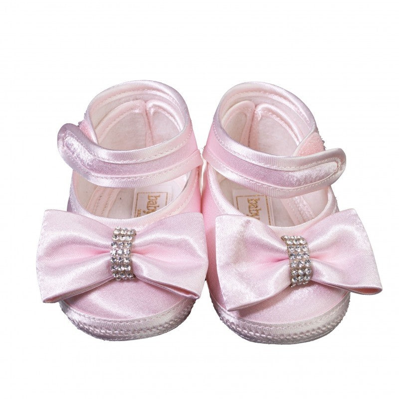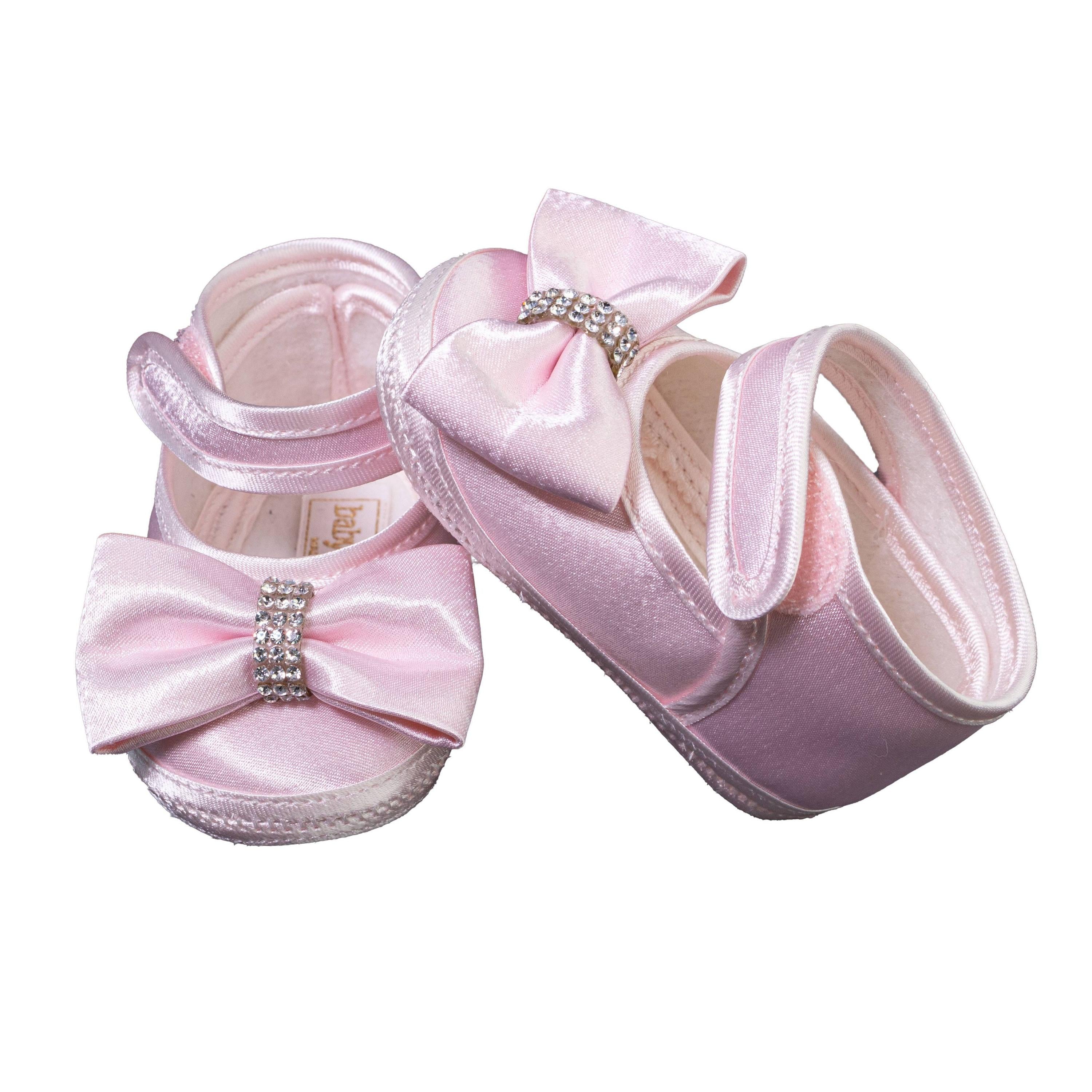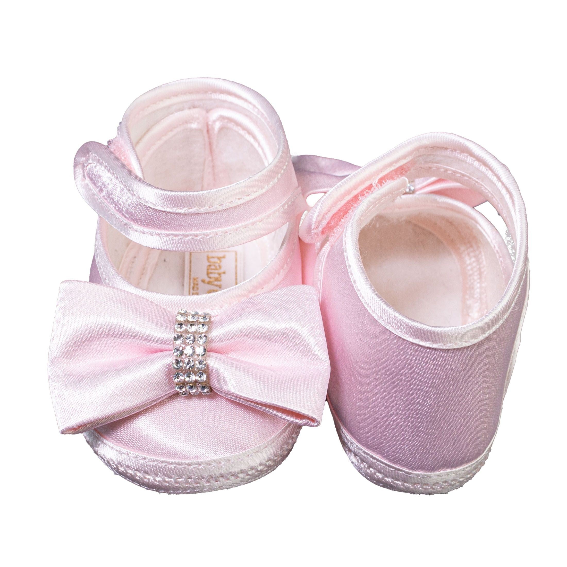 Scarpette Culla Modello Ballerina Più Alta Sul Retro Elegante Cerimonia Battesimo In Raso Rosa Con Fiocco Sul Davanti Impreziosito da Strass E Chiusura A Strappo Neonata Baby Chic 2405