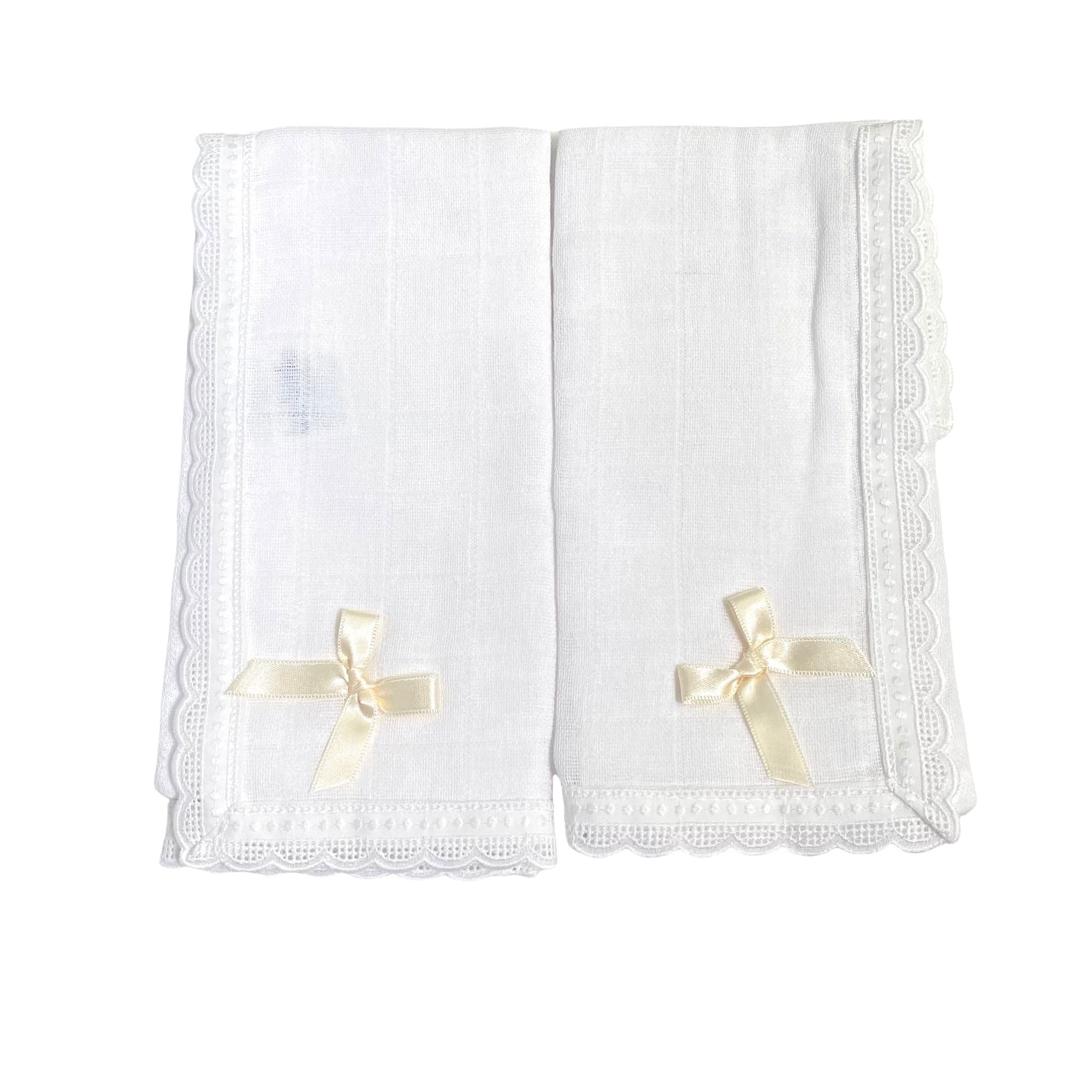Questo set di 2 quadrati in cotone della marca BABIDU è perfetto per il tuo neonato. Ogni quadrato è realizzato in garza di alta qualità con un bordino merlettato e un fiocco, per un tocco di dolcezza e raffinatezza. Proteggi la pelle delicata del tuo bambino con questi quadrati morbidissimi e resistenti.