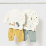 Set 4 pezzi per neonato costituito da 2 completi di felpa e pantalone lungo abbinabili.