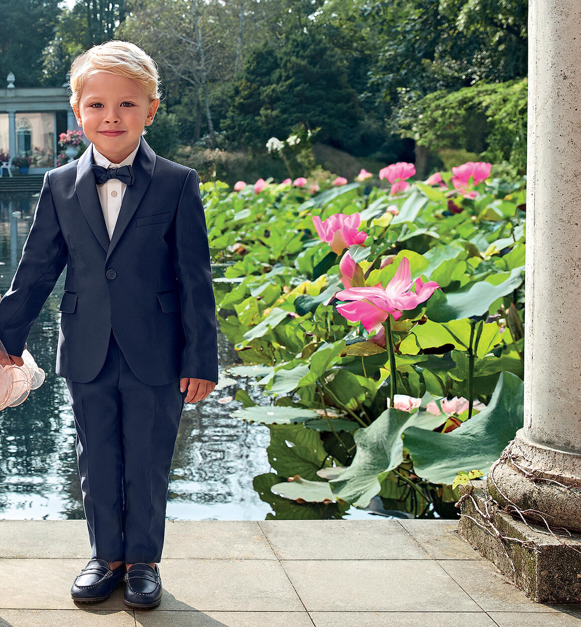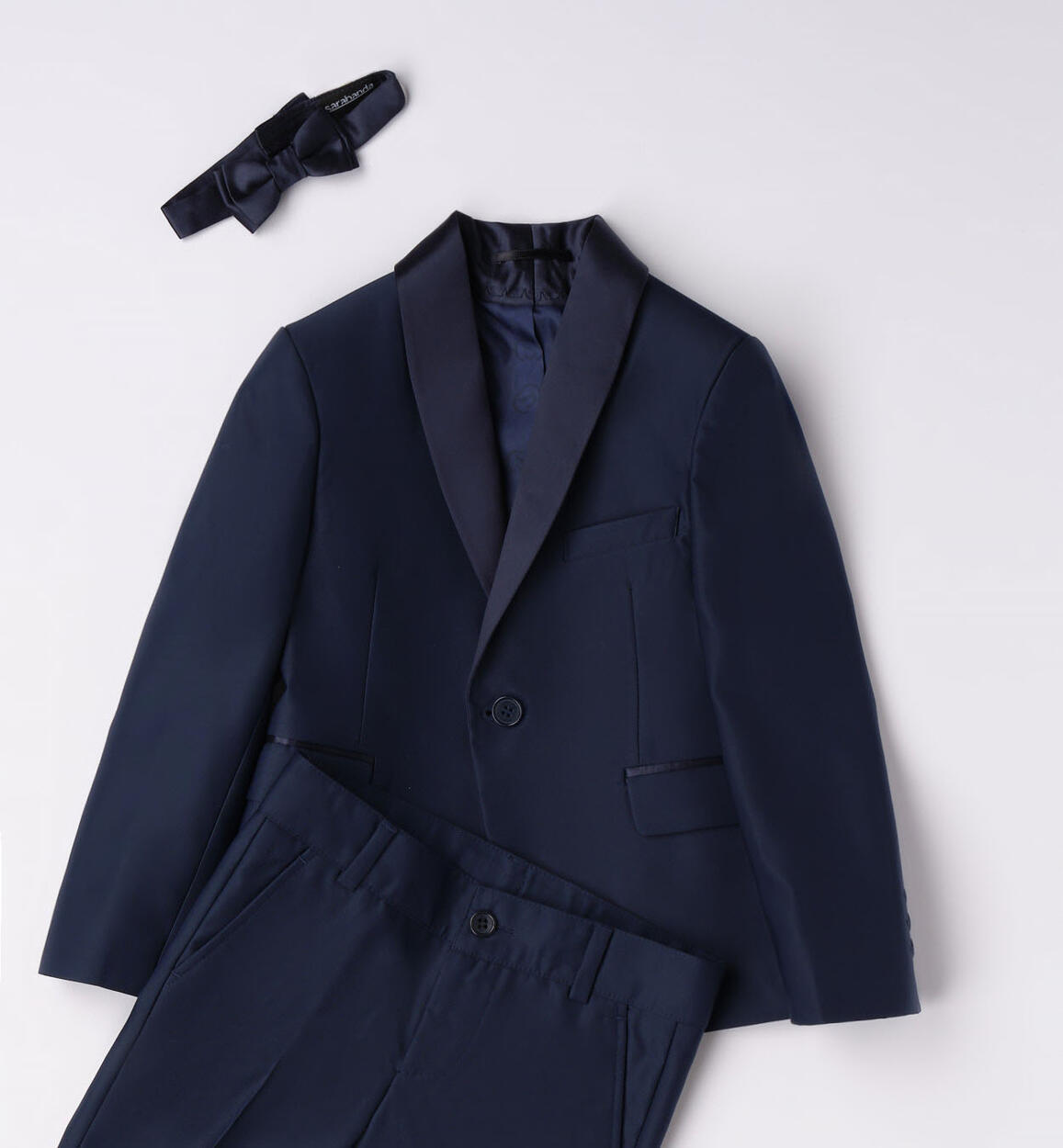 Smoking bambino Sarabanda composto da giacca, pantaloni e papillon. Il completo elegante è realizzato in satin con dettagli in satin lucido. La giacca bambino elegante presenta chiusura con bottoni e tasche laterali. I pantaloni eleganti bambino, invece, hanno gamba dritta con piega sul davanti e chiusura con zip e bottone. Misura vita regolabile con elastico asolato interno. Lo smoking bambino fa parte della collezione S Premium Sarabanda pensata per vestire le cerimonie più formali dei bambini