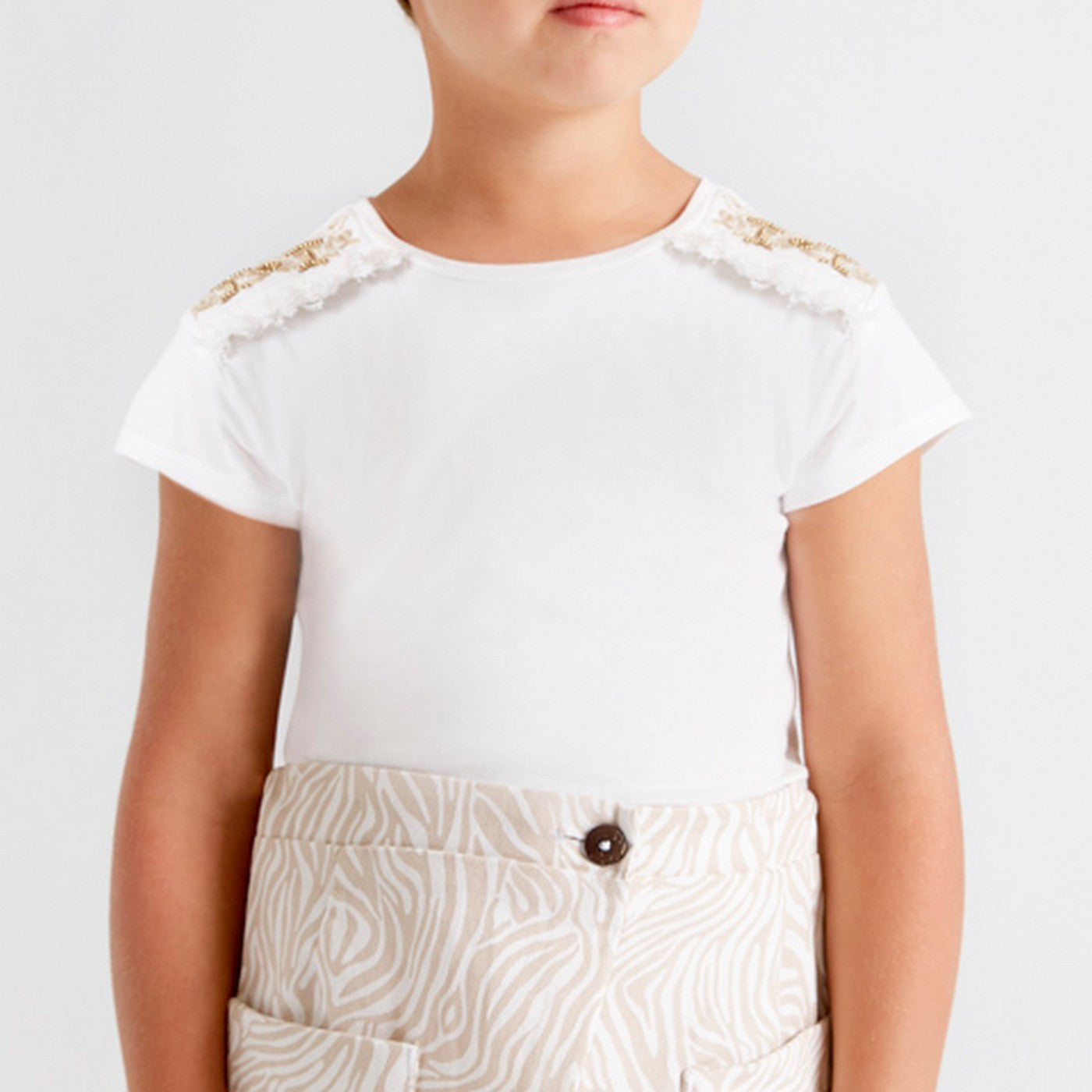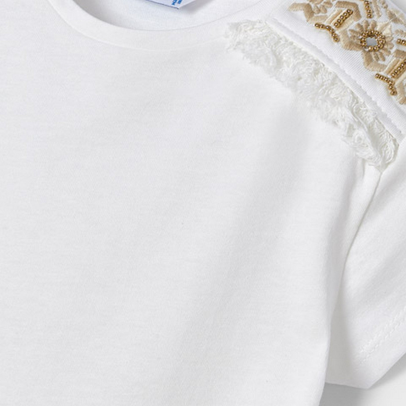 T-Shirt basica in tinta unita bianca con particolari ricami sulle spalle in beige.