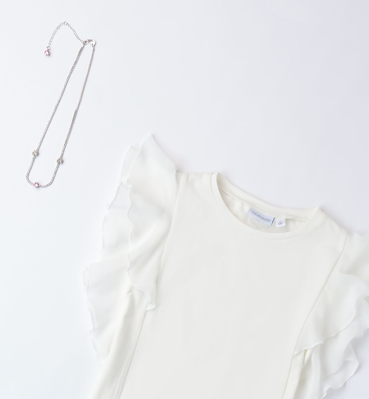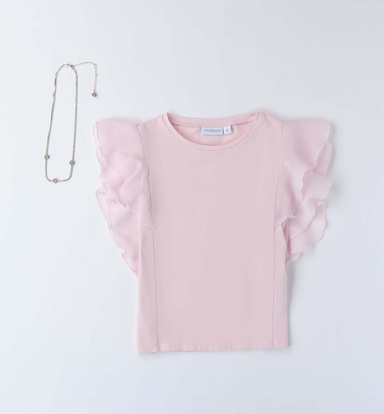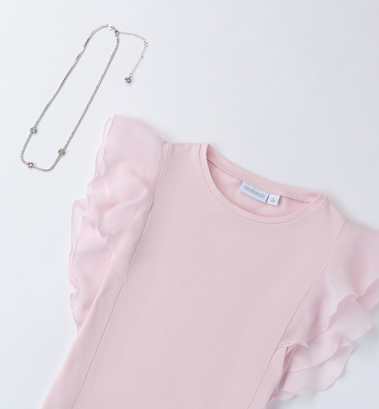 La T-shirt Sarabanda per ragazza è realizzata in jersey stretch di cotone e presenta maniche in voile, perfetta per le occasioni importanti. Inoltre, è dotata di una collana in abbinamento per un tocco aggiuntivo di stile. Un capo di alta qualità e perfetto per ogni occasione importante.