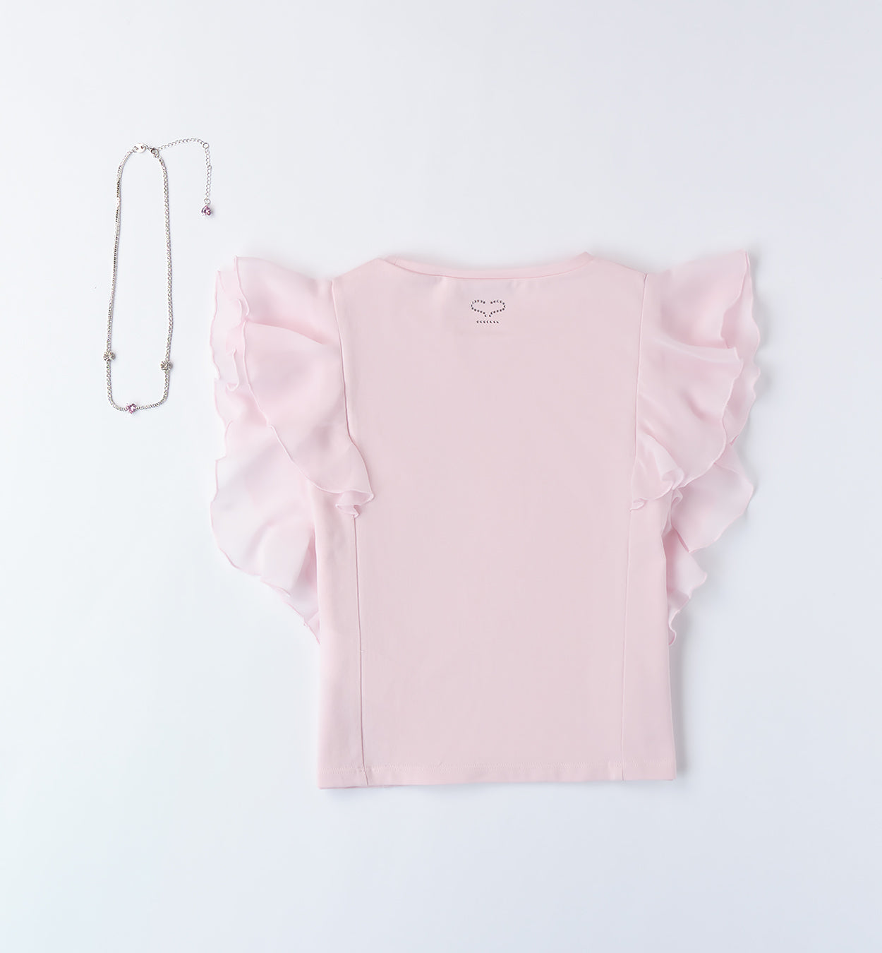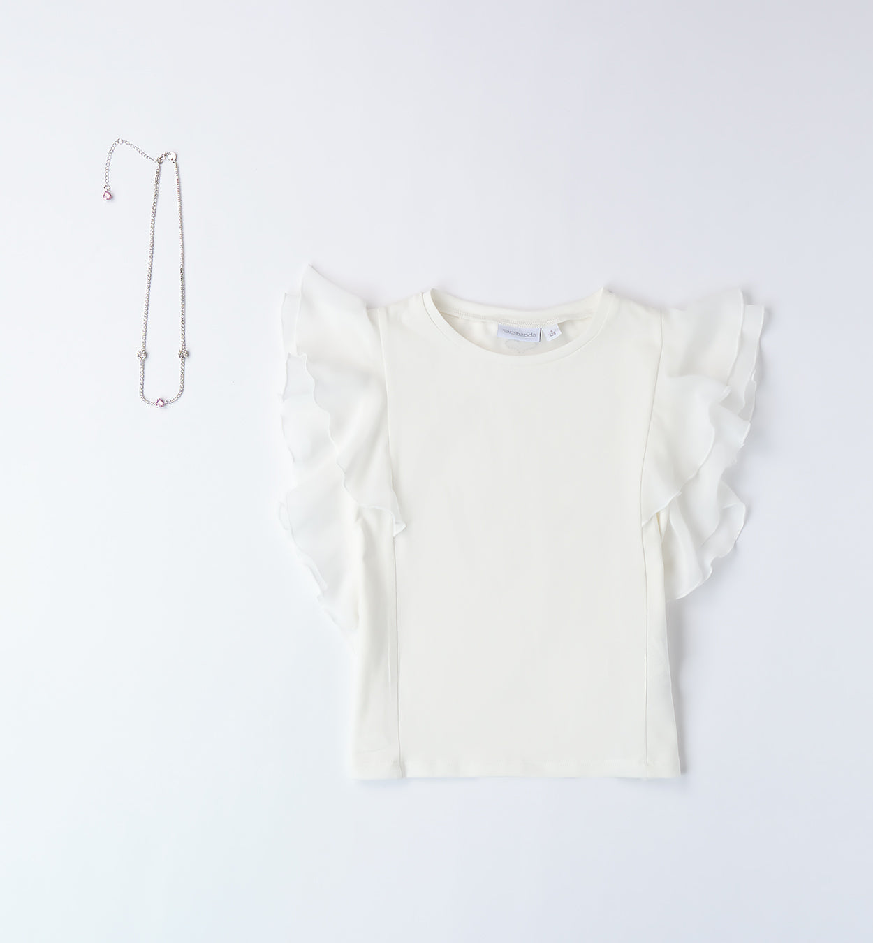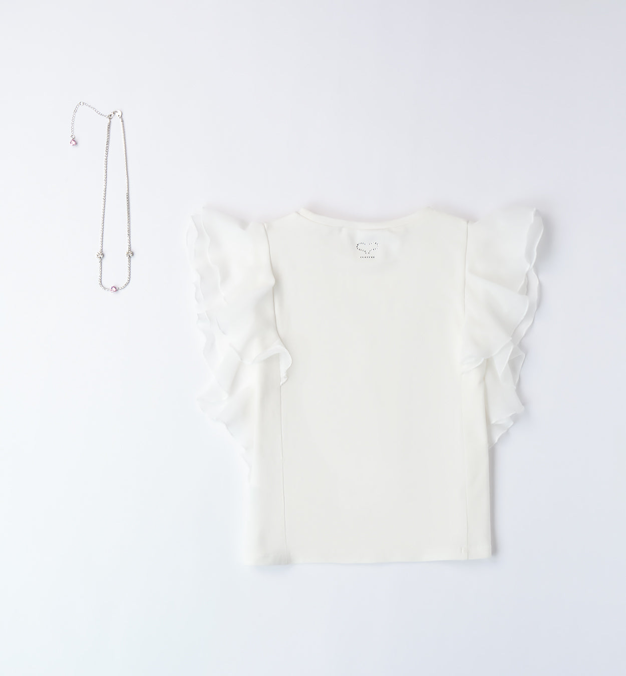 La T-shirt Sarabanda per ragazza è realizzata in jersey stretch di cotone e presenta maniche in voile, perfetta per le occasioni importanti. Inoltre, è dotata di una collana in abbinamento per un tocco aggiuntivo di stile. Un capo di alta qualità e perfetto per ogni occasione importante.