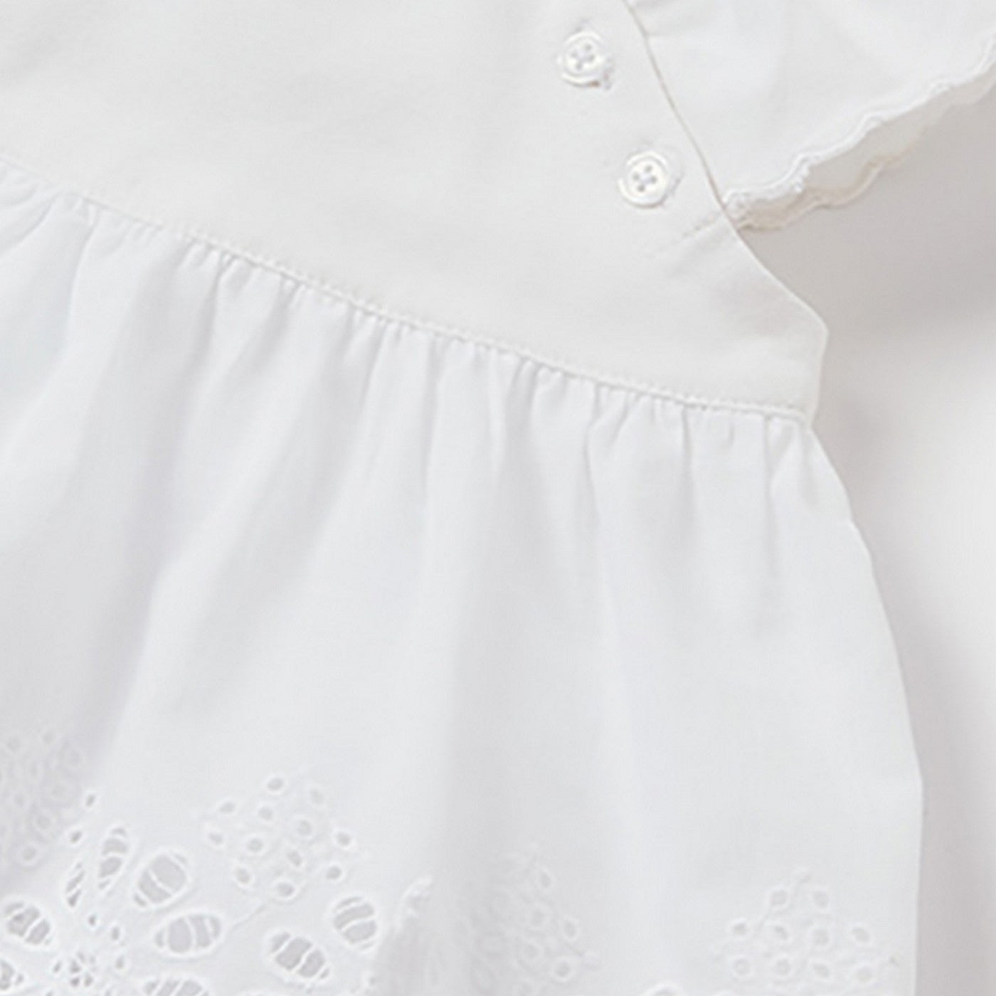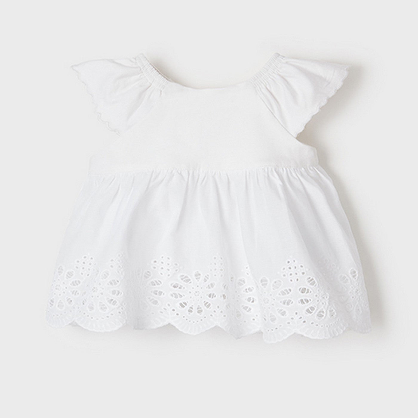 Maglietta manica corta con volant per neonata. Chiusura con bottoni nella parte anteriore. Comodo tessuto di punto. Design con terminazioni onda.