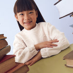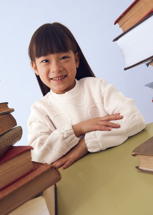 Felpa manica lunga per bambina. Girocollo. Chiusura con bottoni a pressione nella parte posteriore. Esterno in tessuto con effetto imbottito.