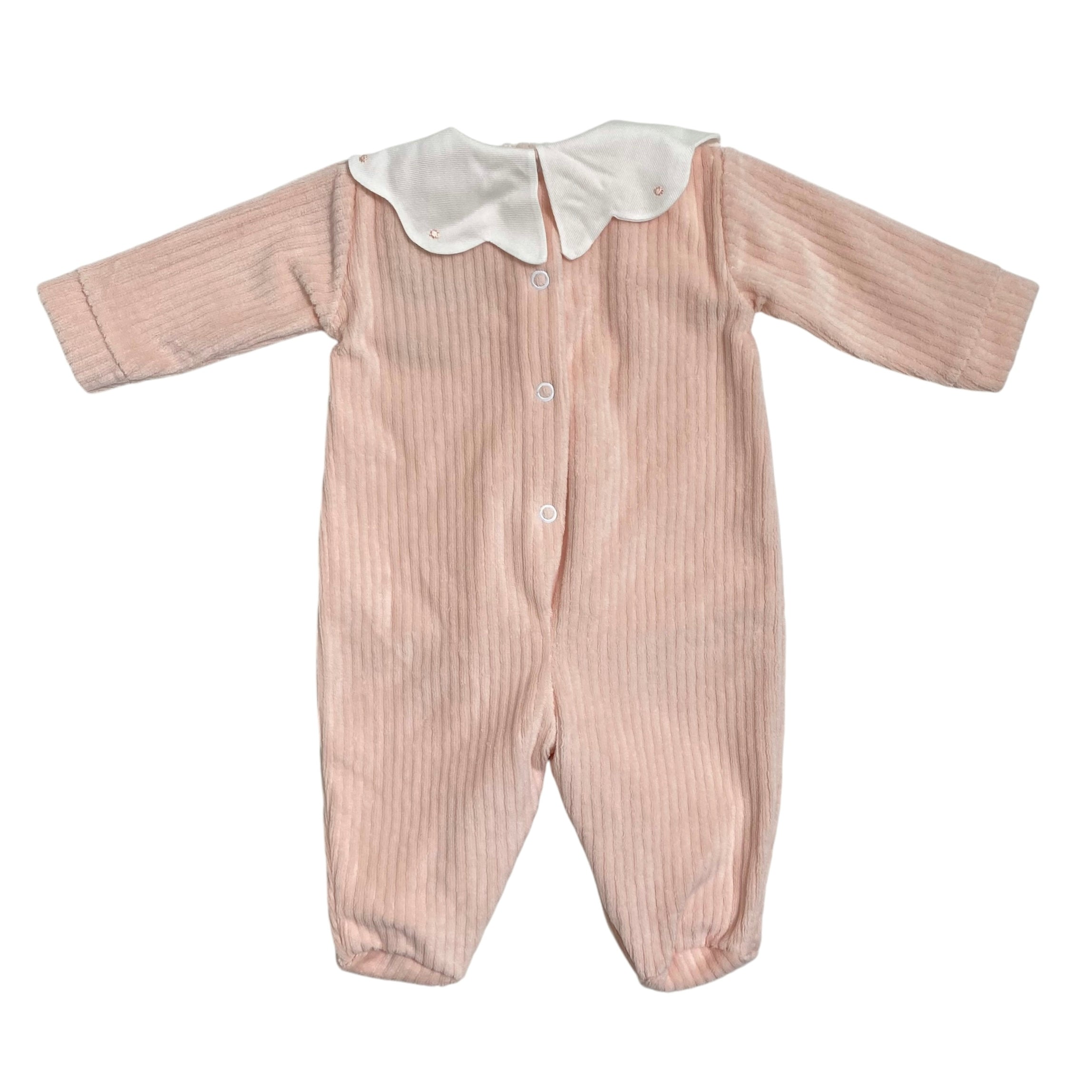 Questa tutina intera in ciniglia millerighe è l'outfit perfetto per far sentire la tua neonata elegante e alla moda sin dai primi giorni. Con il suo collo smerlato ricamato in cotone, è l'ideale per ogni occasione. Aggiungi un tocco di stile al guardaroba della tua piccola con la tutina BEBE' MARGO'.