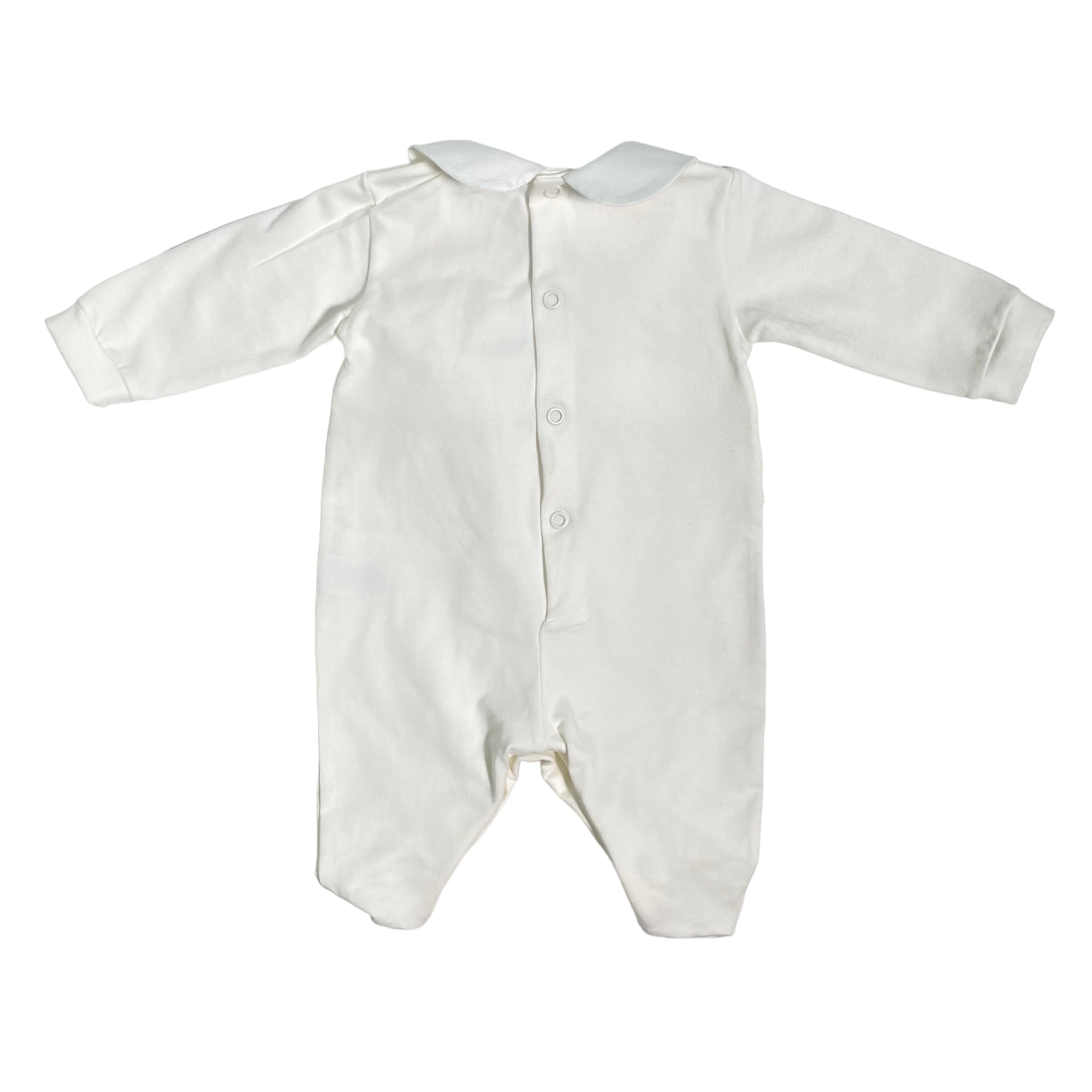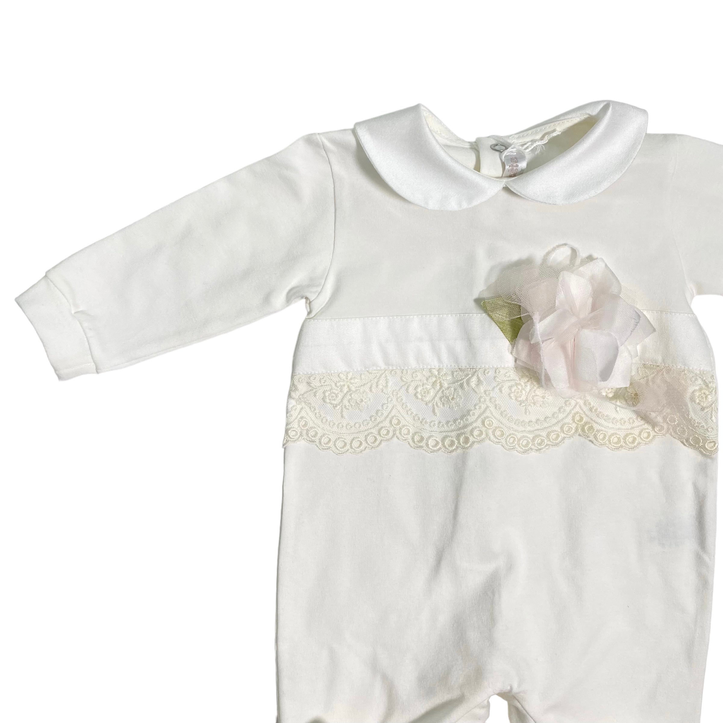 Tutina intera in cotone, in tinta unita panna, con applicazione di fascia in pizzo sul petto.