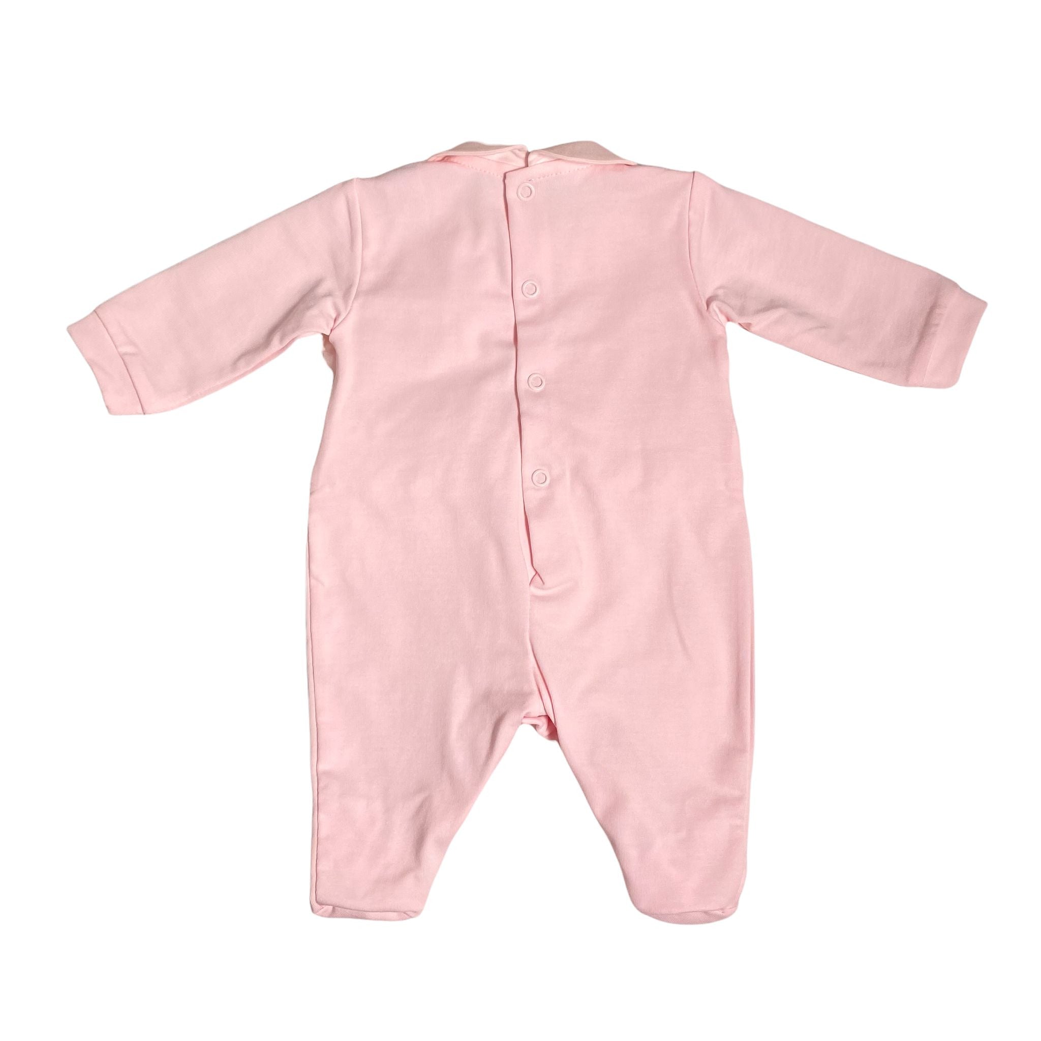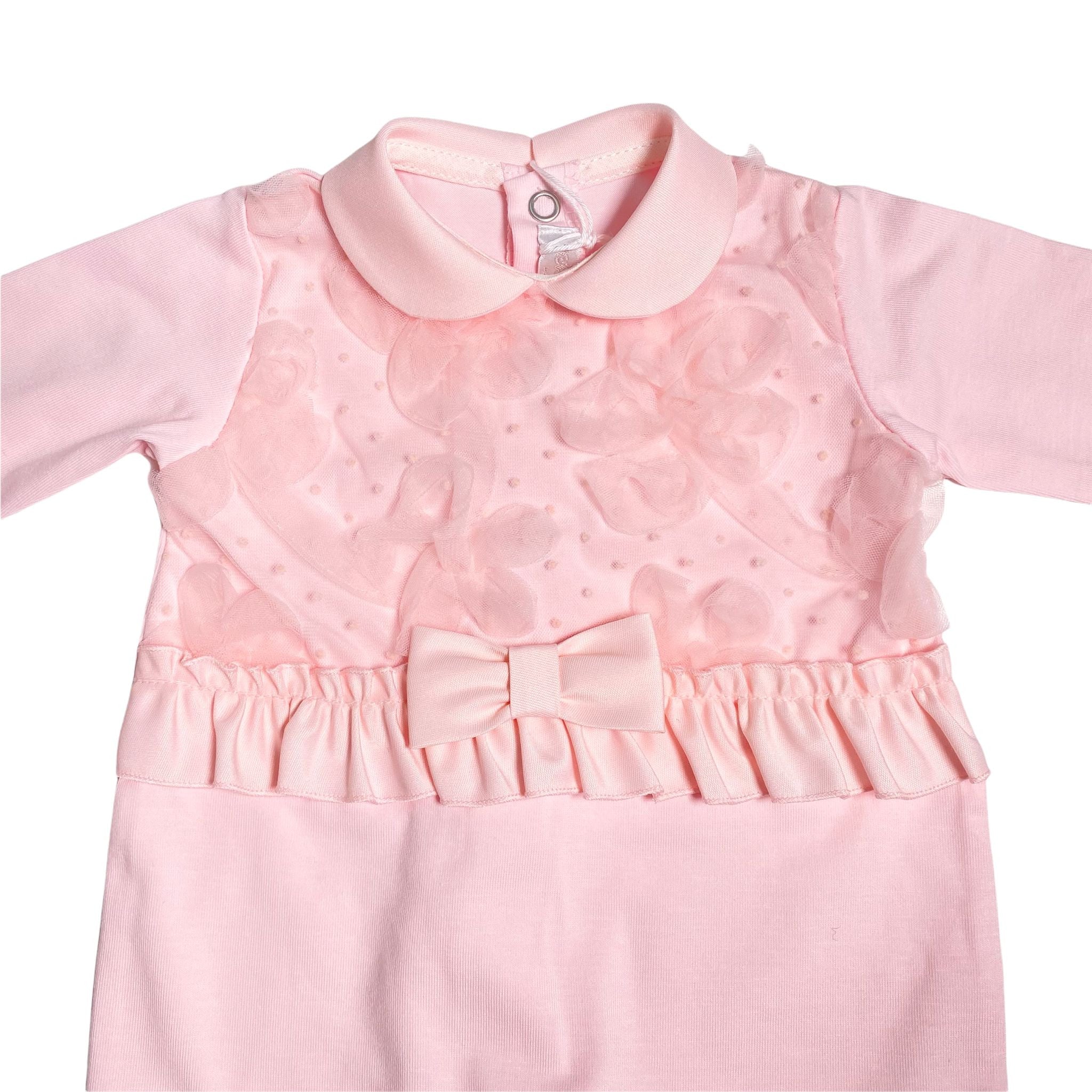 Tutina intera in cotone, in tinta unita rosa, con corpetto in tulle con fiori e balza centrale con rouche in raso e fioccone.