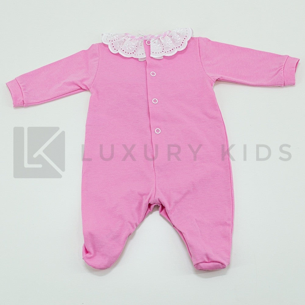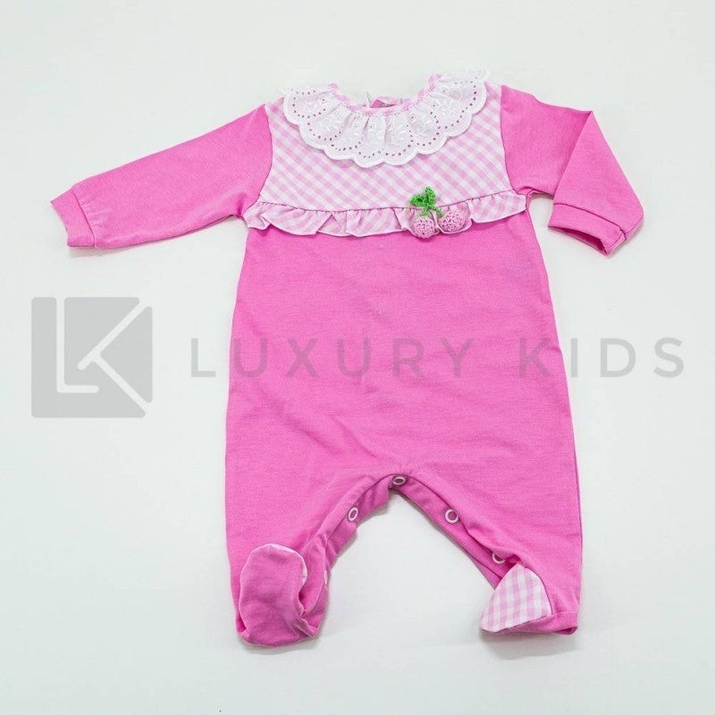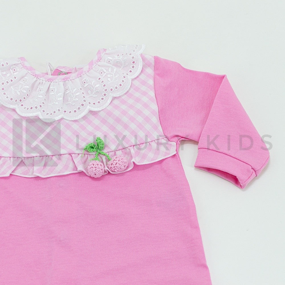 Tutina intera in cotone fuxia con corpetto a quadretti rosa, applicazione di fragoline e collo volant in pizzo san gallo.