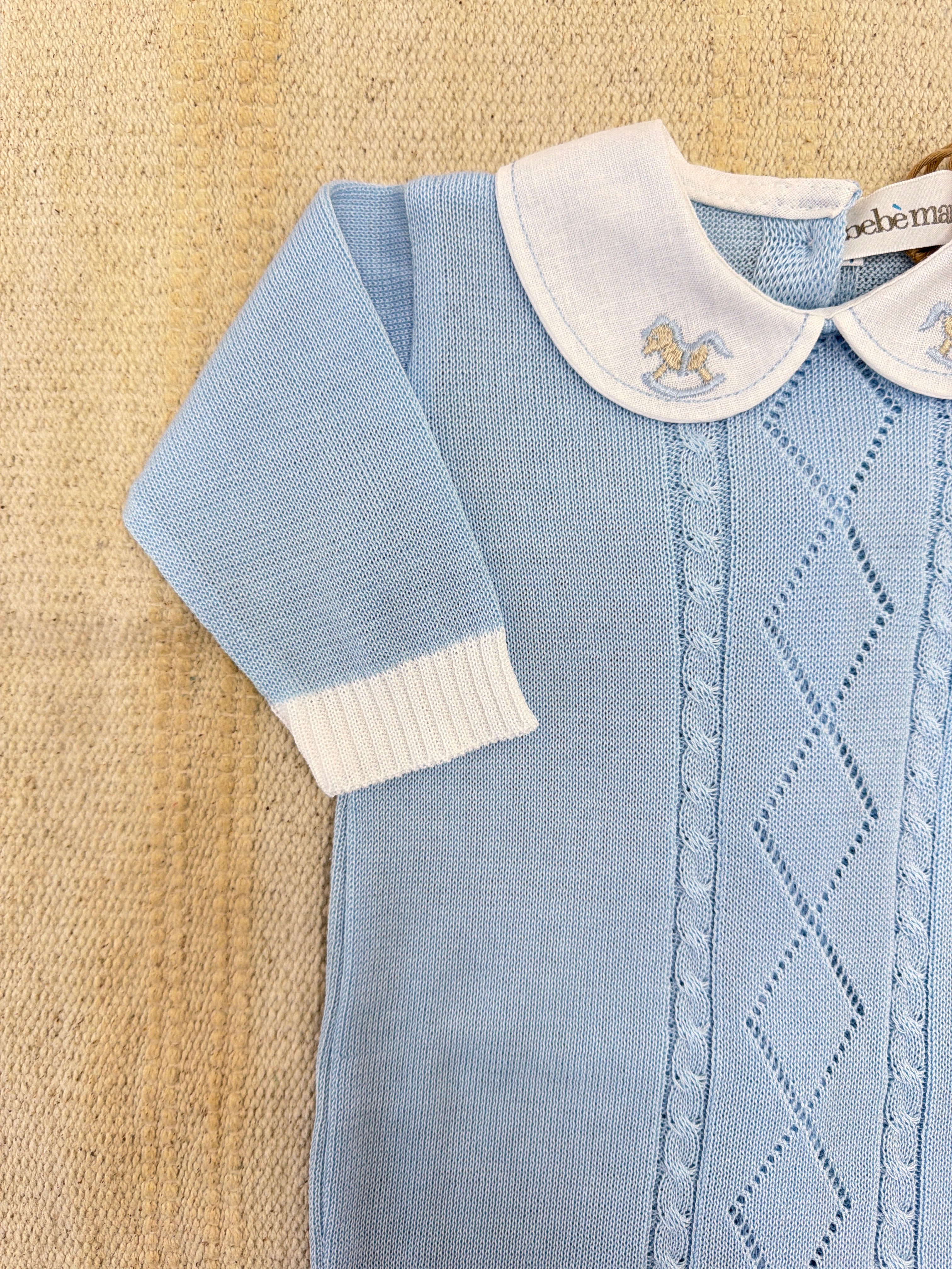 Delicata tutina intera in filo per neonato, perfetta per le stagioni calde. Caratterizzata da un elegante colletto ricamato con dettaglio di cavalluccio a dondolo, aggiunge un tocco di raffinatezza al guardaroba del piccolo. La lavorazione traforata garantisce traspirabilità e comfort durante tutto il giorno. Ideale per occasioni speciali o per l'uso quotidiano, questa tutina combina stile e praticità in un capo essenziale per i primi mesi di vita.