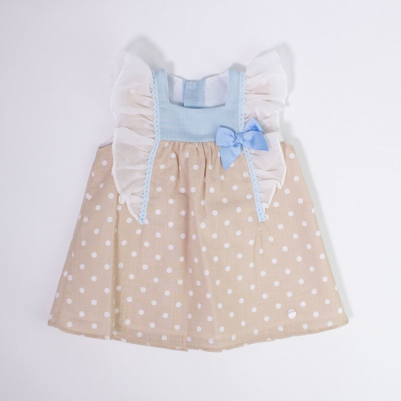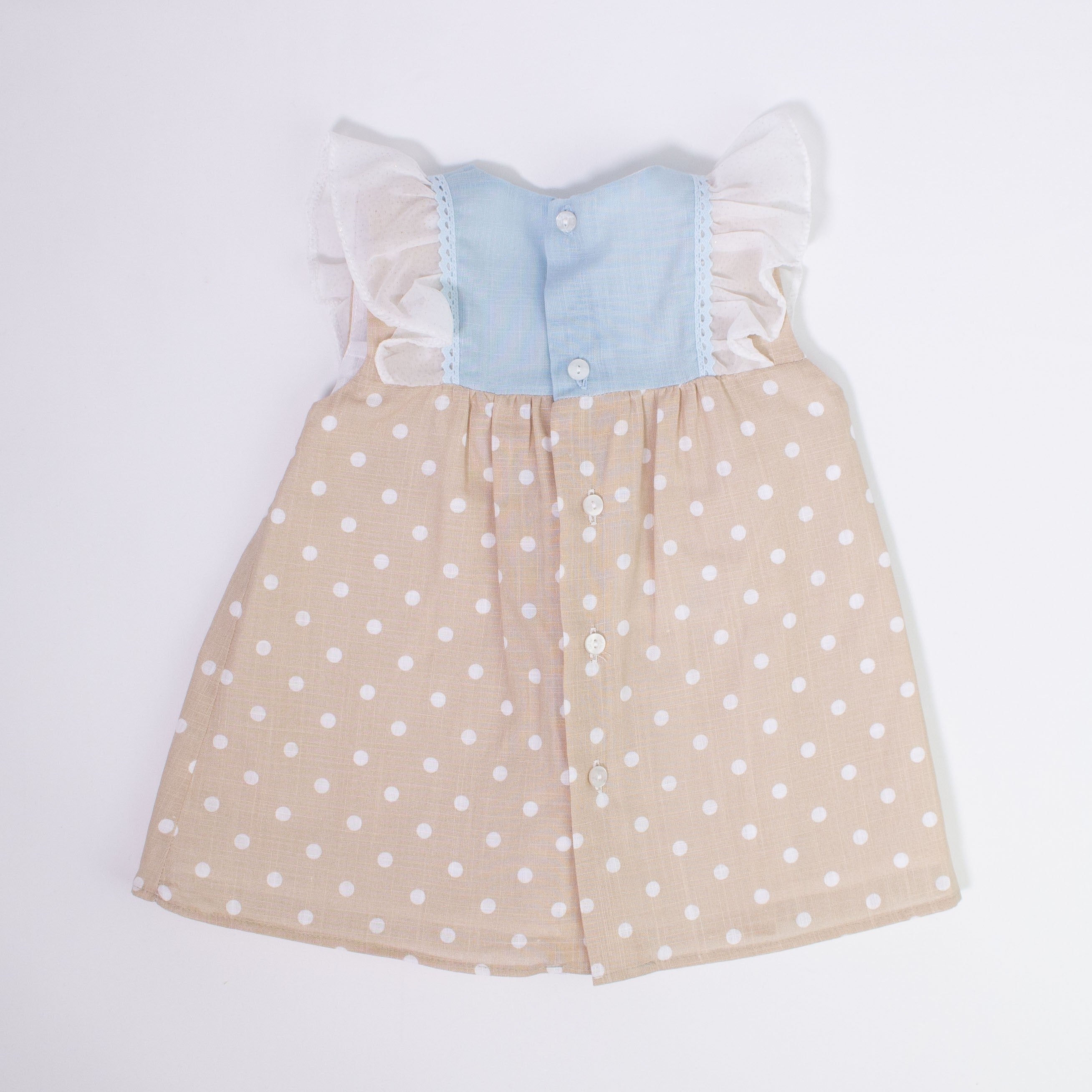 Vestito In Cotone. Giromanica Con Volant Bianco Laminato Oro. Parte Superiore Tinta Unita Celeste in Lino con Fiocco. Gonna Beige a Pois Bianchi.