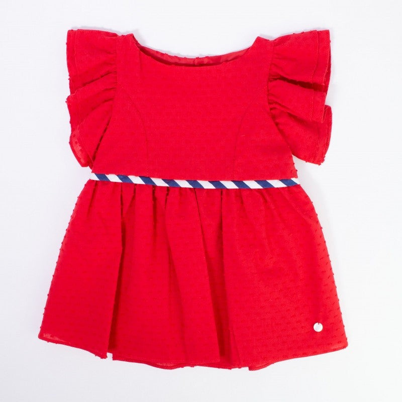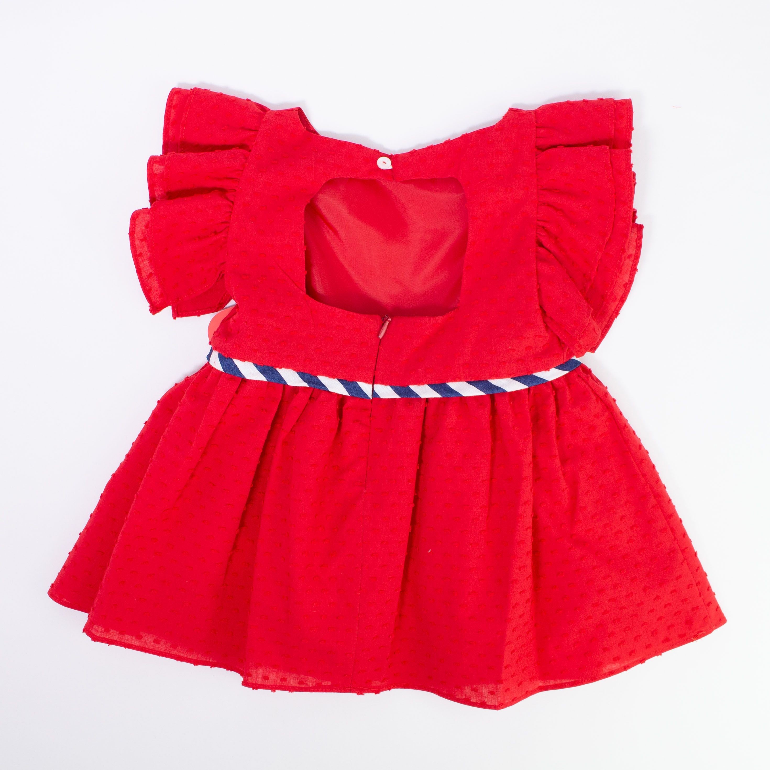 Vestito In Cotone Plumetis Tinta Unita Rosso con Rouche Nelle Maniche.