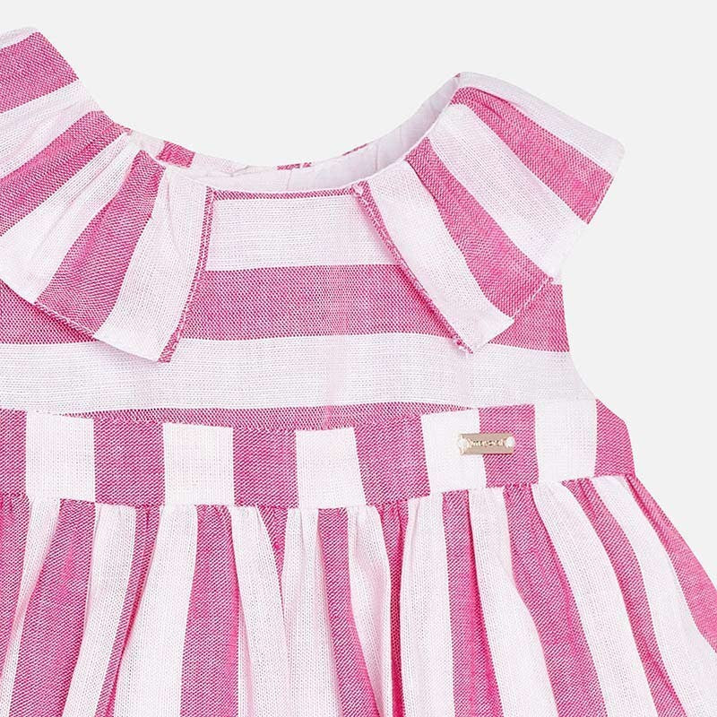Vestito giromanica. Girocollo. Chiusura con bottoni a pressione nella parte posteriore che facilitano la vestibilità del capo. Modello con riccio e volant. Trama a righe.