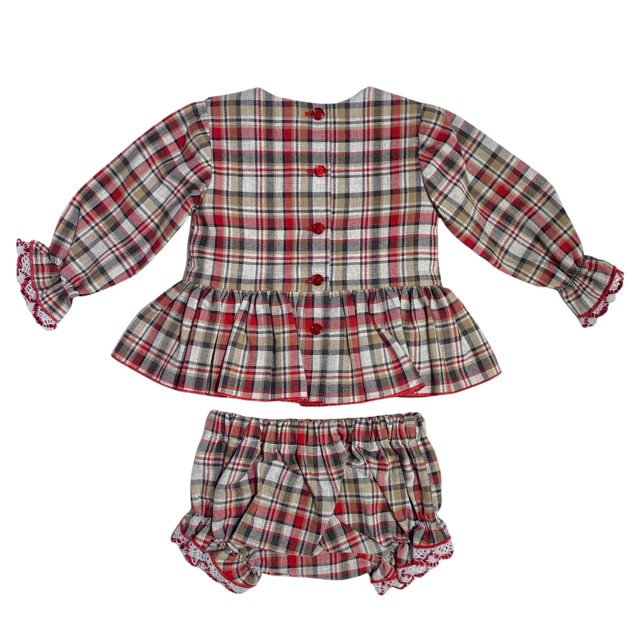 Warm cotton dress with elasticated culottes, round neck with red bow, long sleeves with elastic at the wrist and buttons on the back.