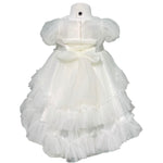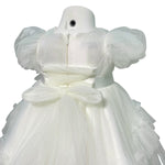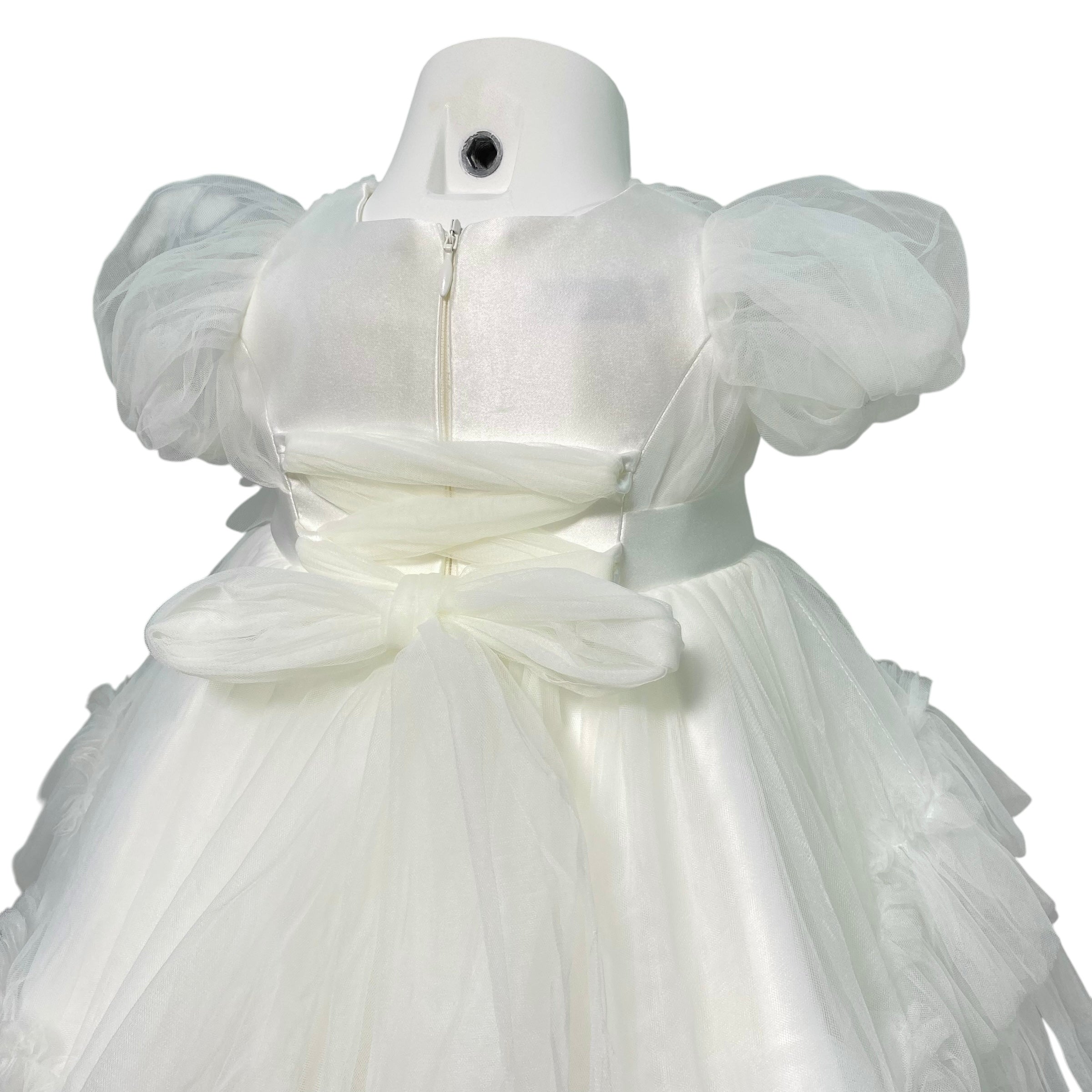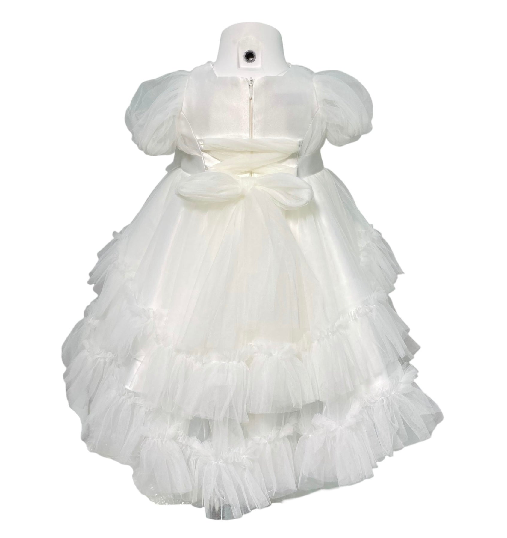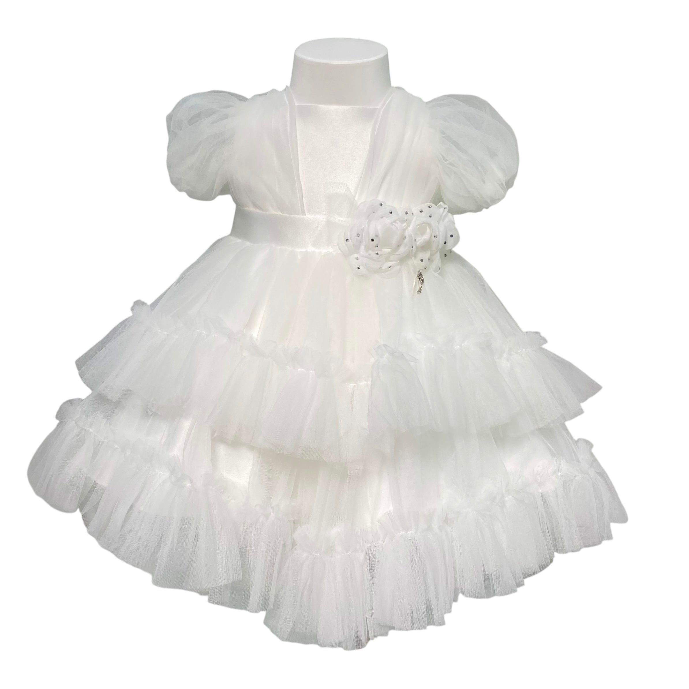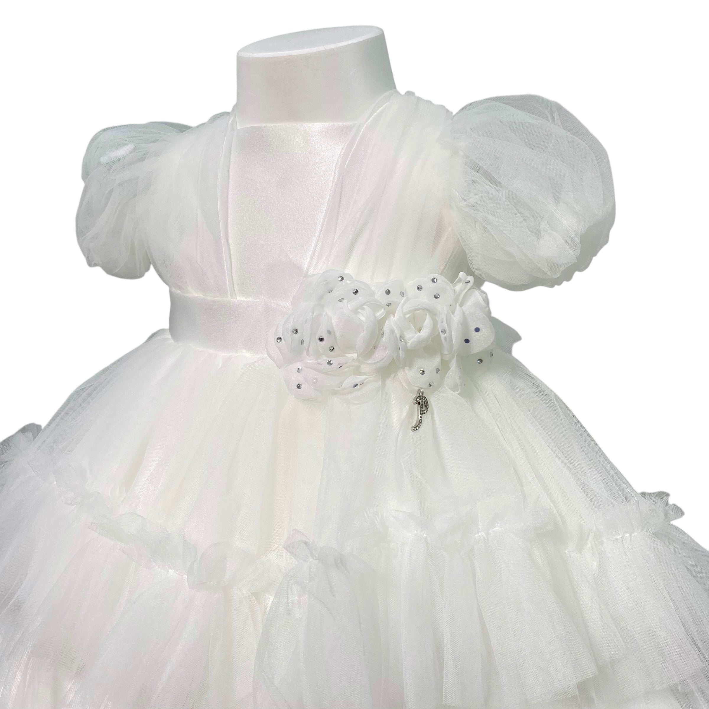 Scopri l'eleganza e la raffinatezza dell'Abito Elegante Battesimale Con Code' Neonata PETIT. Realizzato con un corpetto in raso e balze in tulle, questo abito è impreziosito da una fascia in vita con fiori di strass e una chiusura sul retro con fioccone. La mezza manica a palloncino e la zip invisibile per la chiusura garantiscono un fit perfetto. Prodotto in Italia con alta qualità.