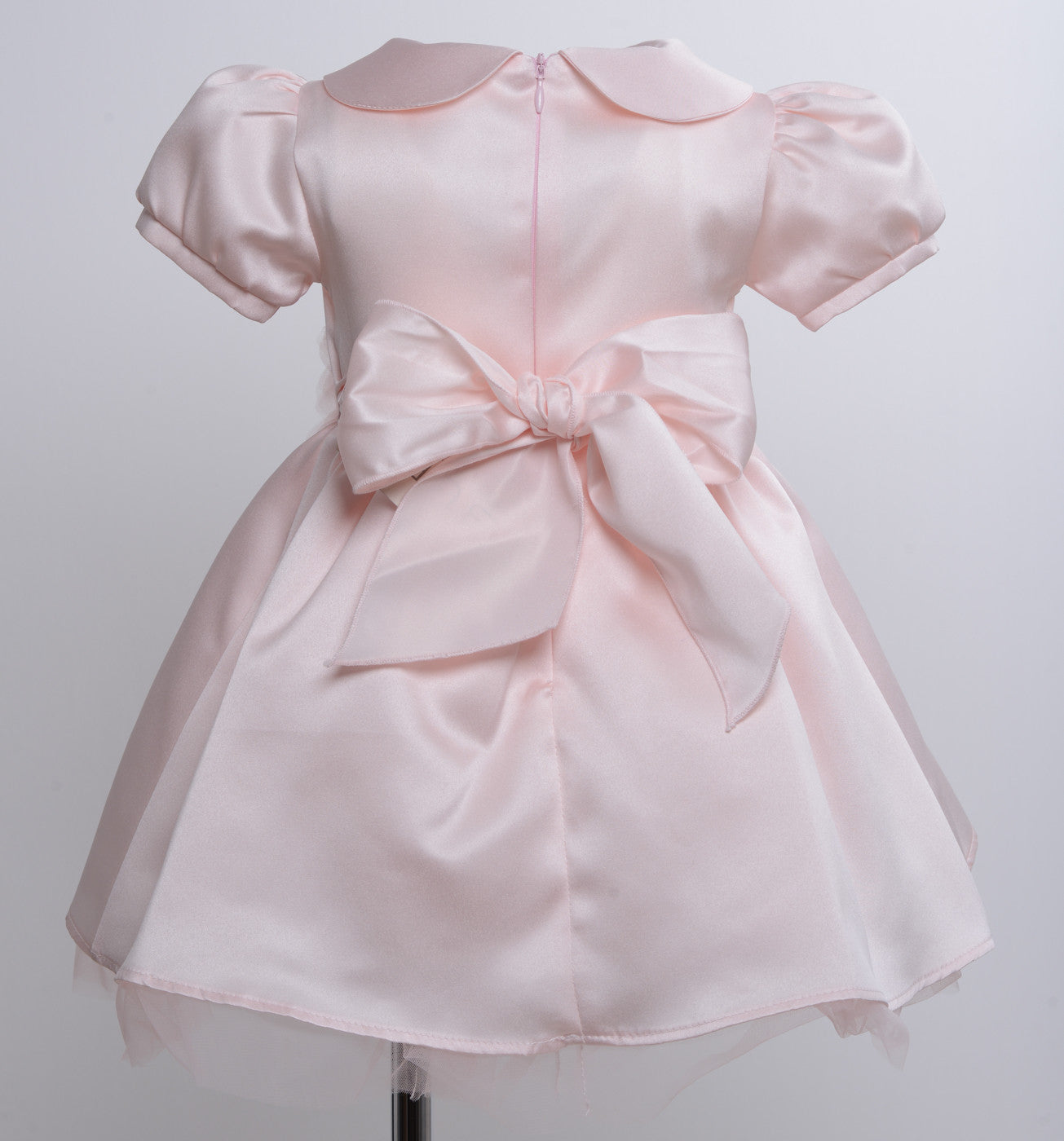 Elegant dress for ceremony in satin with short balloon sleeves, round collar with bow, belt at the waist with tulle flowers, bow on the back and zip for opening and closing.