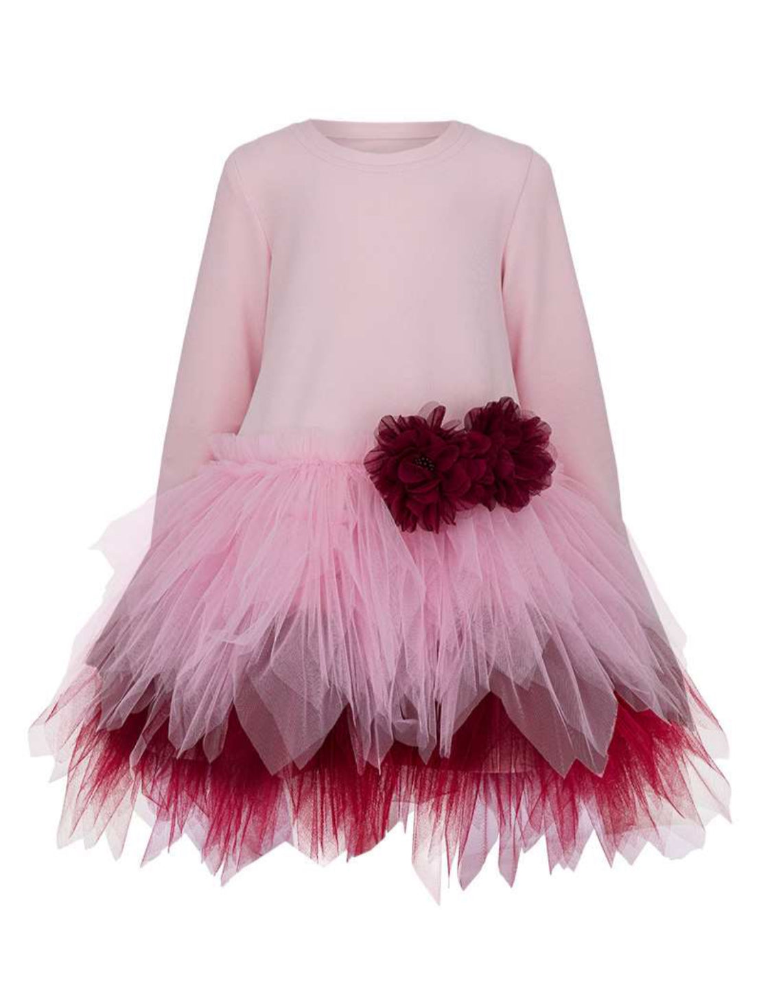 Questo elegante abito per bambina unisce un corpetto in maglia confortevole a una gonna in tulle sfumata, impreziosita da delicati fiori applicati in vita. Perfetto per occasioni casual e di tendenza, offre uno stile raffinato senza rinunciare alla comodità.