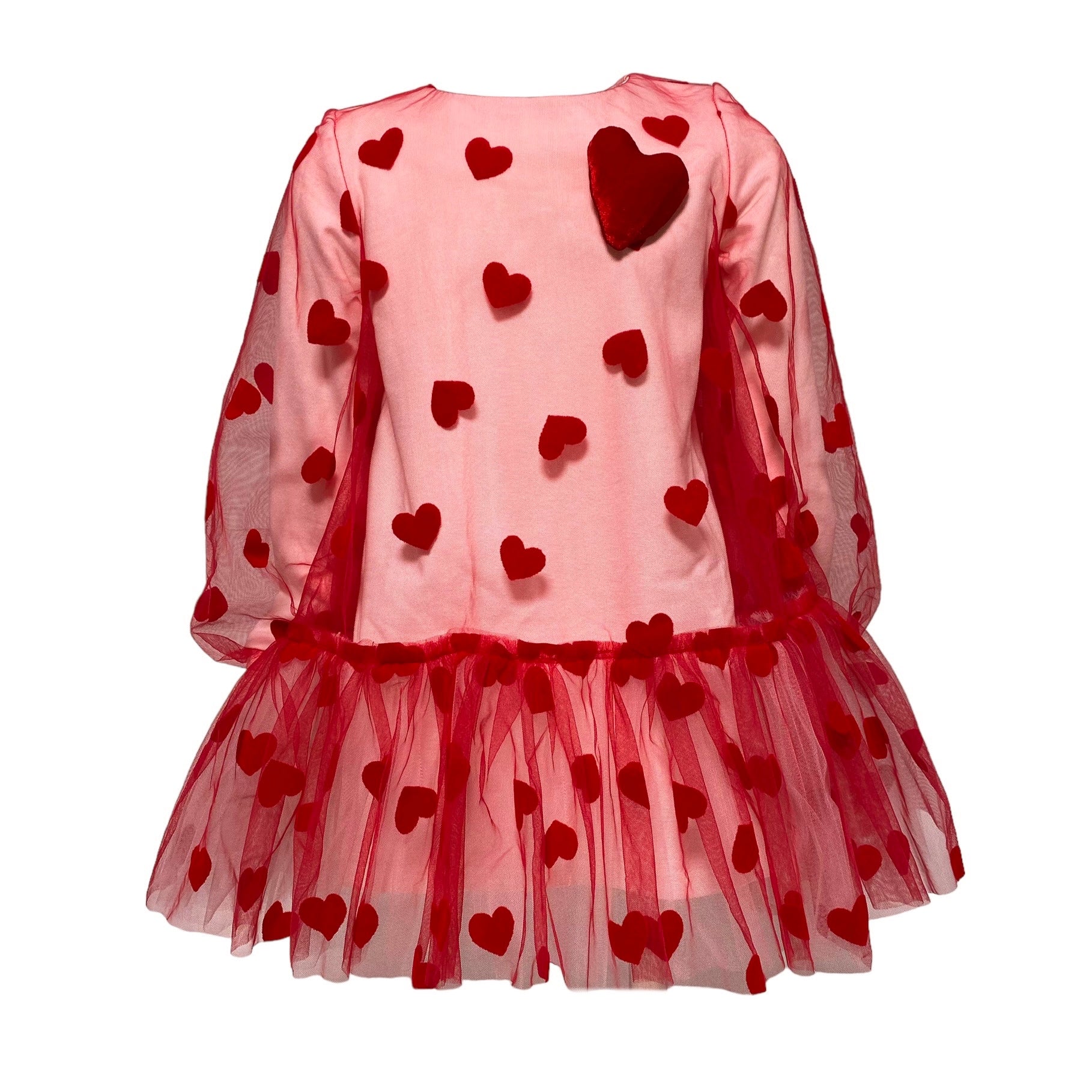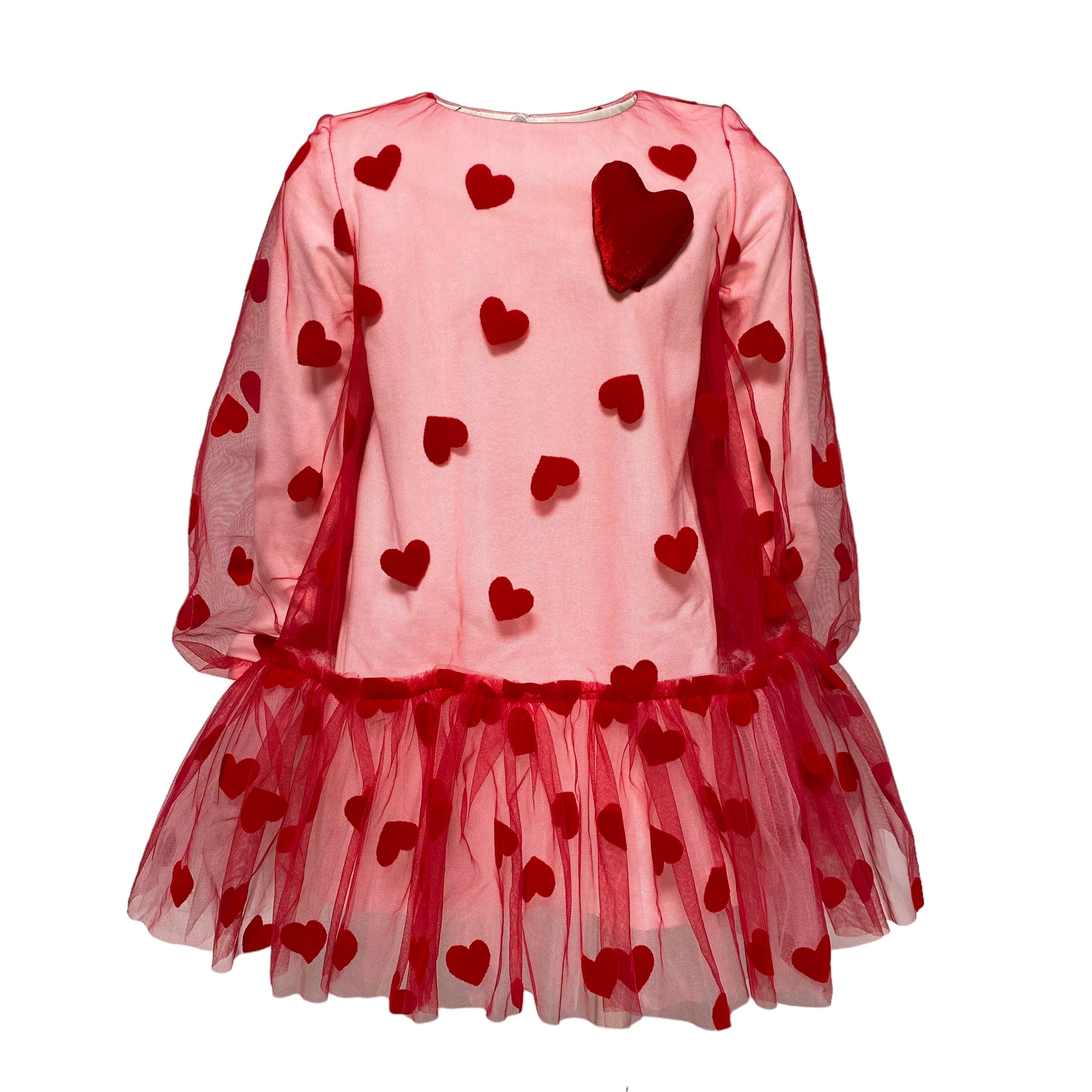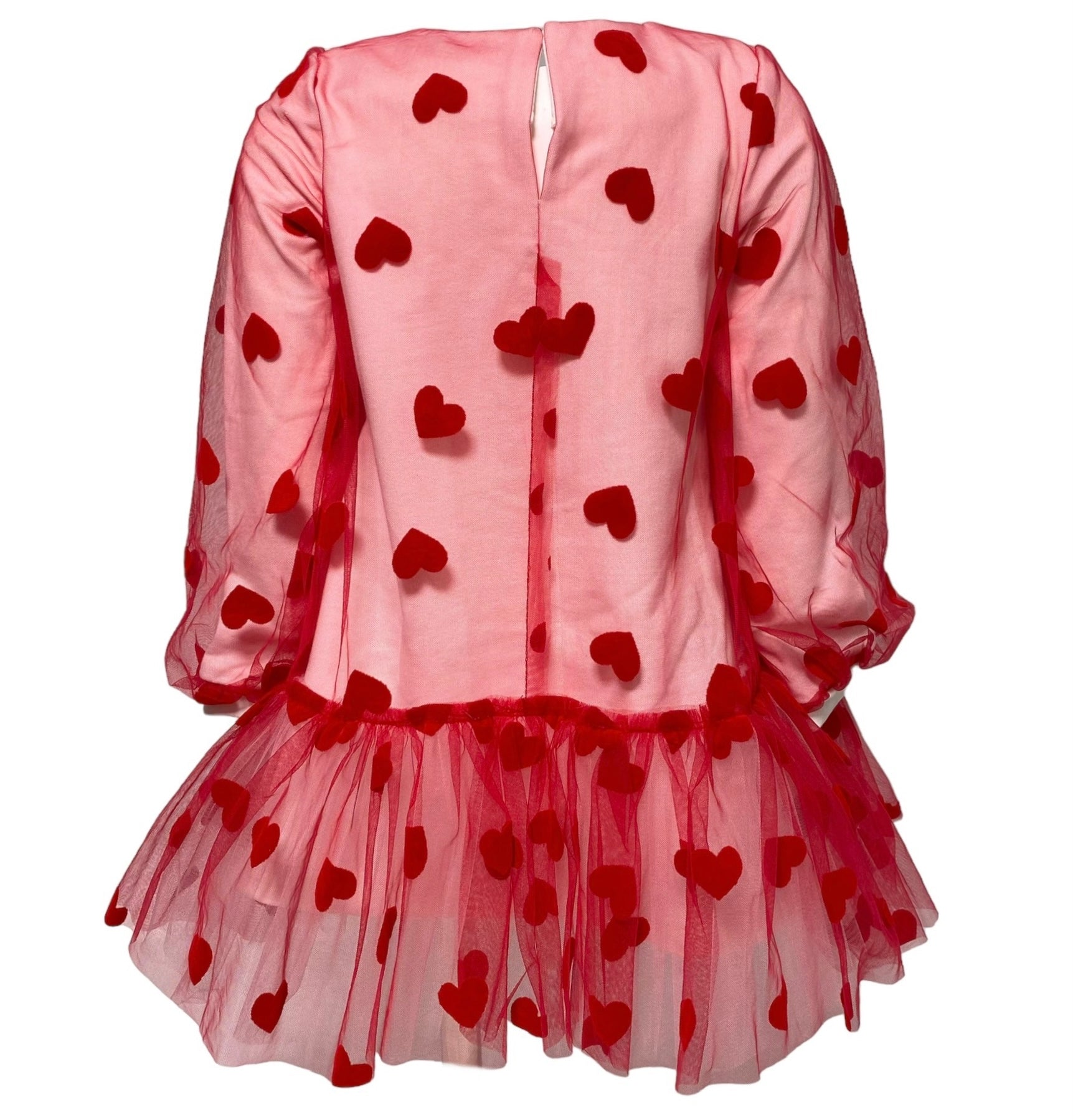Abito elegante manica lunga in felpa e tulle, con cuori in velluto.