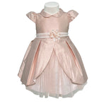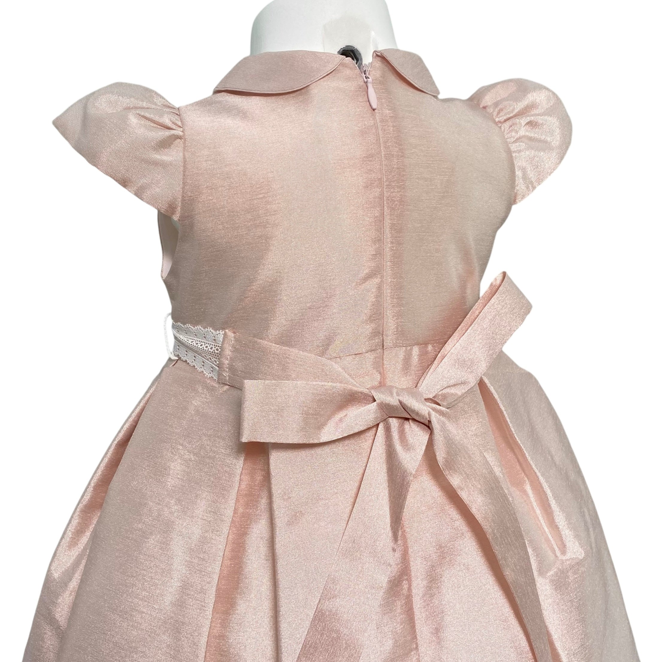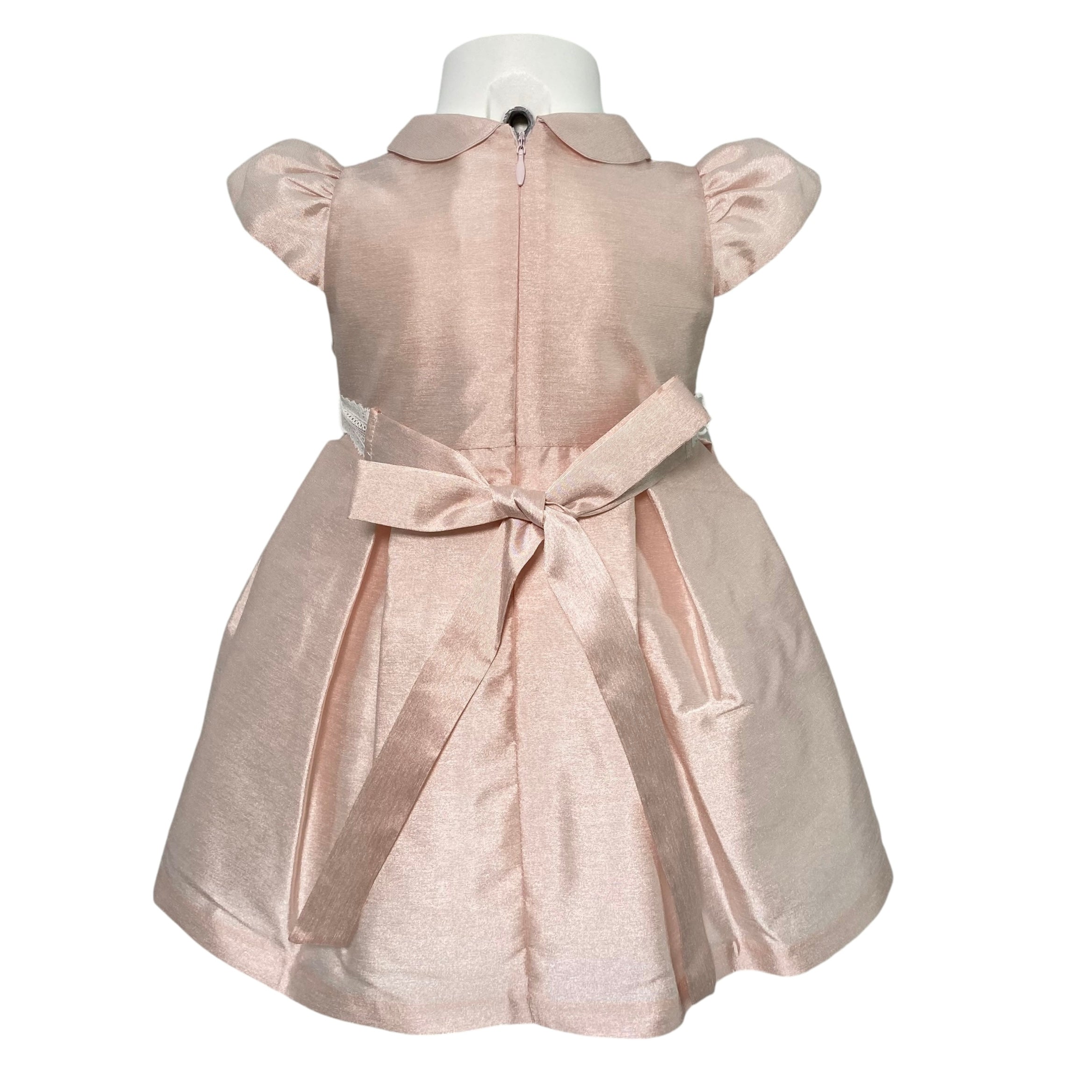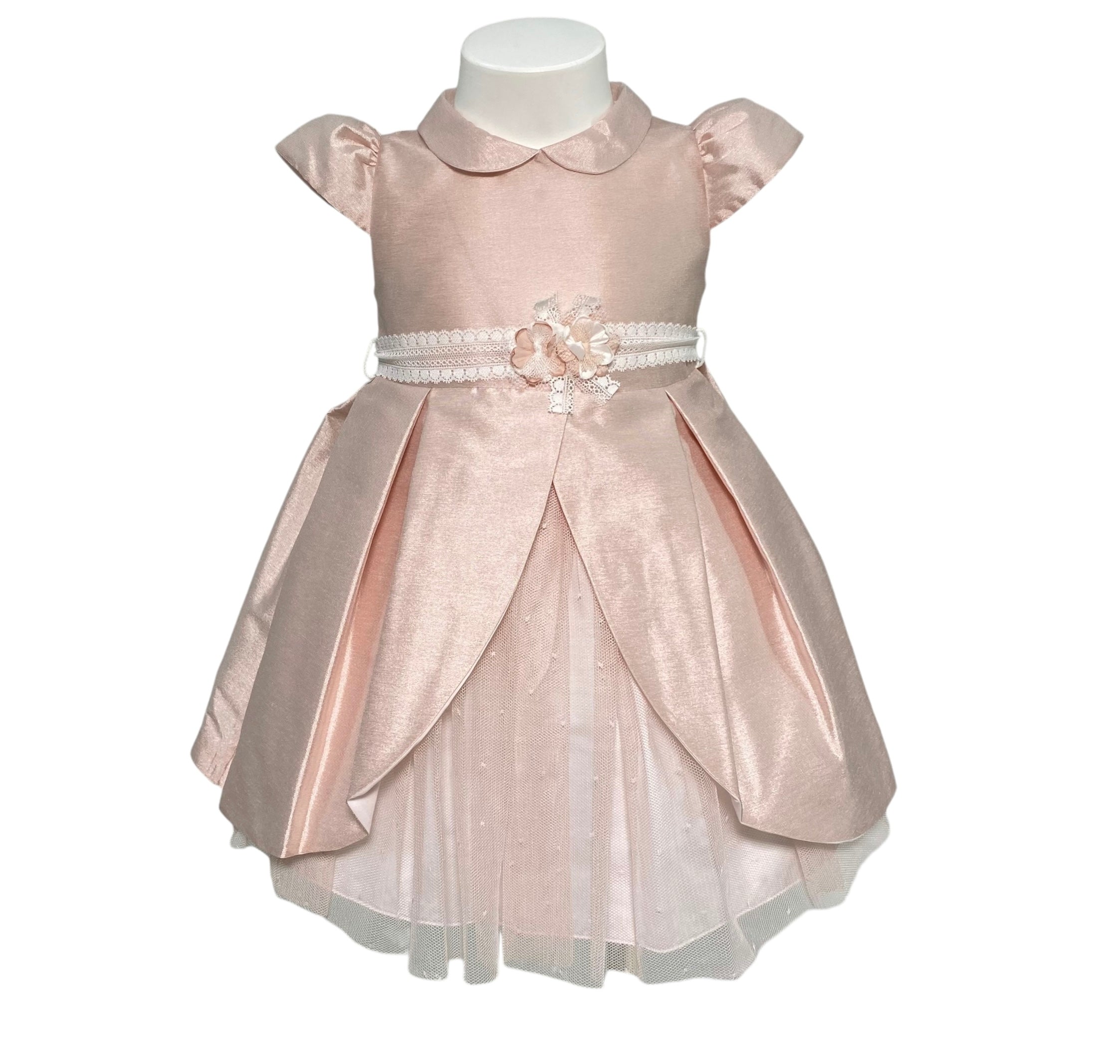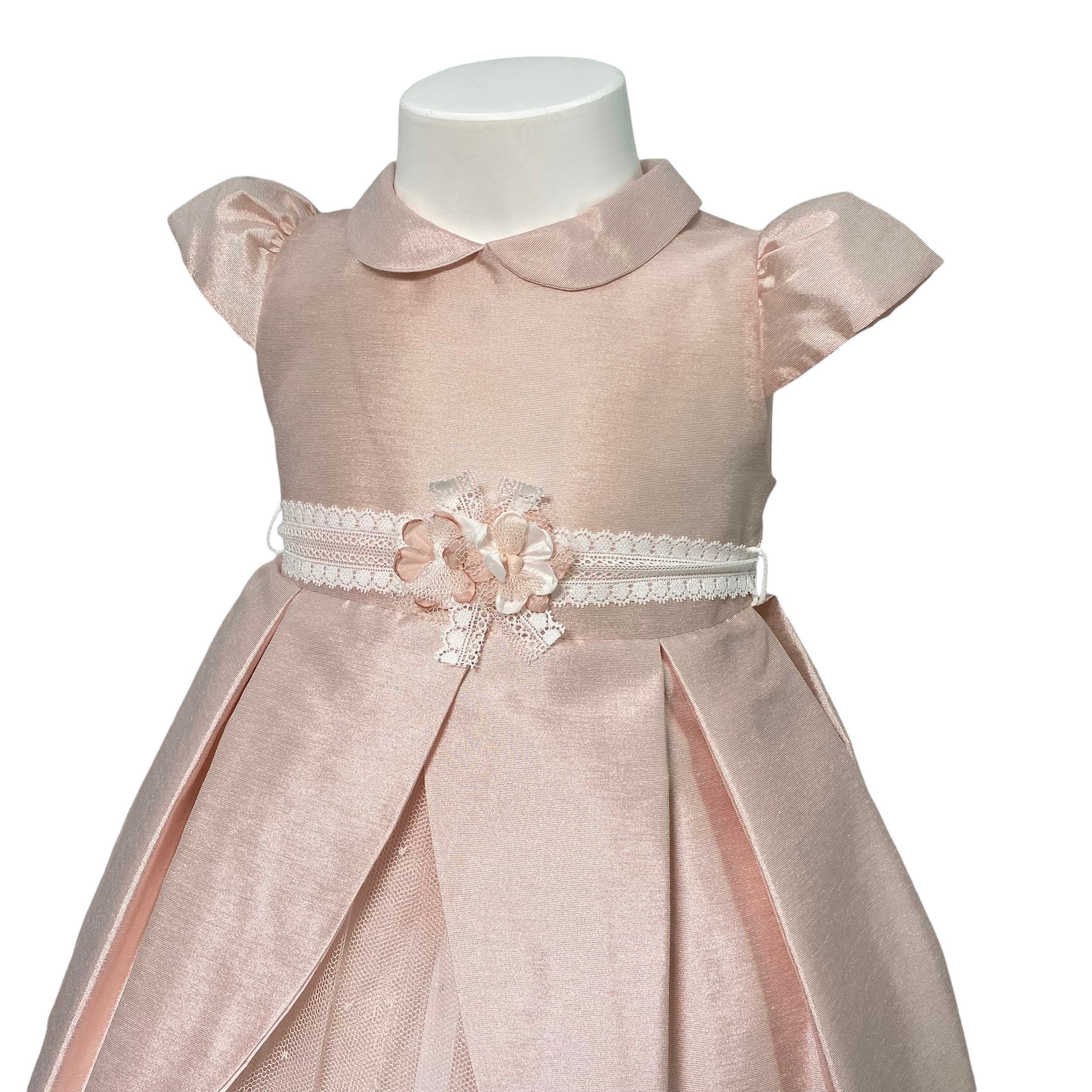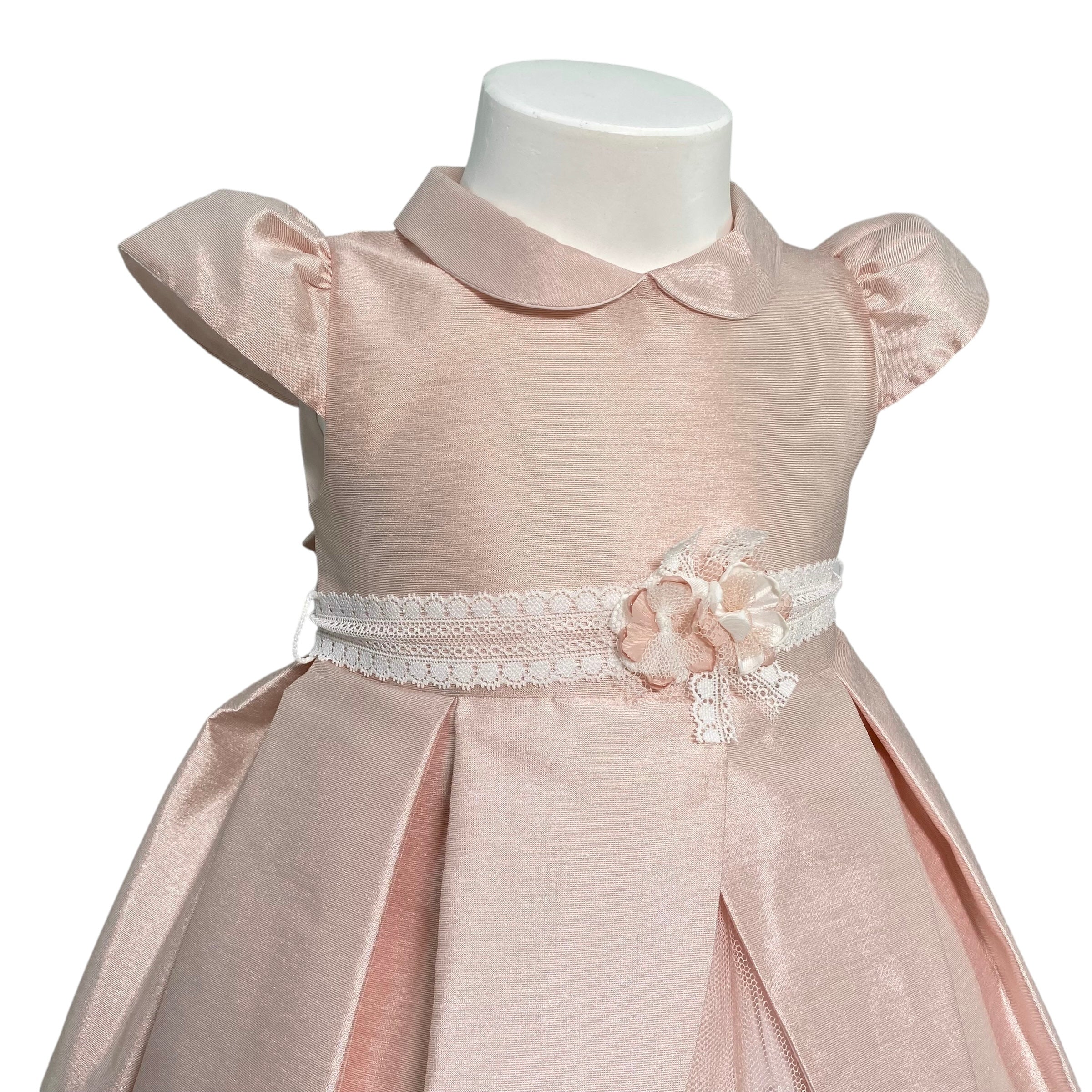 Questo elegante abito per neonate è perfetto per occasioni speciali come il battesimo. Interamente realizzato in shantung di seta, è impreziosito da una fascia bianca in pizzo in vita con applicazione di fiori. La chiusura posteriore con zip invisibile lo rende ancora più raffinato. Sii la più elegante in ogni occasione.