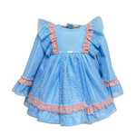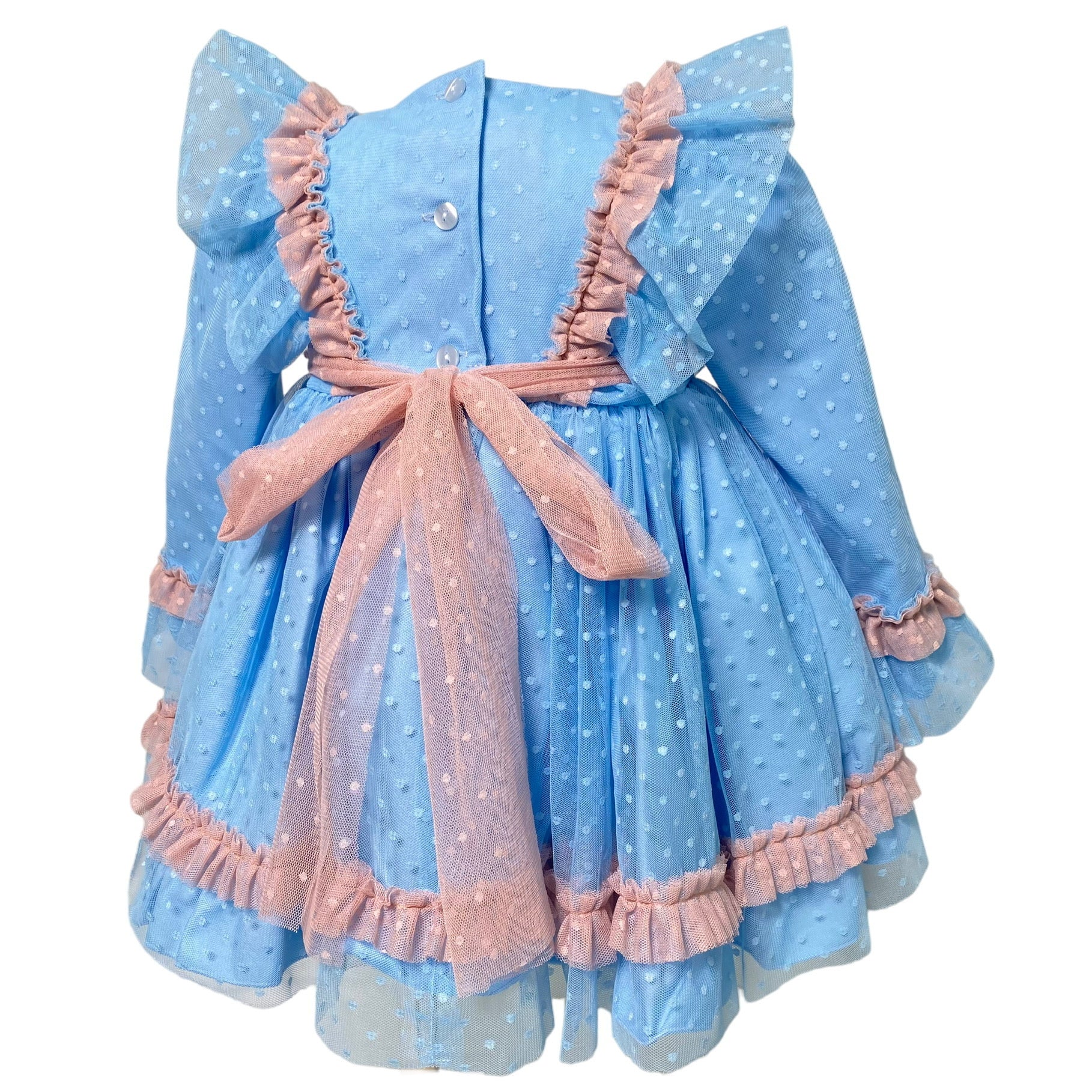 Abito manica lunga elegante svasato, in tulle a poise, con rouches sulle spalle.