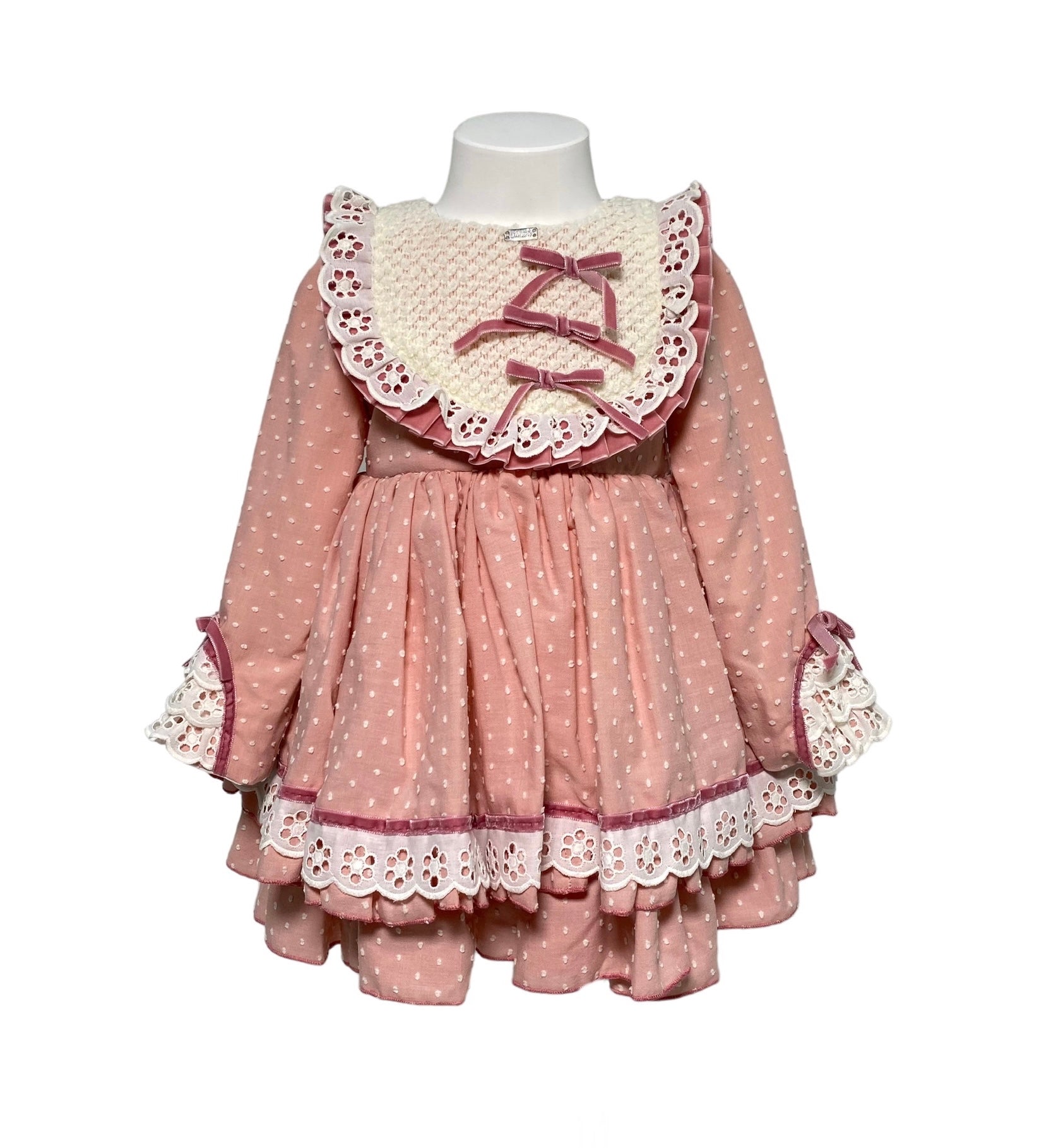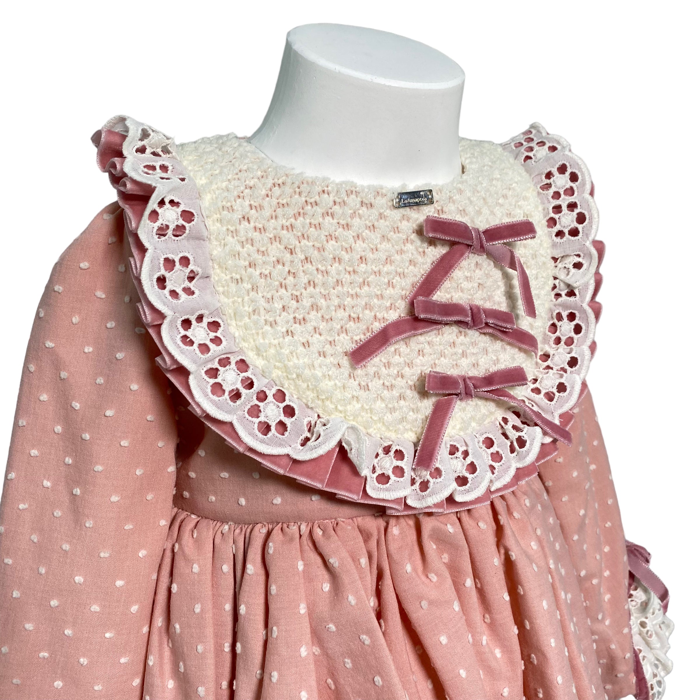 Abito elegante svasato manica lunga, in caldo cotone plumetis, con rouches sul petto e fiocco in velluto rosa sul retro.