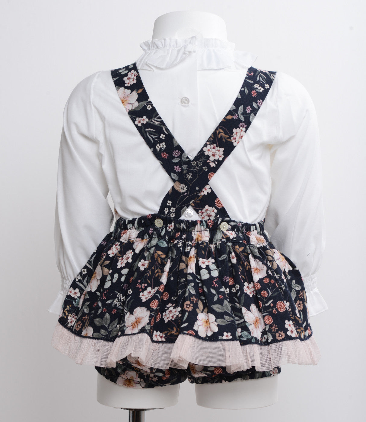 Floral dress with suspenders and culottes with elastic, long-sleeved shirt with rouge at the neck and back closure.