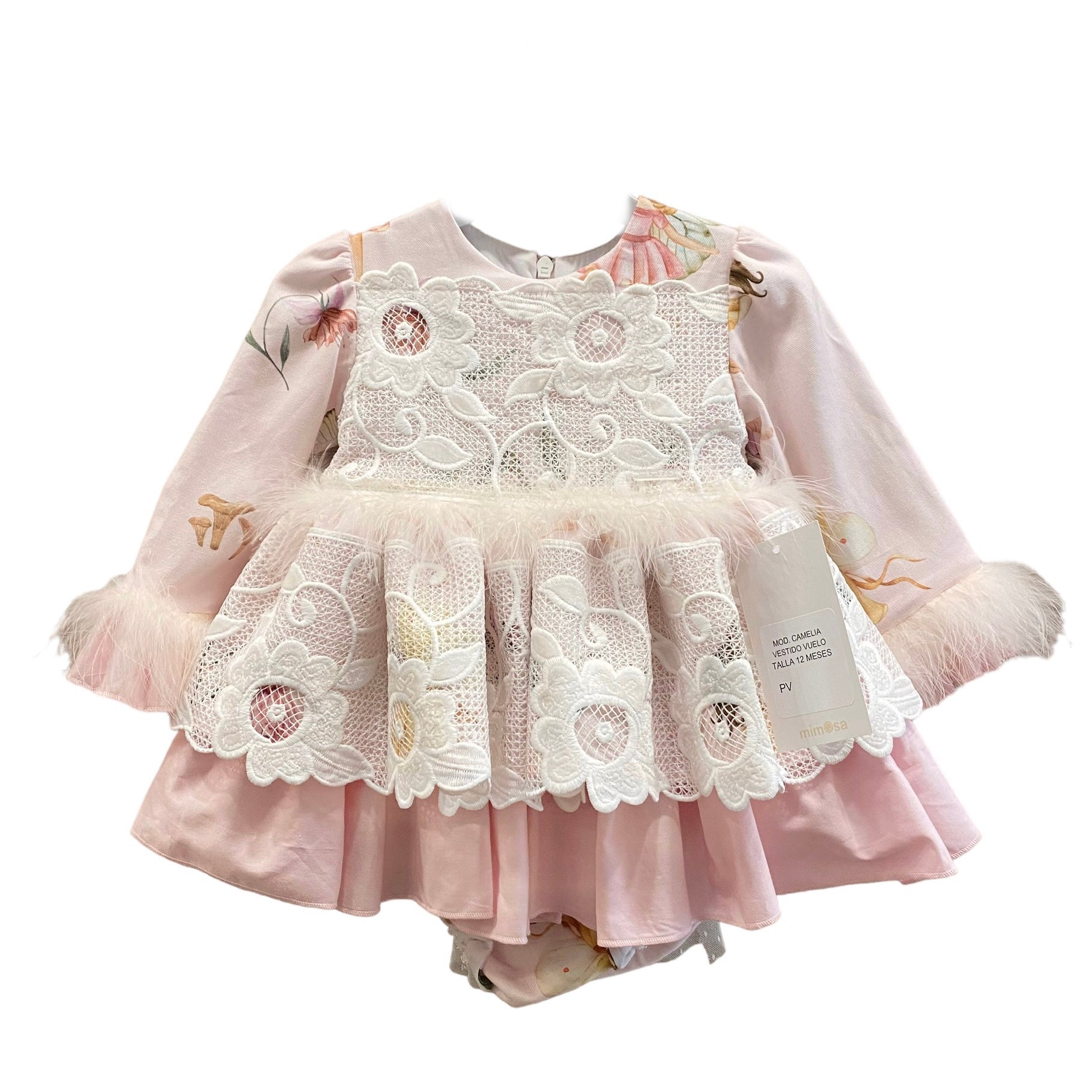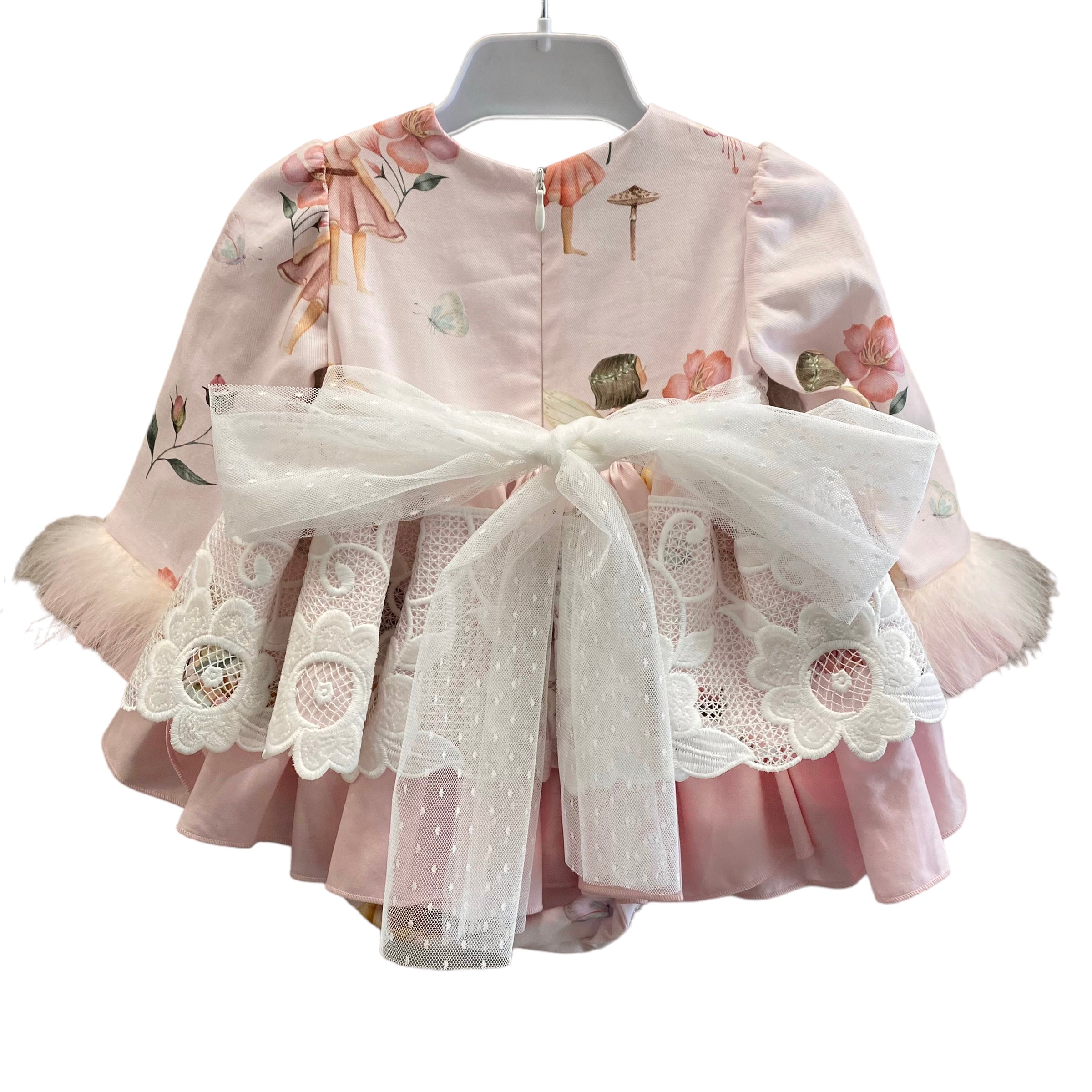 Abito dallo stile romantico in caldo cotone manica lunga con stampa di fatine e dettagli in pizzo sul corpetto e sulla gonna ,sul retro nastro in tulle bianco con possibilità di fare il fiocco .